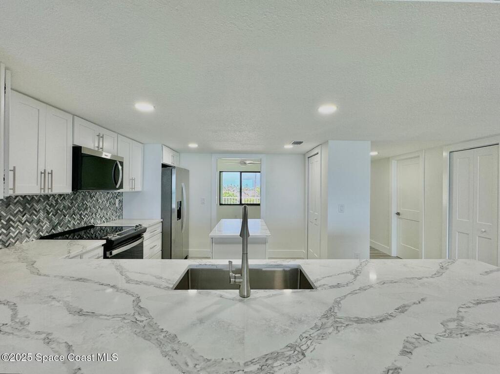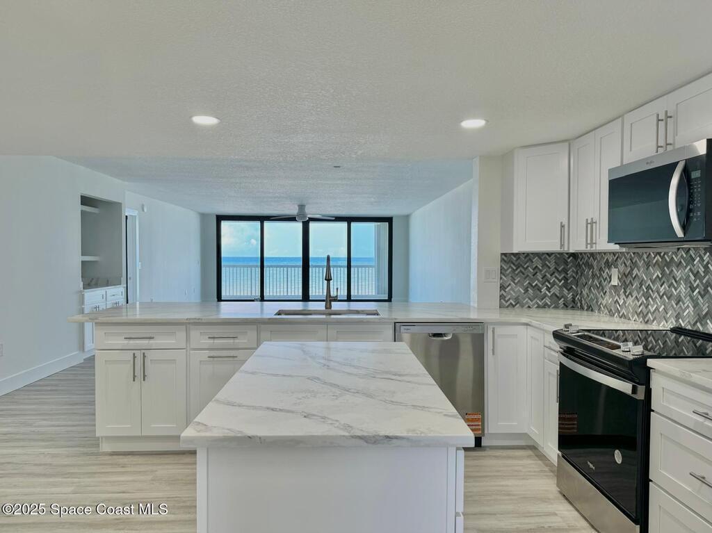 COMPLETELY & PROFESSIONALLY RENOVATED - 3rd FLOOR UNIT- DIRECT OCEAN VIEW (no obstruction) at The Horizon Condo - Seller just had it professionally redone in 2025. Features: All new hurricane impact windows/doors (Also has double protection with accordion shutters), New LVP flooring throughout unit with tile floors in bathrooms, Quartz countertops, New whirlpool stainless steel appliance package, Textured ceilings, New ceiling fans, Coastal trim baseboards & casing, White shaker cabinets in kitchen & bathrooms, Beautiful tiled showers with accent inlays, New interior doors, New electrical outlets & switches, Newly painted interior with a soft neutral tone, Large balcony overlooking the Atlantic Ocean, (dunes have been nicely redone below this unit offering a cleaner view), Condo has community pool & its own secured beach access, new elevator just installed, 1 Car garage, 3rd room can be an office or a closet can be added for bedroom.