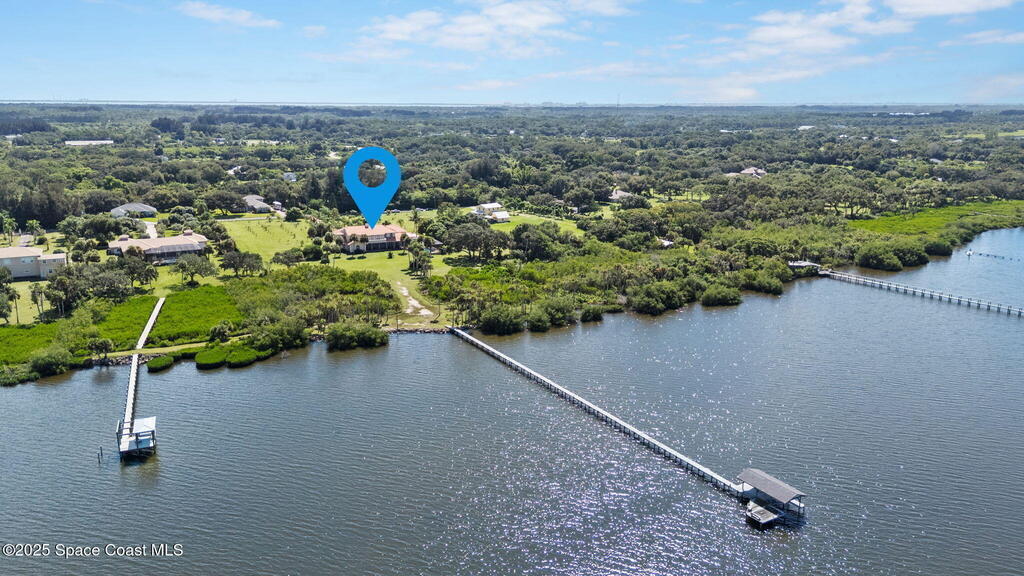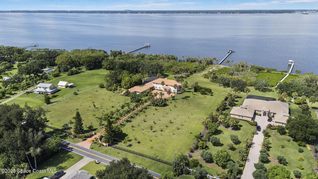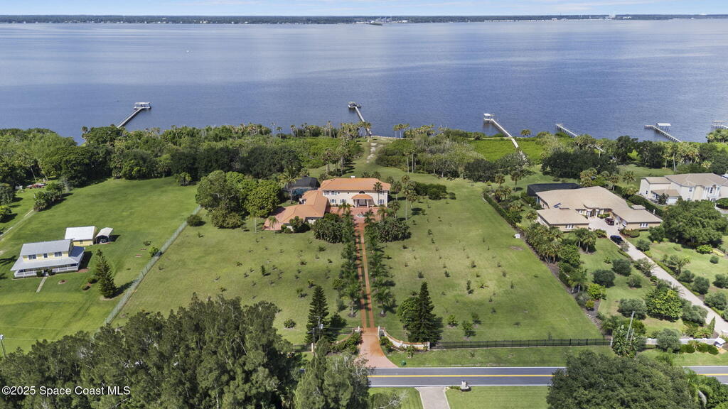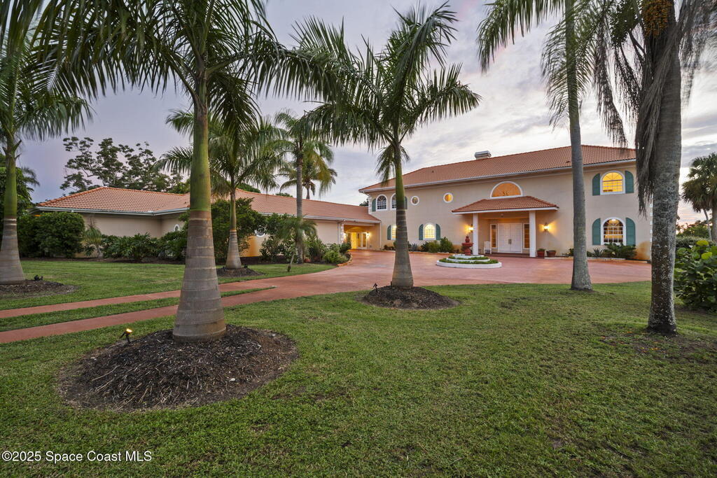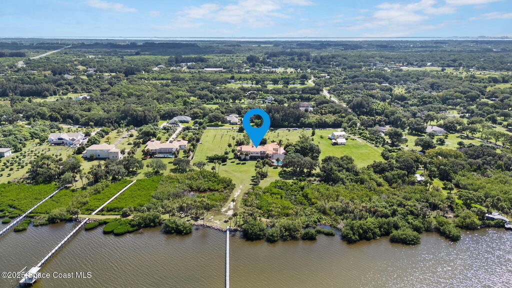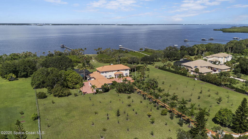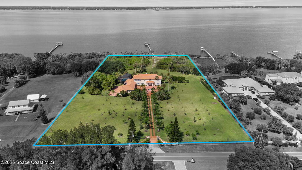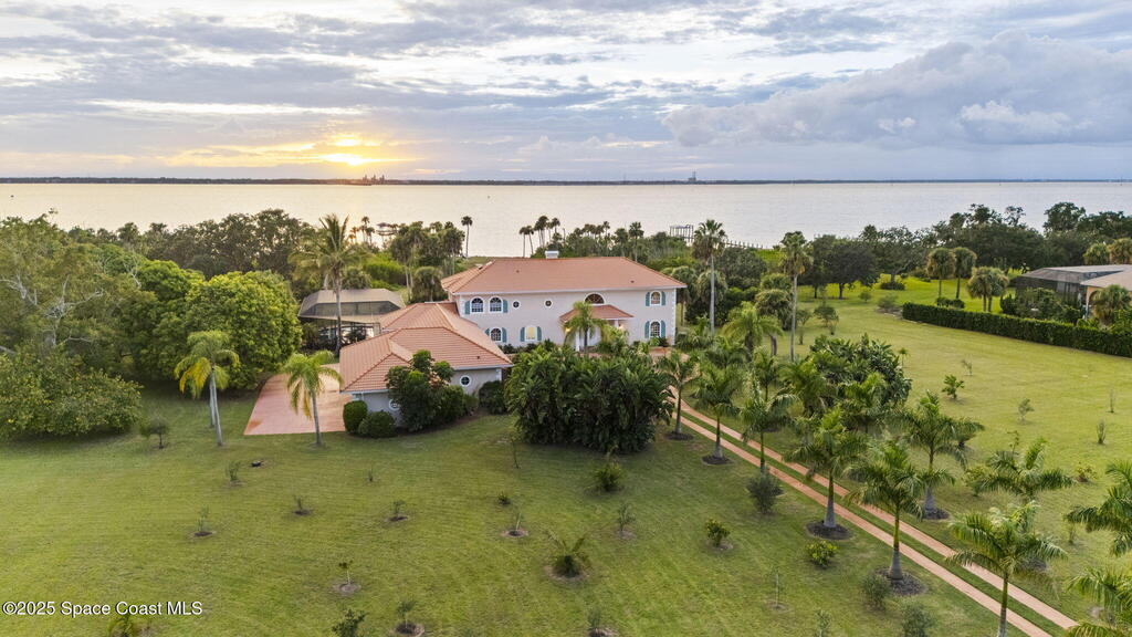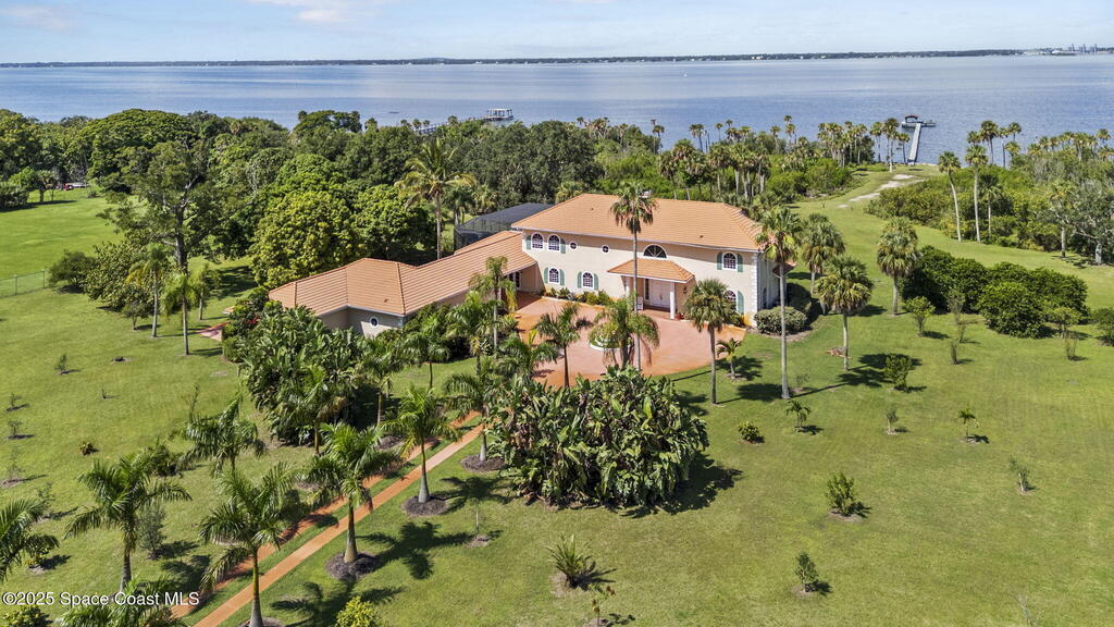 A rare opportunity on the N Tropical Trail, this estate sits on 7.06 acres directly on the Indian River and offers a staggering 6,686 square feet of living space. Designed to combine everyday living with exceptional entertaining spaces including a massive covered breezeway, 4-car garage with entertainment room, a large executive office, and a custom bar. The gated palm lined driveway with fountain makes a statement as you arrive, while inside, the primary suite offers a resort-style bathroom, oversized closet, and a private balcony overlooking the river and expansive grounds. The kitchen is fully equipped with high-end appliances and abundant space for cooking and gathering. The outdoor living is just as impressive, featuring a screened pool and spa, summer kitchen, private dock with covered boat lift, and panoramic sunset views that are second to none. With its unique combination of acreage, privacy, and waterfront lifestyle, this estate is truly one-of-a-kind on the Space Coast.