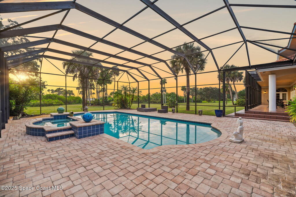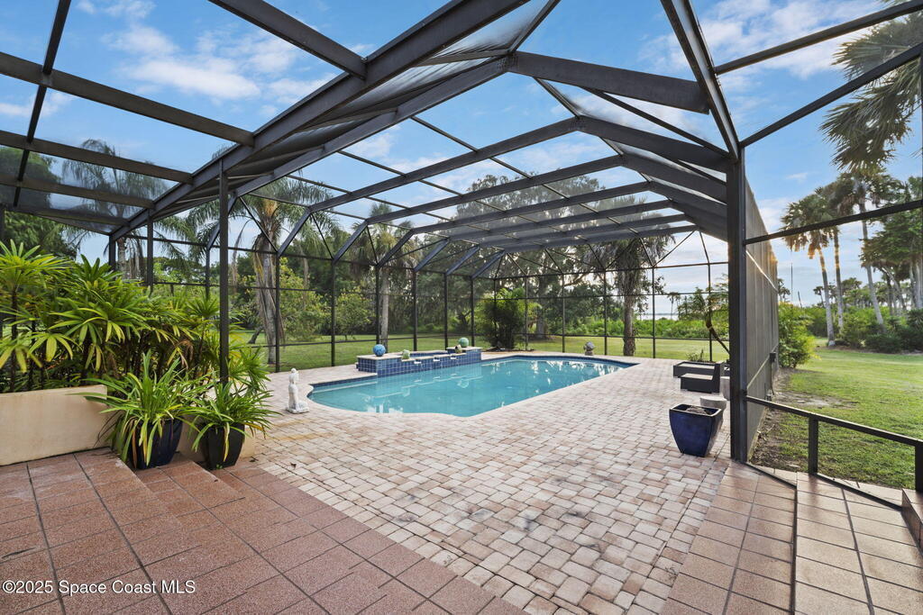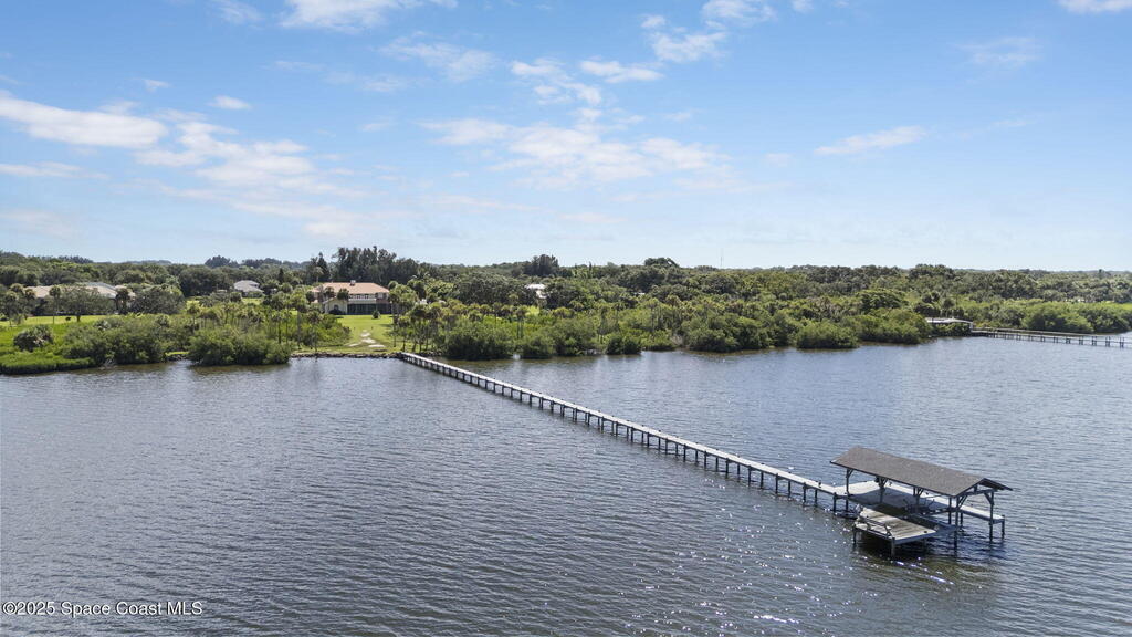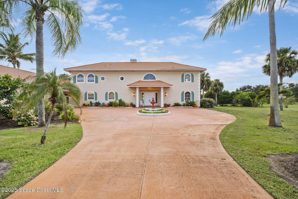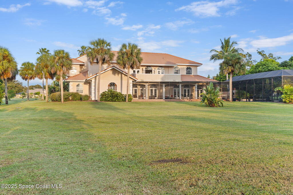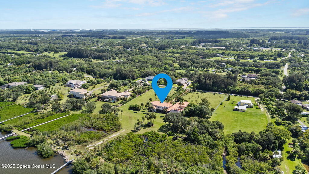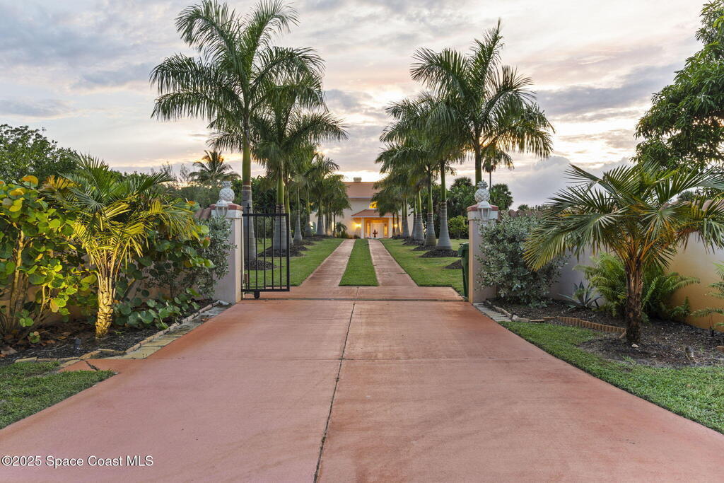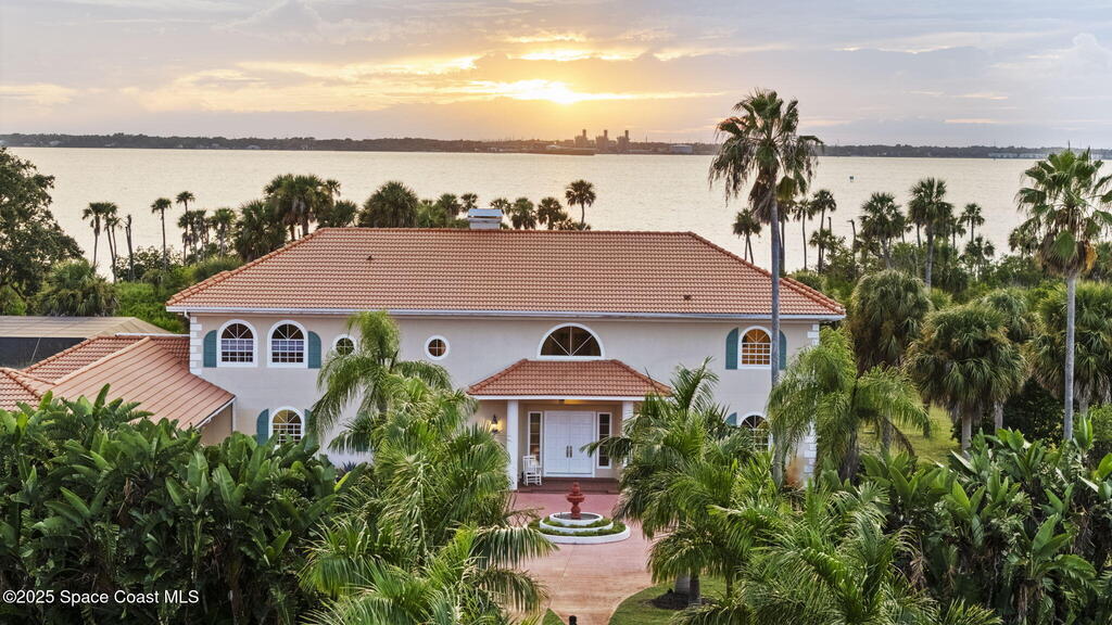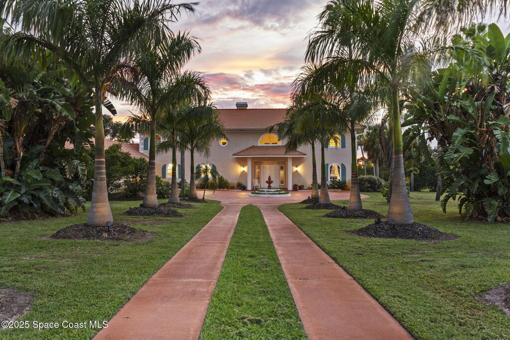 A rare opportunity on the N Tropical Trail, this estate sits on 7.06 acres directly on the Indian River and offers a staggering 6,686 square feet of living space. Designed to combine everyday living with exceptional entertaining spaces including a massive covered breezeway, 4-car garage with entertainment room, a large executive office, and a custom bar. The gated palm lined driveway with fountain makes a statement as you arrive, while inside, the primary suite offers a resort-style bathroom, oversized closet, and a private balcony overlooking the river and expansive grounds. The kitchen is fully equipped with high-end appliances and abundant space for cooking and gathering. The outdoor living is just as impressive, featuring a screened pool and spa, summer kitchen, private dock with covered boat lift, and panoramic sunset views that are second to none. With its unique combination of acreage, privacy, and waterfront lifestyle, this estate is truly one-of-a-kind on the Space Coast.