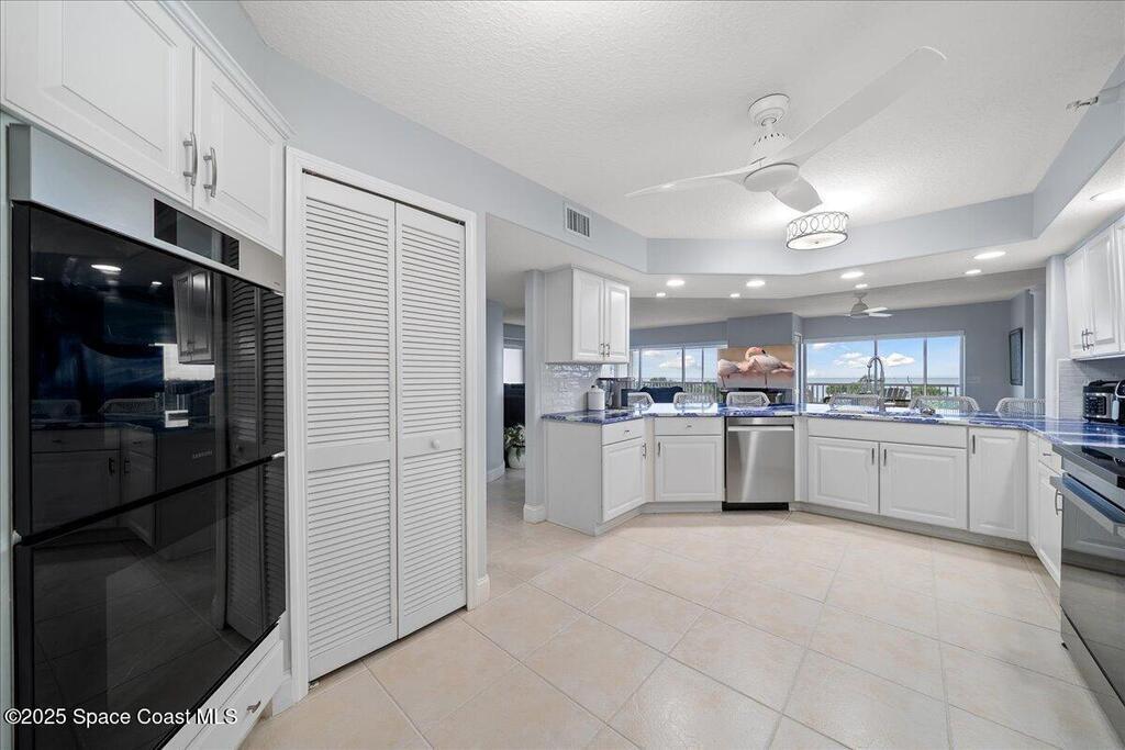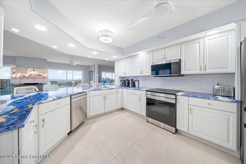 RENOVATED PENTHOUSE - MOVE-IN READY! First 6 months HOA paid by seller! Only penthouse at gated Bayside Condos! 4,100+ sq ft, originally 2 units combined. JUST COMPLETED: brand new appliances, Cambria quartz counters throughout, custom electric blinds, 2 tankless water heaters, new fixtures/lighting/fans, carpet, paint, custom closets & shower enclosures. 4 bedrooms (2 primary waterfront) + 3 flex rooms. Wraparound screened balcony + west balcony with spectacular sunsets over Manatee Sanctuary & port views! Chef kitchen, 3 ovens, wet bar. 2 garage spaces, storage, clubhouse/pool. Minutes from Port Canaveral. Furniture negotiable. Turnkey luxury!