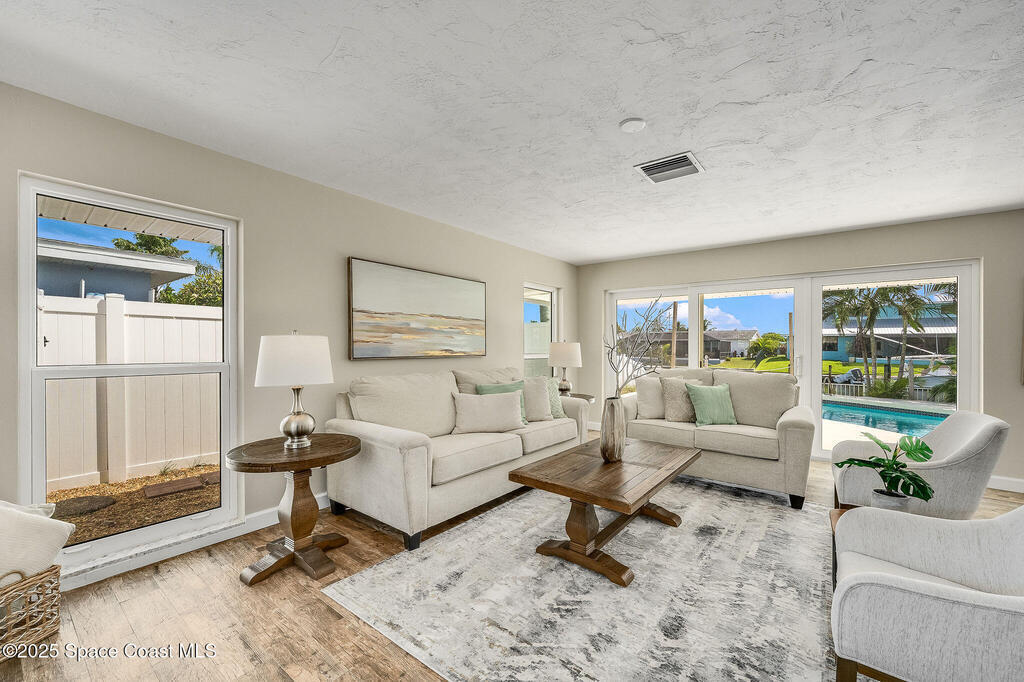 Experience coastal elegance in this stunning sanctuary. Nestled on a deep-water, wide, canal, this waterfront retreat offers breathtaking views, sunsets and direct boating access to the Banana and Indian Rivers. The backyard oasis features a sparkling pool with serene water vistas, perfect for relaxing or entertaining. Inside, an open concept design flows seamlessly through the kitchen, living, and dining areas, all capturing panoramic water views. A spacious 19x17 bonus room offers endless possibilities--ideal for a home office, gym, or additional bedroom that could also be turned back into a two car garage. The luxurious primary suite provides a private waterfront escape with an elegant en-suite bath. Peace of mind is ensured with all hurricane impact windows and sliders installed recently. Embrace Florida's coastal lifestyle at its finest in this exceptional residence. Roof 2014, windows and sliders 2023, deck, dock addition and seawall 2007.