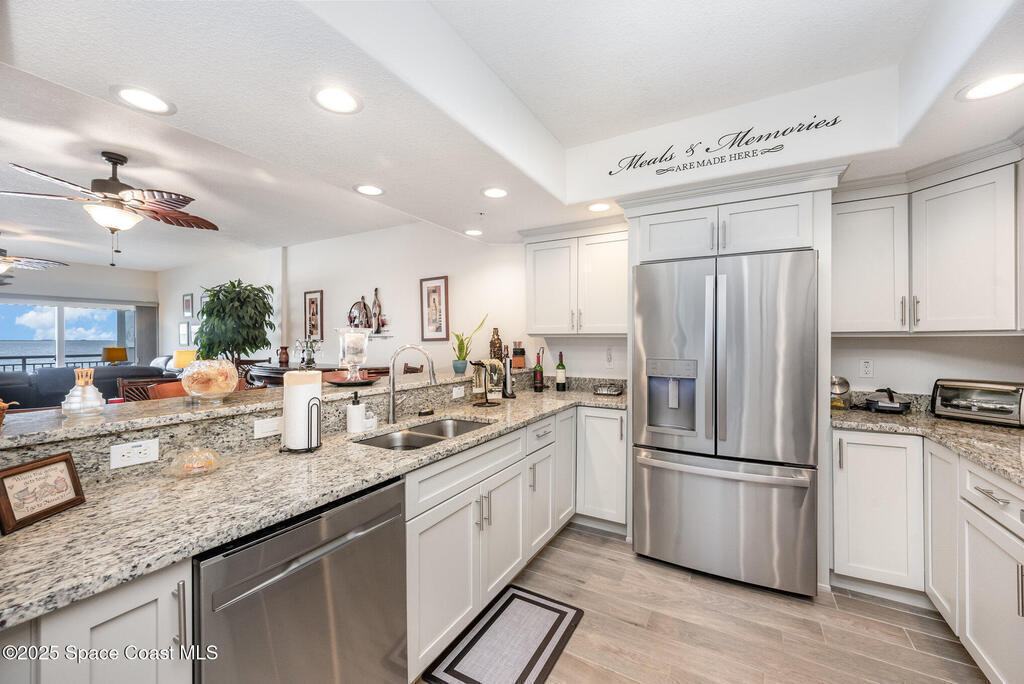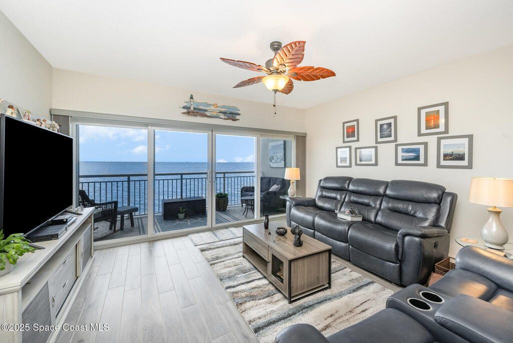Welcome to River Palms unit 202, a stunning waterfront condo in Titusville offering breathtaking space launches and waterfront views! This meticulously maintained 3 bedroom 2 full bath unit features high-end stainless steel appliances, sleek granite countertops, and a large breakfast bar/island. Enjoy premium adjustable shades to enhance your panoramic water views and elegant plantation shutters throughout. With upgraded interior selections, in-unit laundry with washer and dryer included, this condo is perfect for full-time living, an investment property, or a vacation retreat. Under building assigned space, separately purchased personal garage, and exterior lot spot all included. Located just minutes from Orlando, Kennedy Space Center, the theme parks, and the beaches, you'll have it all at your doorstep. Come take a look...Don't miss this opportunity to own a piece of paradise!