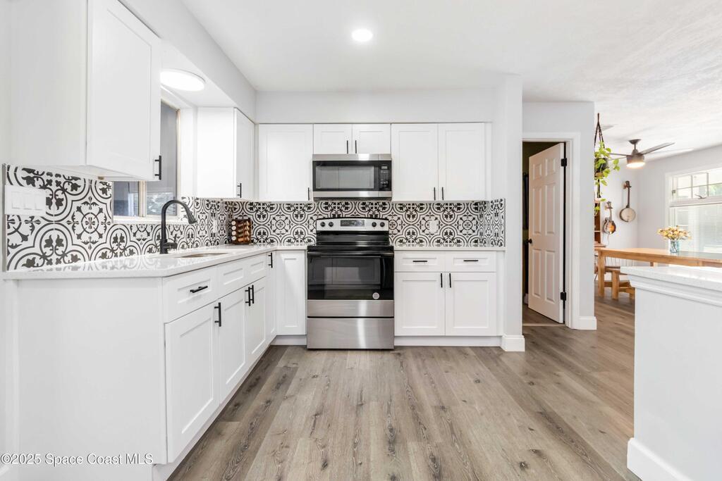 Welcome home! This charming, move-in ready home situated on a quiet street is fully renovated, offering comfortable living with thoughtful upgrades throughout. The interior features luxury vinyl plank flooring throughout & a stylish kitchen with quartz countertops, tile backsplash, stainless steel appliances & modern finishes. The primary suite includes a private bath with tiled walk-in shower. Light & bright living room, just off the kitchen, provides a spacious living space - perfect for relaxing, entertaining, or enjoying hobbies. Supply lines were replaced with PVC. Water heater was replaced in 2023. Roof was replaced in 2021. AC was replaced in 2016. Conveniently located near shopping, dining, Merritt Island Airport, 15 min to beach, 25 min to Kennedy Space Center, NASA, SpaceX, Blue Origin, 45 min to Orlando airport & area attractions! No HOA, so feel free to bring your boat or RV! Call today, this one won't last long!