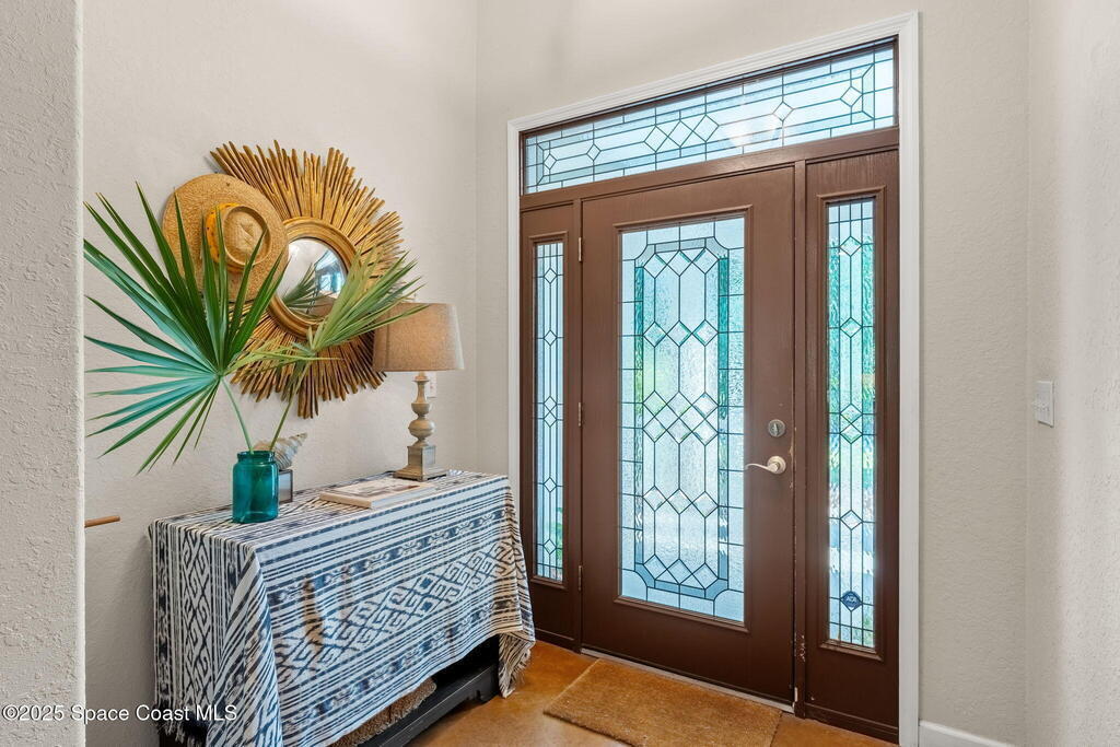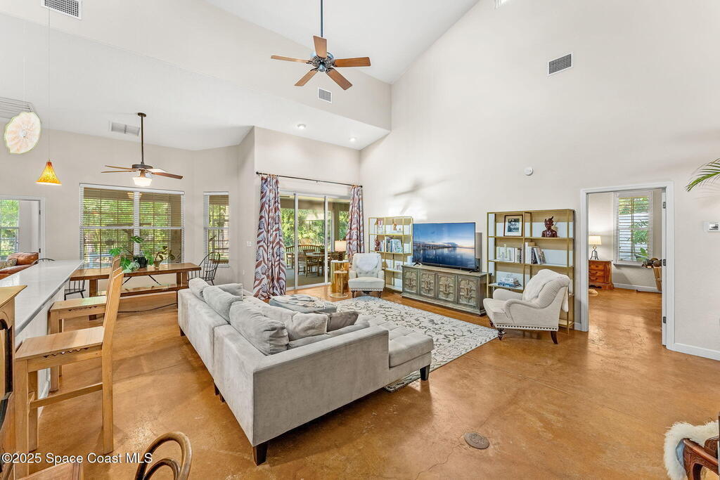 Your Florida homestead dream lives here. Architect designed and centered on a private one acre lot. This Merritt Island residence blends utility and style. 3,707 sq. ft. with 4 bedrooms, 3 baths, office, bonus game room and a 3 car garage. Durable painted concrete floors and a cook friendly corian kitchen with custom solid oak cabinetry. Outdoor living with a screened lanai and a wraparound porch under a metal roof. Practical upgrades include hurricane shutters, a whole house vacuum, a whole house attic fan, solar panels, and 50 amp service for your RV, EV, or tools. The orchard steals the show with mango, dragon fruit, avocados, and limes. Minutes to beaches, shops, and schools yet tucked away. All information deemed reliable but not guaranteed; buyer to verify.