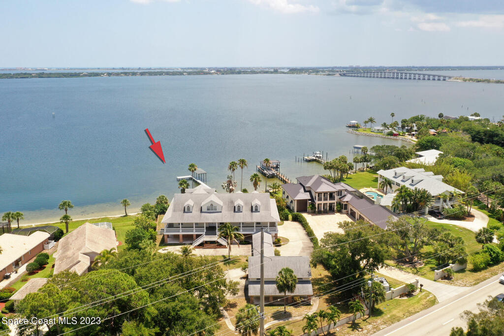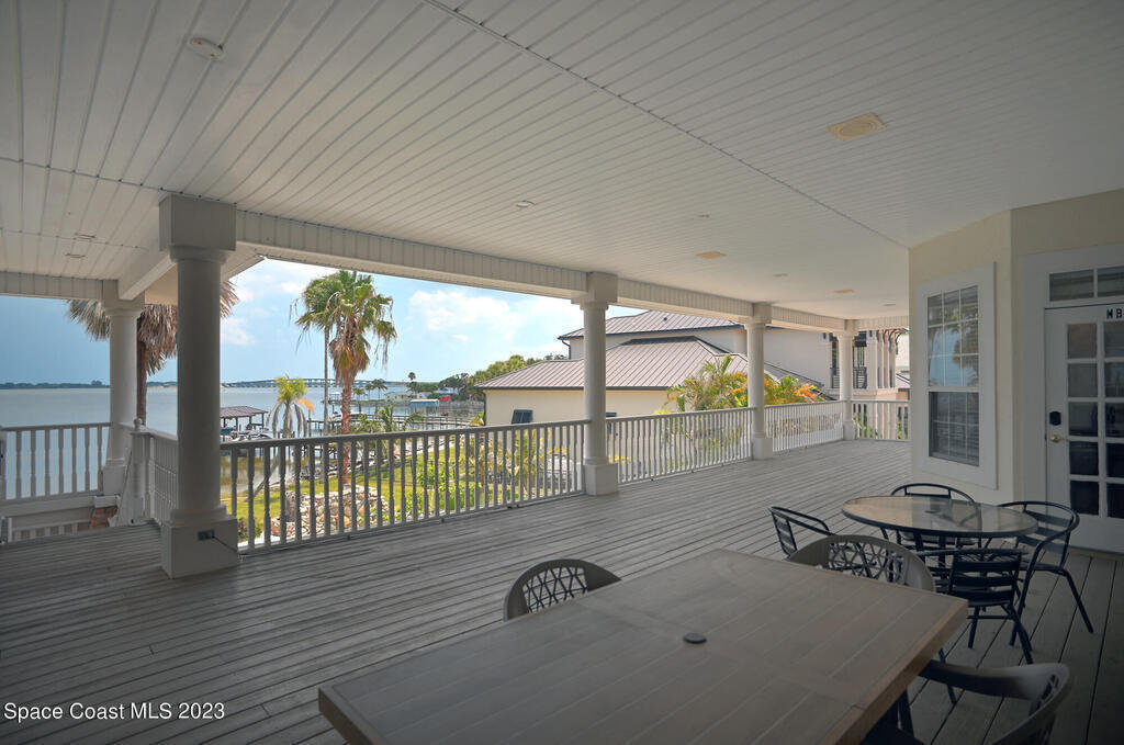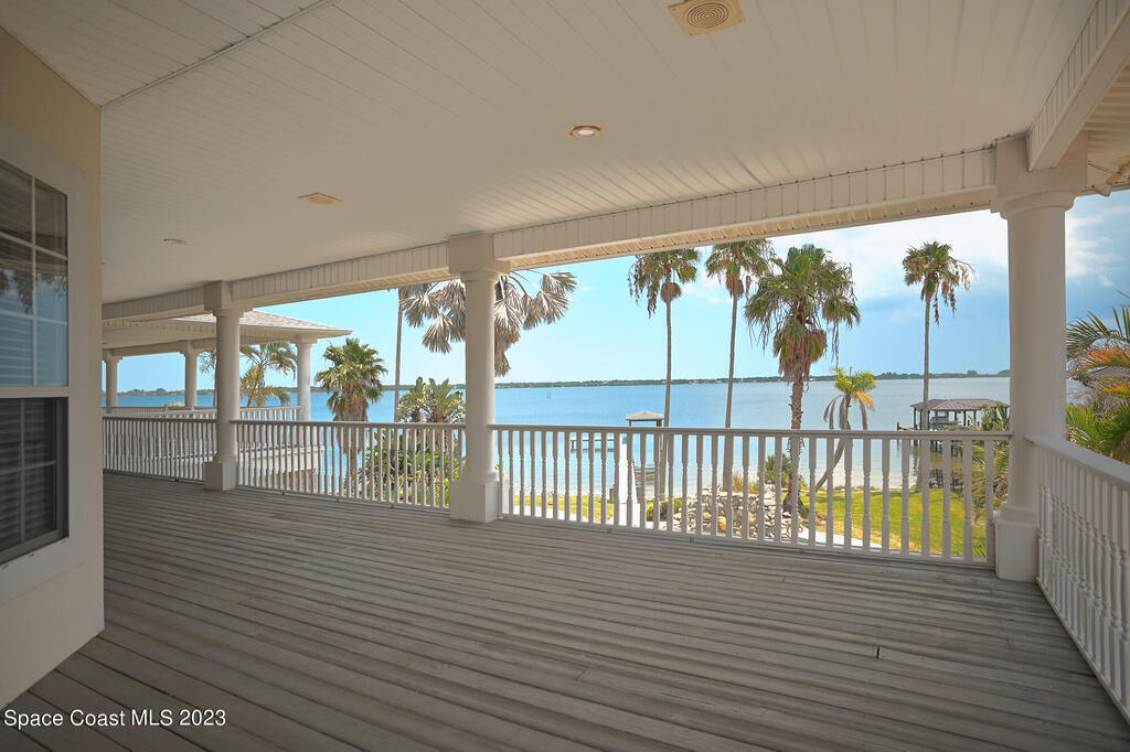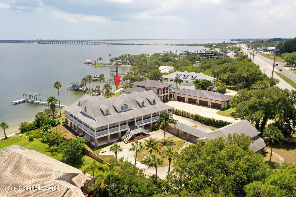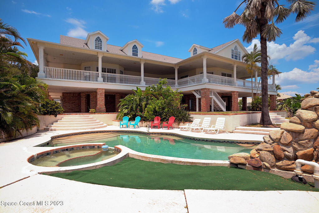 Discover the ultimate waterfront estate on the Indian River, blending luxury and versatility across three stories. Expansive 8-bedroom, 7-bath home features 2 private suites on the first floor w/ multiple kitchens, perfect for multi-generational living or entertaining. Grand great room and gourmet kitchen with massive island flood the space with natural light + river views. Solid oak cabinetry and floors. New roof 2016, New dock 2019. 3 New A/Cs in 2021. Primary suite boasts a large bathtub + separate shower, while the 3rd floor offers 3,000 sq ft of customizable space--ideal for a primary retreat or office. A wrap-around balcony provides breathtaking vistas and seamless indoor-outdoor living. Situated on over an acre w/ 135 ft of river front. Enjoy outdoor kitchens, a heated pool, and ample parking in the attached and detached garages. Conveniently located near beaches, I-95, Patrick Space Force Base, Viera shops and fine dining.