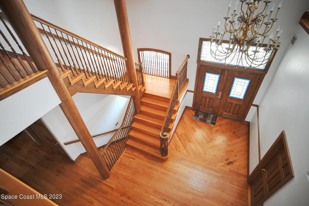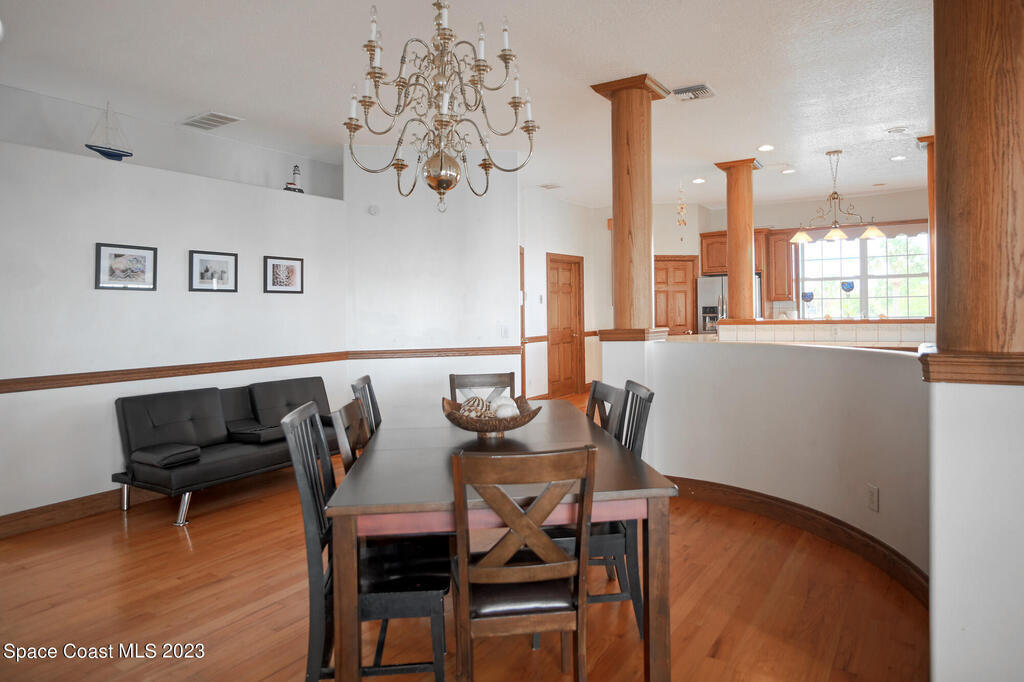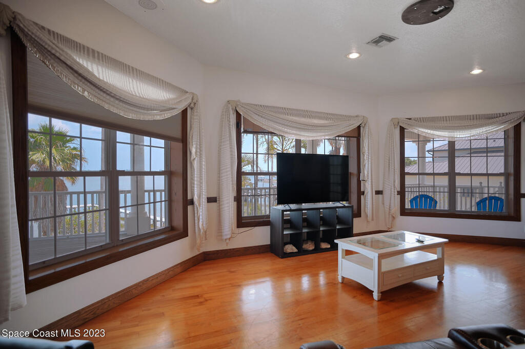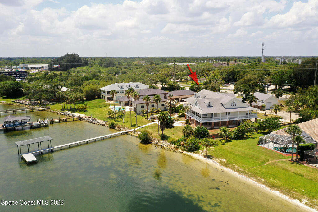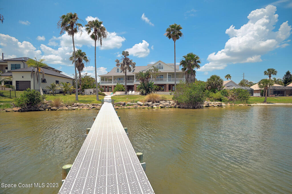 Discover the ultimate waterfront estate on the Indian River, blending luxury and versatility across three stories. Expansive 8-bedroom, 7-bath home features 2 private suites on the first floor w/ multiple kitchens, perfect for multi-generational living or entertaining. Grand great room and gourmet kitchen with massive island flood the space with natural light + river views. Solid oak cabinetry and floors. New roof 2016, New dock 2019. 3 New A/Cs in 2021. Primary suite boasts a large bathtub + separate shower, while the 3rd floor offers 3,000 sq ft of customizable space--ideal for a primary retreat or office. A wrap-around balcony provides breathtaking vistas and seamless indoor-outdoor living. Situated on over an acre w/ 135 ft of river front. Enjoy outdoor kitchens, a heated pool, and ample parking in the attached and detached garages. Conveniently located near beaches, I-95, Patrick Space Force Base, Viera shops and fine dining.