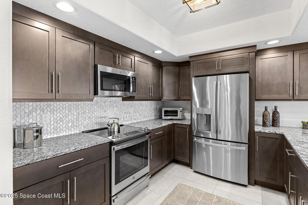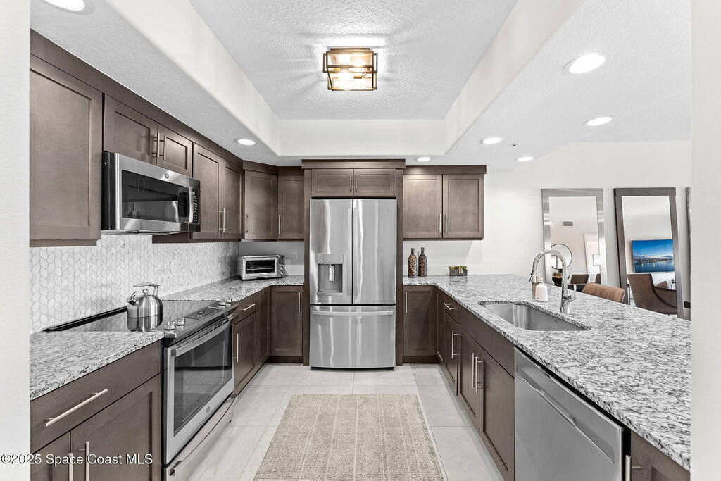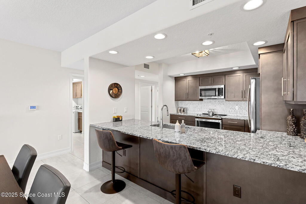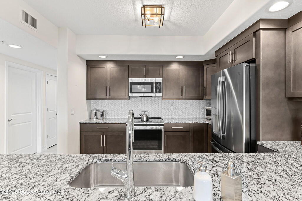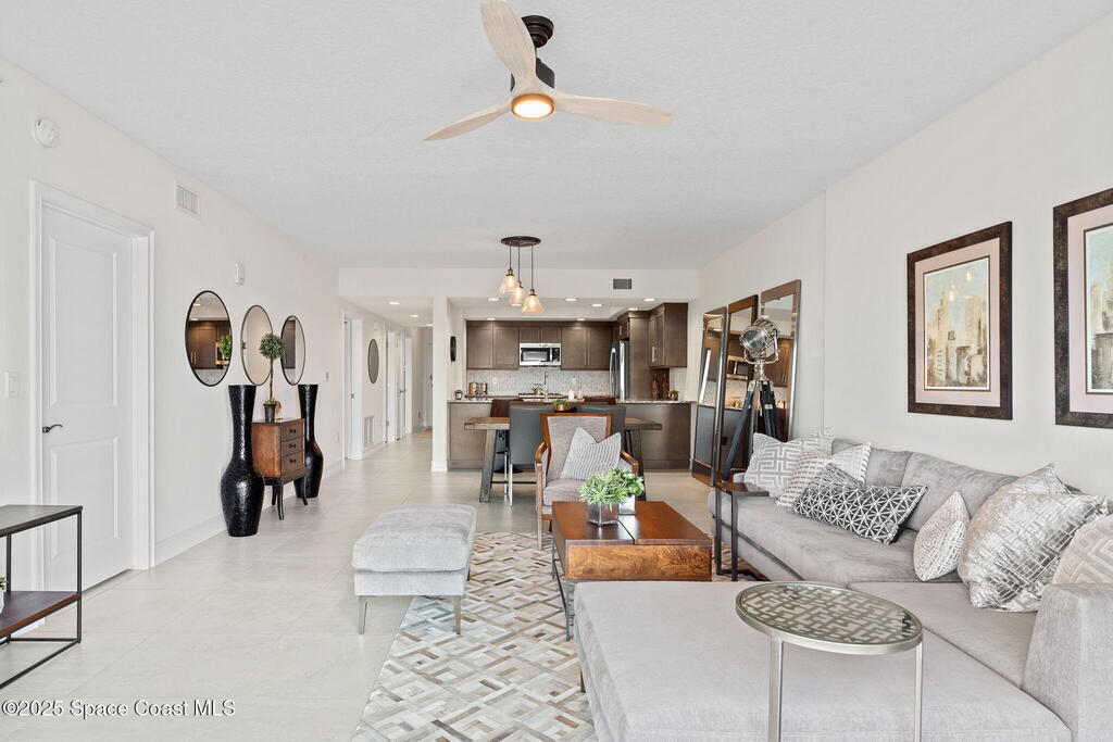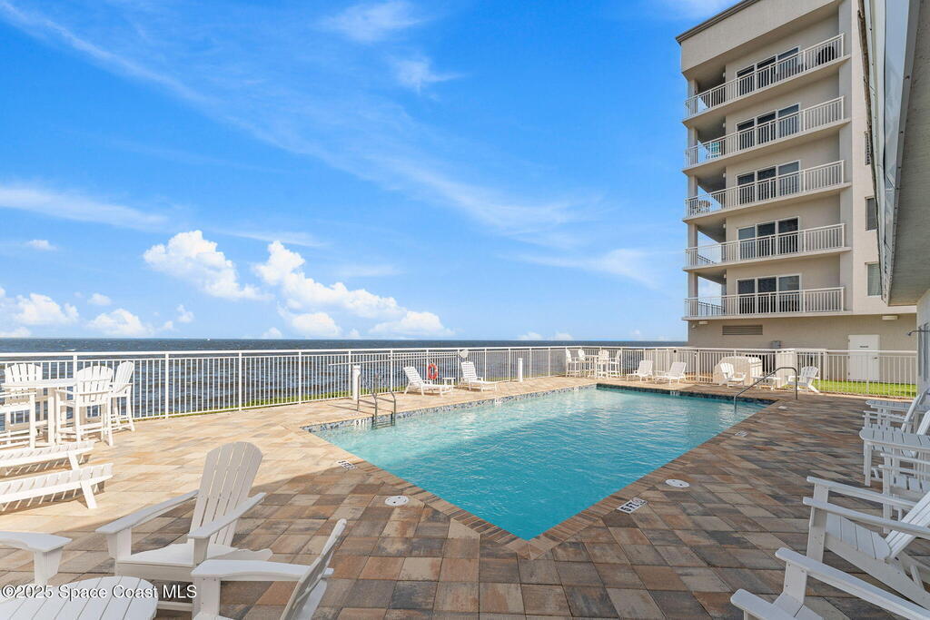 Luxury River Palms Riverfront Community on Florida's prestigious Space Coast in Titusville! Exquisite furnished Waterfront condo with breathtaking sunrises above the Indian River and views to spectacular rocket launches, and dolphins and manatees playing right beneath your balcony. Features gourmet kitchen with premium cabinetry and fixtures, oversized countertops, marble mosaic and high-end appliances. Upgraded bathrooms and laundry include designer cabinets, sinks and fixtures. Offered furnished with exquisite taste, featuring interiors from Ethan Allen, Scan Design, West Elm, Pottery Barn, CB2, and Tempur-Pedic. Includes two covered parking spaces (#11 indoor and #56 private garage). Minutes commute to Kennedy Space Center; walking distance to Titus Landing shopping, dining, and entertainment. Move into your gorgeous new Space Coast home just in time to witness history with the upcoming Artemis II Launch!
