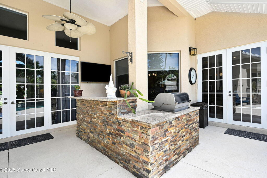 - Exterior FeaturesFire Pit, Outdoor Kitchen and Storm Shutters