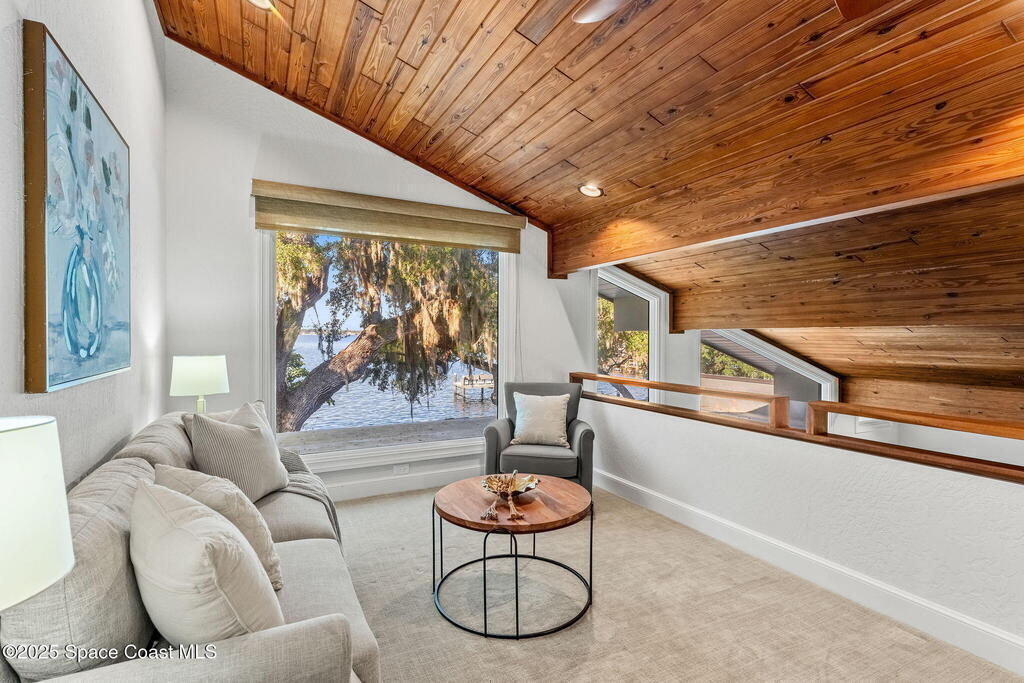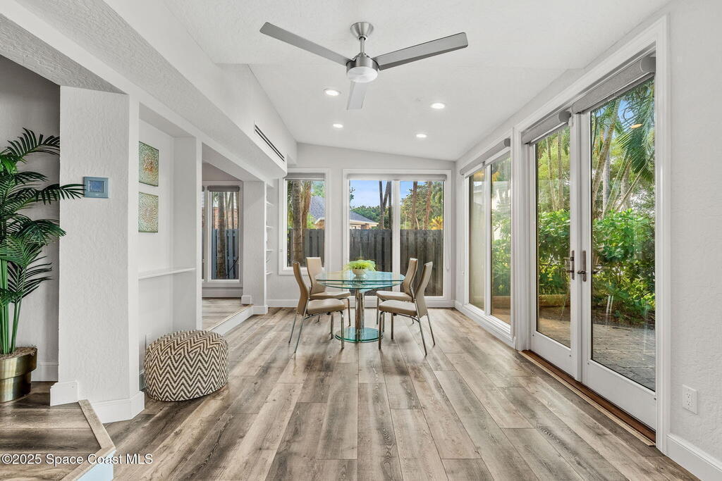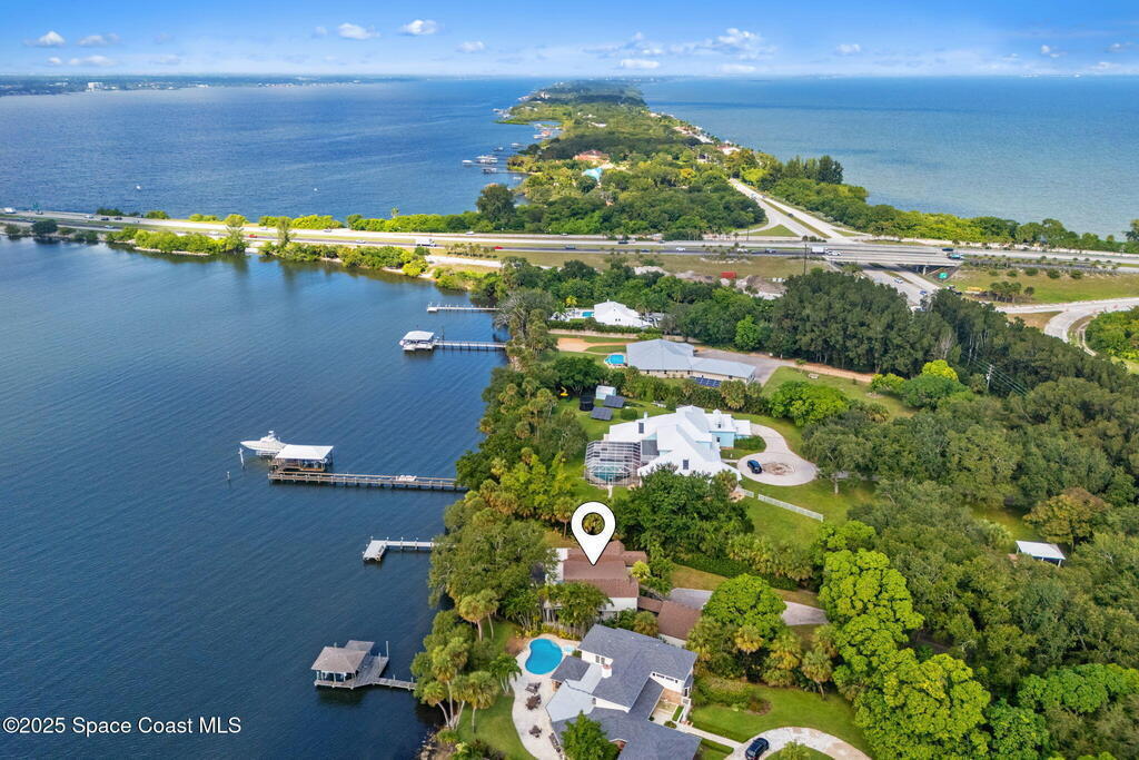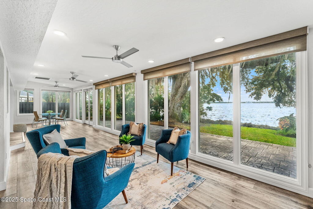 Spectacular direct Indian Riverfront home featuring 3 bedrooms plus an office, completely renovated in 2017 to combine modern design with subtle historic charm. The open layout emphasizes light and connection, with soaring glass, minimal walls, and seamless flow between indoor living spaces and lush outdoor gardens. Vaulted ceilings, LVP and tile flooring, and thoughtfully curated finishes create a warm, modern aesthetic that balances comfort with style. The first-floor primary bedroom offers privacy and river views, while the private dock with state-of-the-art Sure Step decking provides direct access to boating, kayaking, and fishing on the Indian River. Additional features include a newer paver driveway, professional landscaping, and dual air conditioners. Perfectly suited for those seeking Florida waterfront living, this home adapts effortlessly between contemporary and coastal-chic with just a change in furnishings.