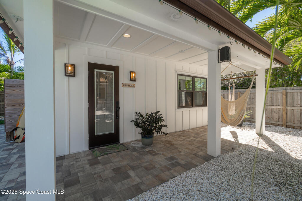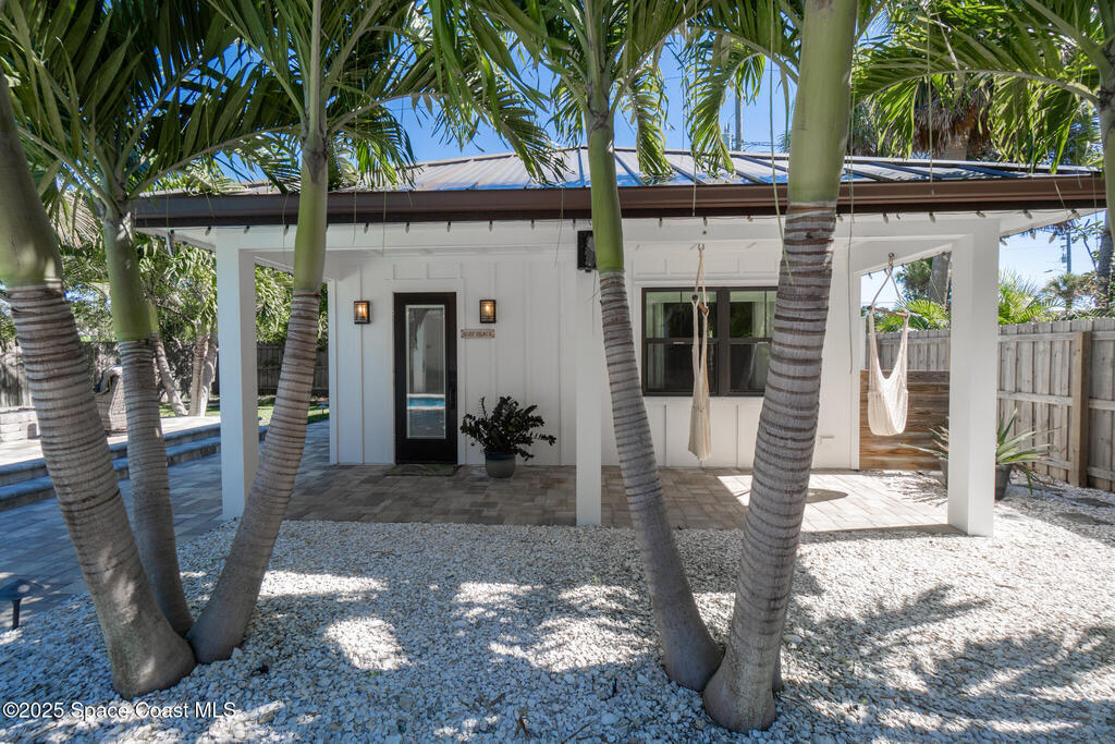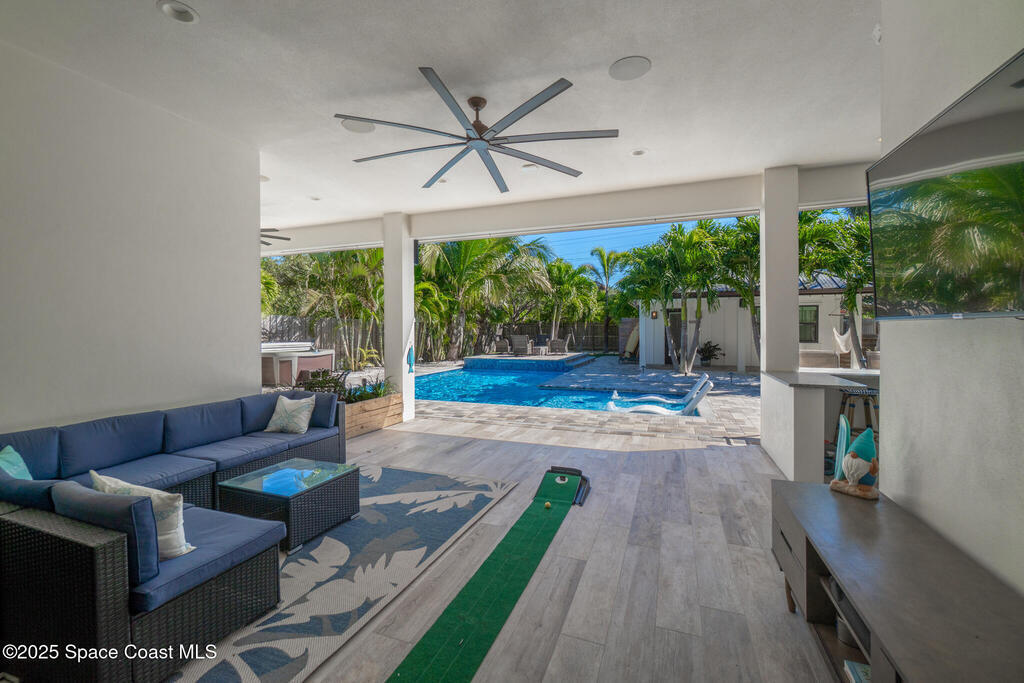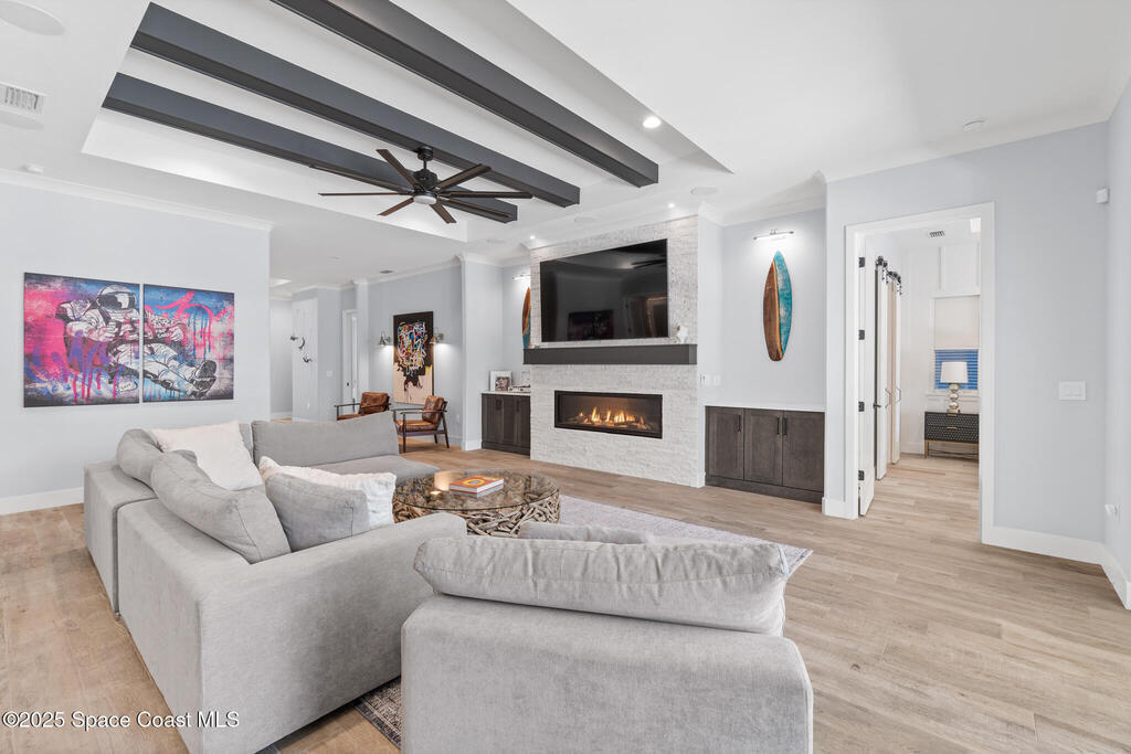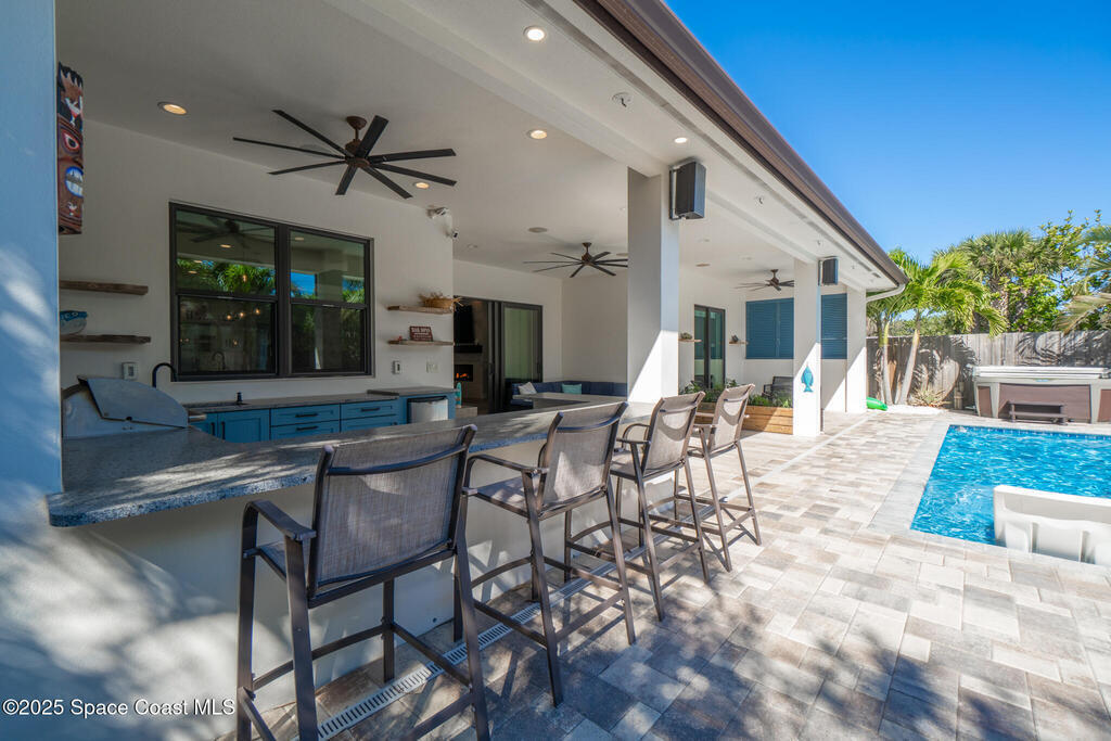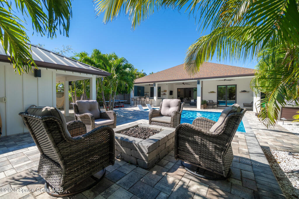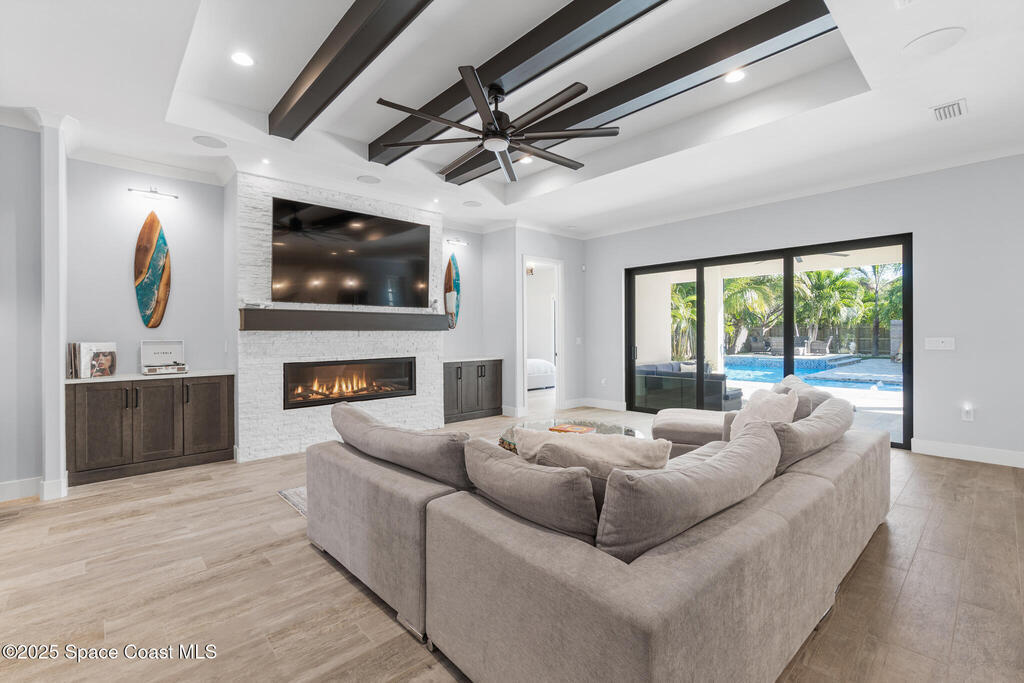 Welcome to your modern beachside oasis. Tucked between the Atlantic Ocean and the Banana River, in the coveted Snug Harbor community of Cocoa Beach. Built in 2020, this stunning 5-bedroom, 3.5-bath residence with nearly 2,500 sqft of living space perfectly blends luxury, efficiency, and the laid-back Florida lifestyle. Every detail of this home was designed to impress, from the chef's kitchen and high end finishes to the resort style backyard that's truly an entertainer's dream. Step inside and experience an open, sun filled layout with vaulted ceilings, custom wood beam inlays and a cozy gas fireplace that anchors the living area. The heart of the home is a designer kitchen featuring an oversized island, induction cooktop, vented range hood, walk-in pantry, quartz countertops, and sleek cabinetry that combine style and function. Whether you're hosting friends or cooking a quiet meal at home, this space was built for connection. The primary suite feels like a private retreat,