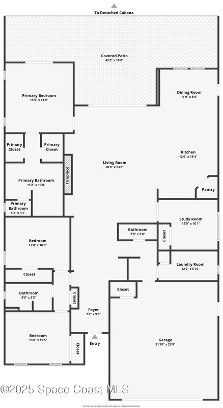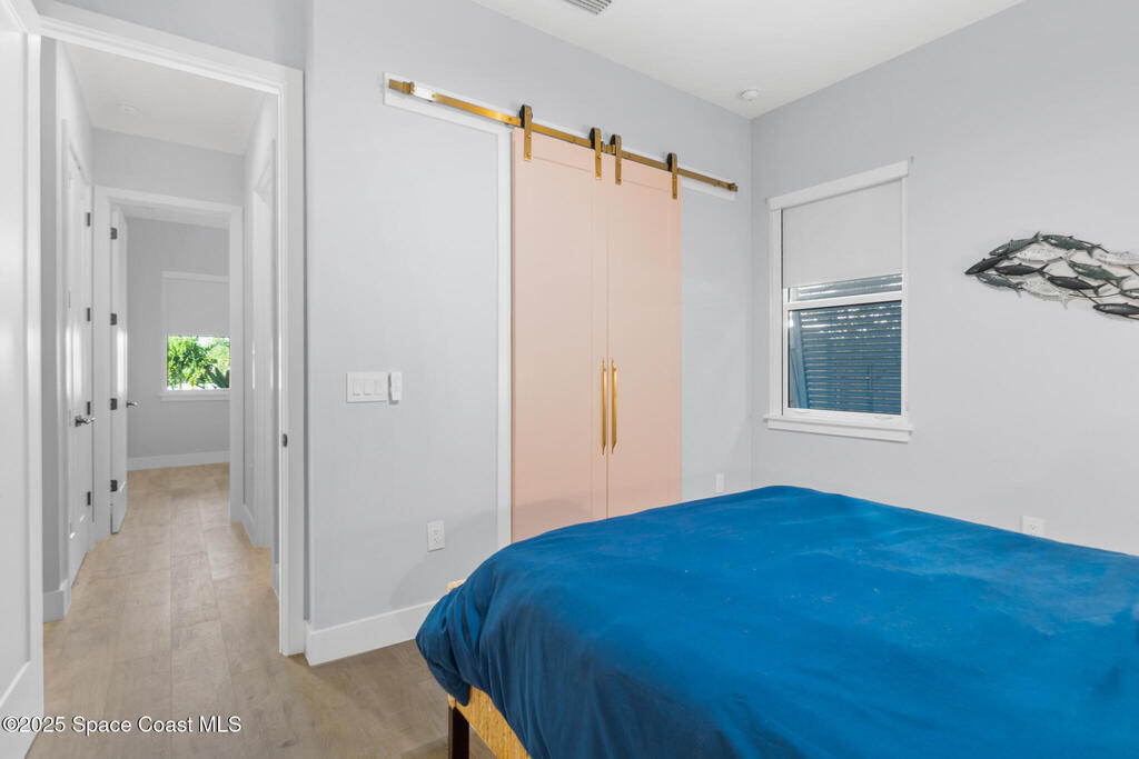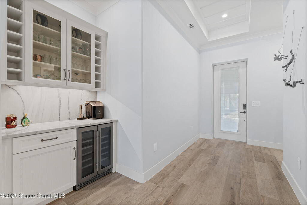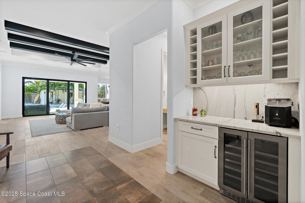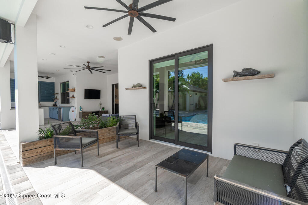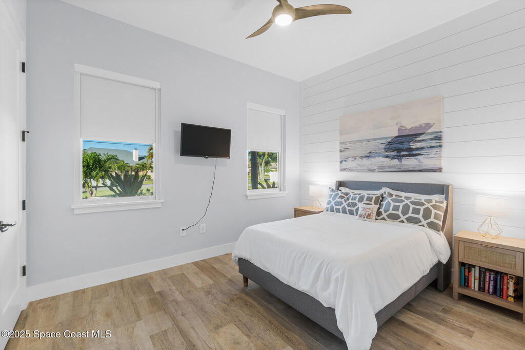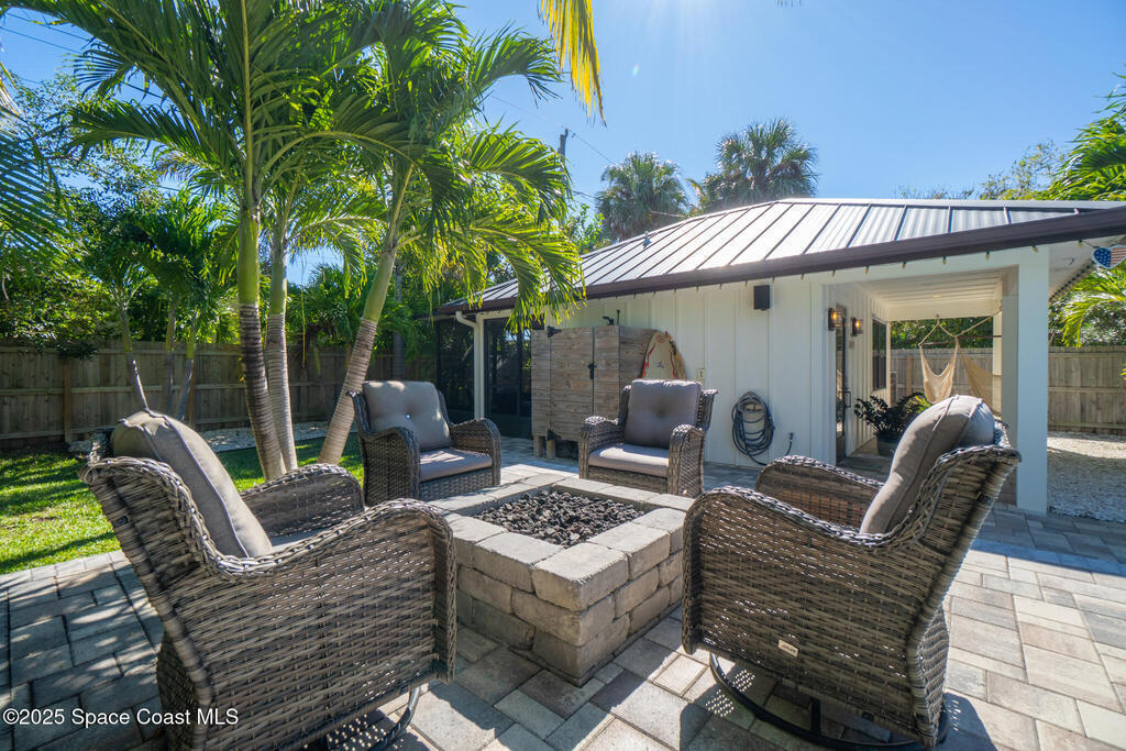 Welcome to your modern beachside oasis. Tucked between the Atlantic Ocean and the Banana River, in the coveted Snug Harbor community of Cocoa Beach. Built in 2020, this stunning 5-bedroom, 3.5-bath residence with nearly 2,500 sqft of living space perfectly blends luxury, efficiency, and the laid-back Florida lifestyle. Every detail of this home was designed to impress, from the chef's kitchen and high end finishes to the resort style backyard that's truly an entertainer's dream. Step inside and experience an open, sun filled layout with vaulted ceilings, custom wood beam inlays and a cozy gas fireplace that anchors the living area. The heart of the home is a designer kitchen featuring an oversized island, induction cooktop, vented range hood, walk-in pantry, quartz countertops, and sleek cabinetry that combine style and function. Whether you're hosting friends or cooking a quiet meal at home, this space was built for connection. The primary suite feels like a private retreat,