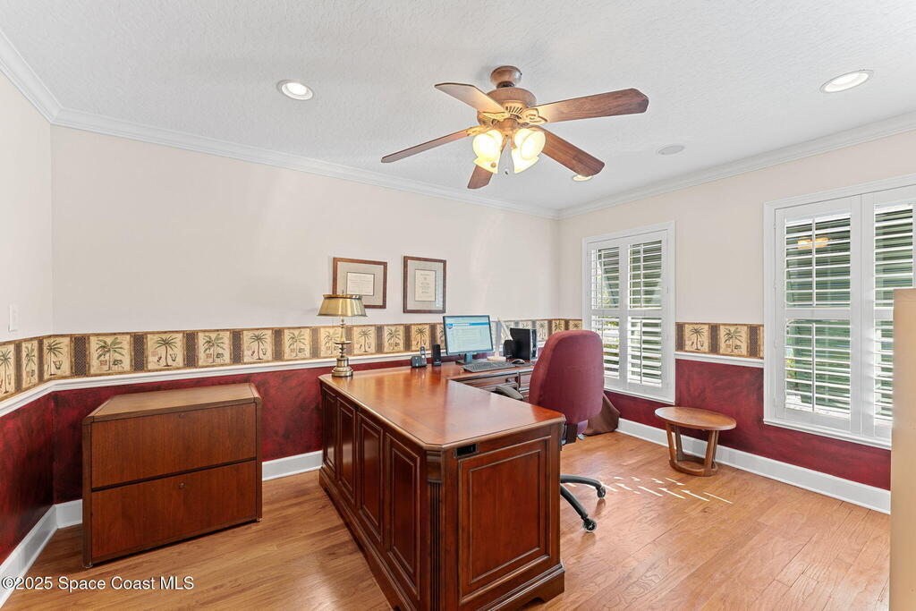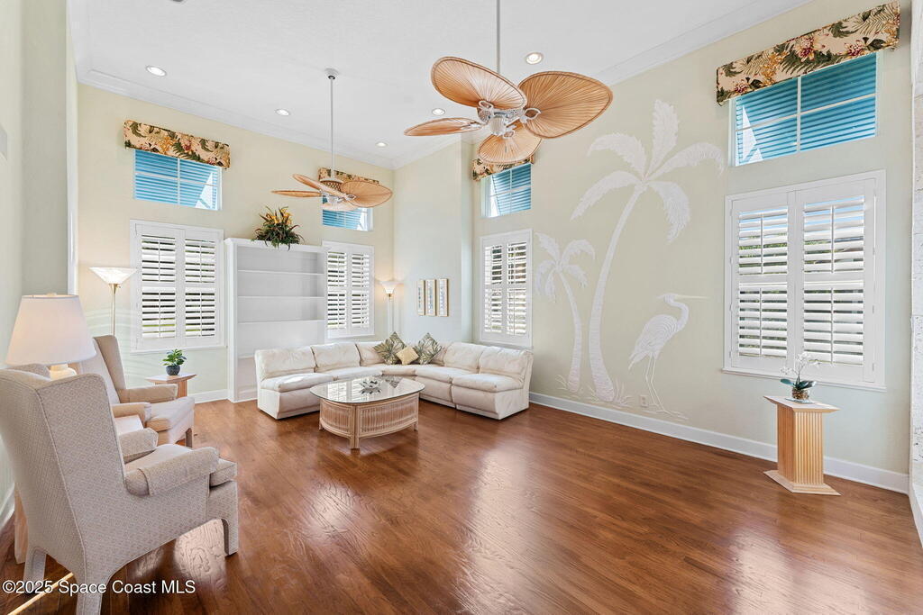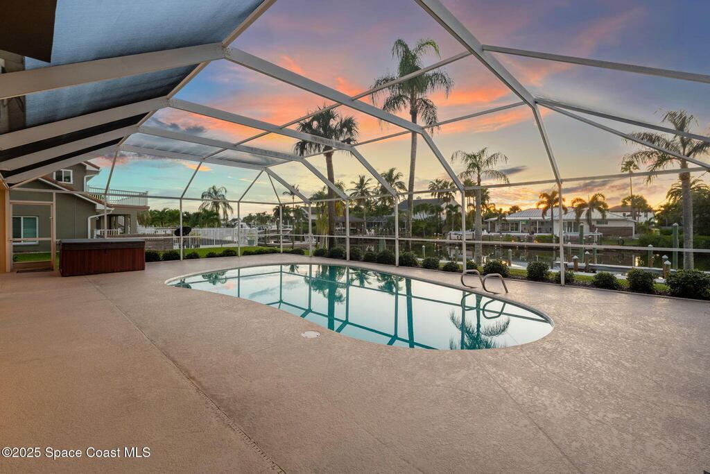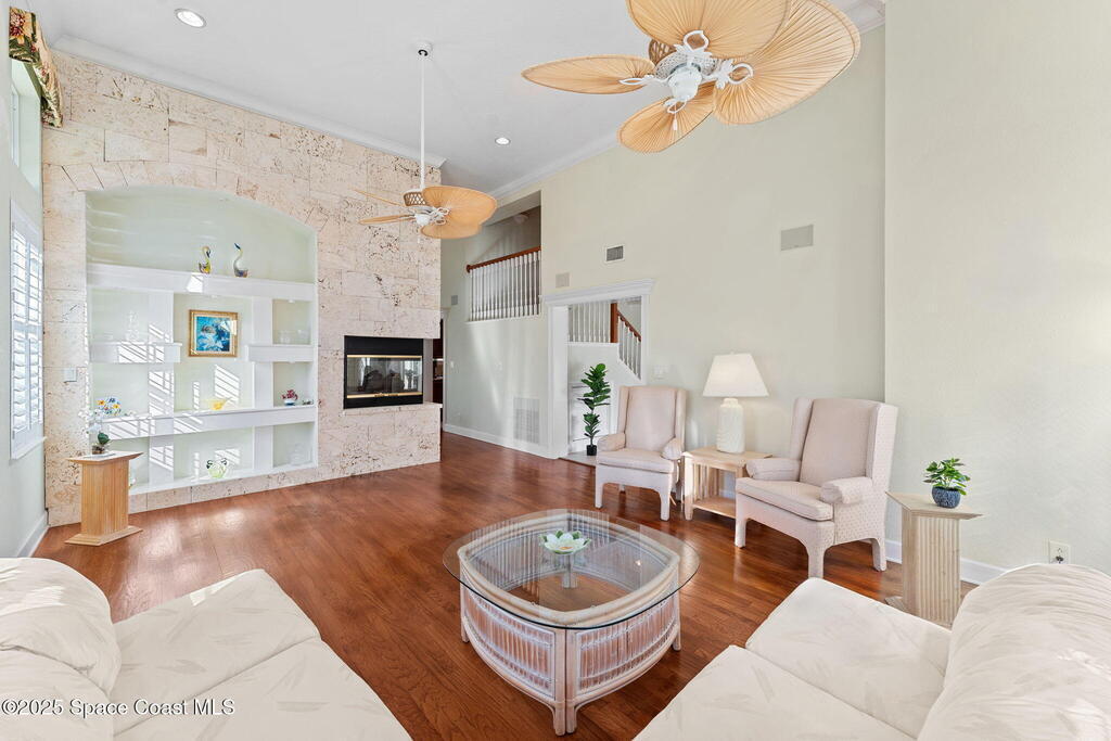 With 100 ft of waterfrontage, this 3 story masterpiece blends timeless craftsmanship w/ luxury upgrades for an unforgettable living experience. From the pavered driveway & 3-car garage w/ carpeted attic access to the whole-house generator & dual AC units, every detail speaks to comfort & design. Inside, tile & wood floors, wood ceilings, & a stone-encased 3-sided fireplace elevate the formal living & dining spaces beneath soaring 12-foot ceilings. The chef's kitchen impresses w/ granite counters, Sub-Zero refrigerator, double oven, walk-in pantry, & cherry wood cabinetry, overlooking the pool & canal. A dedicated office w/ plantation shutters & a laundry room w/ sink & second fridge add everyday functionality. Upstairs, the primary suite captures serene canal views, offering wood floors, a gas fireplace, dual vanities, a garden tub, & a massive walk-in closet. The third-floor retreat dazzles w/ vaulted wood-beamed ceilings, a guest suite, & a spacious game room w/ kitchenette.