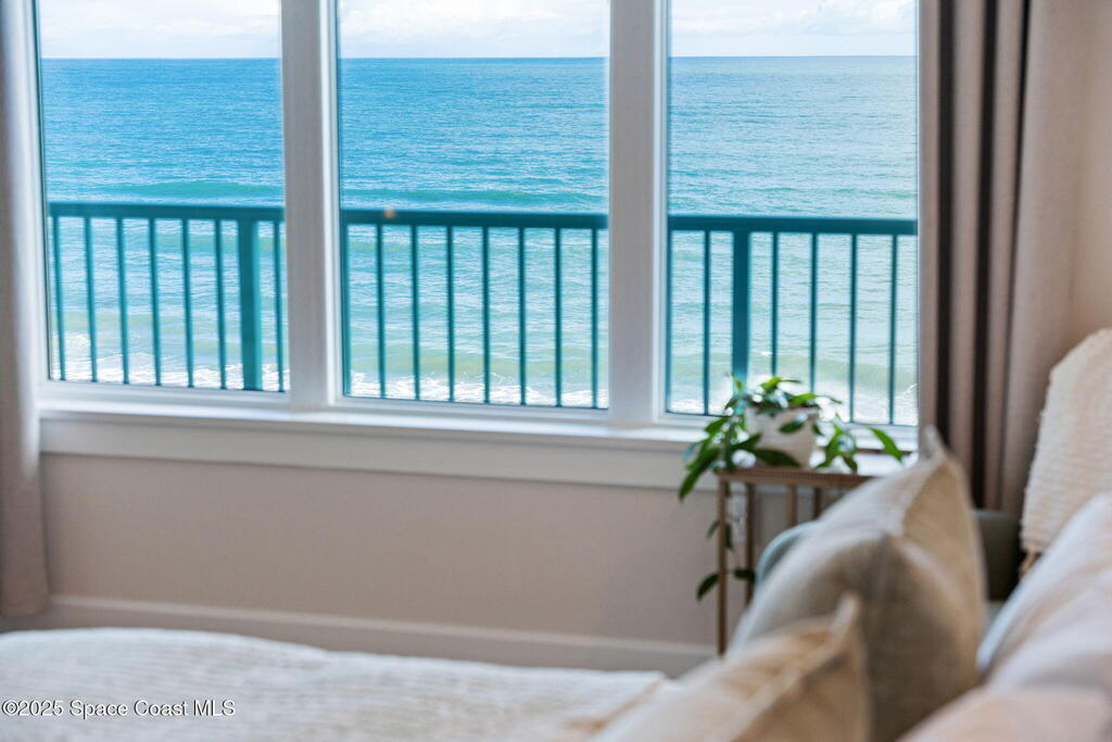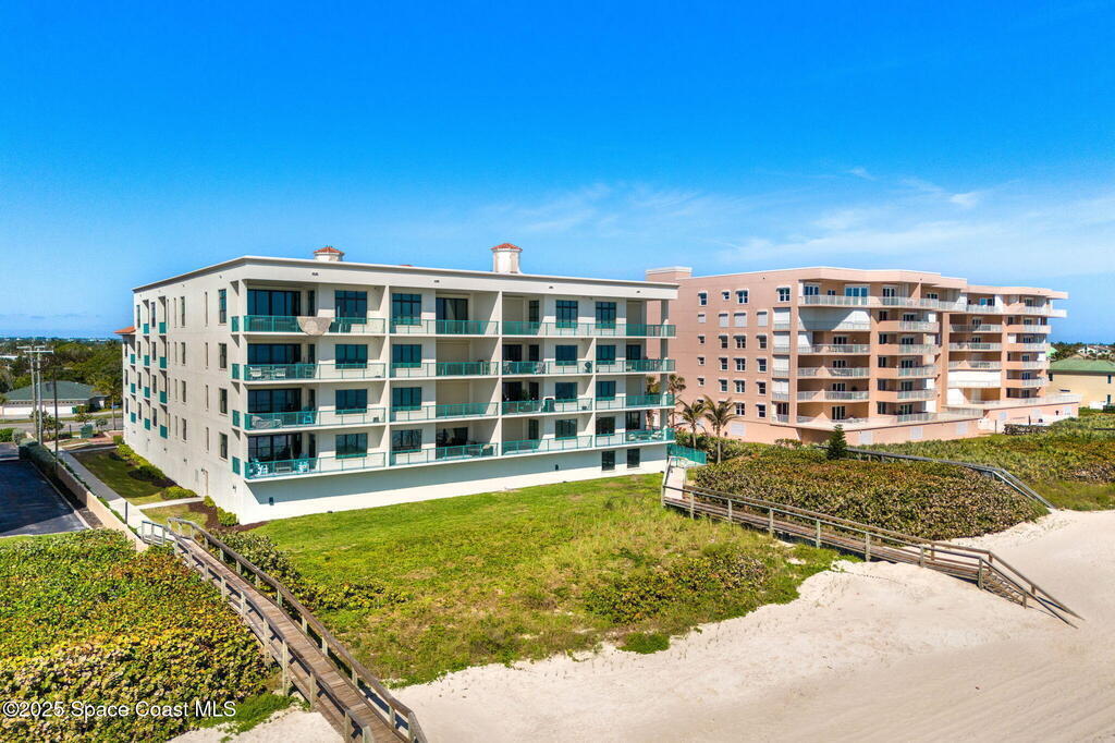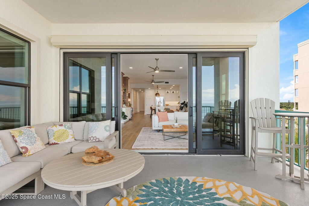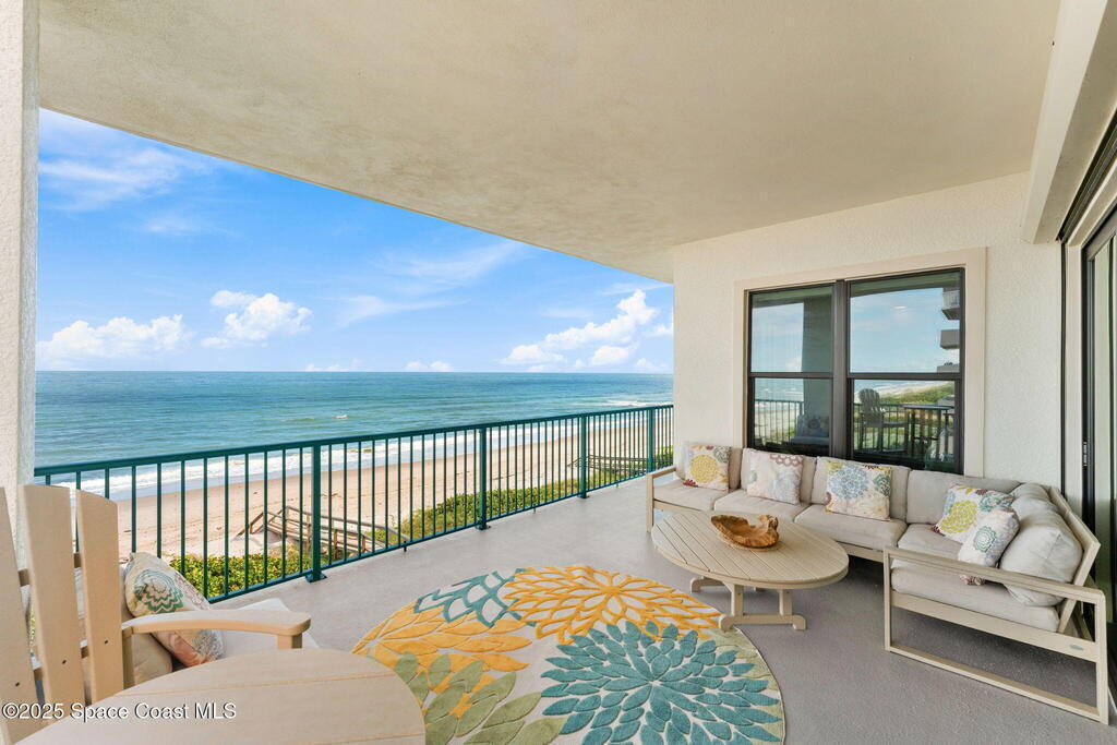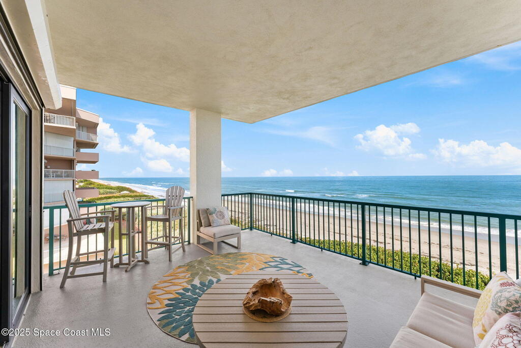 Built in 2022, this NE-corner condo delivers a modern beachfront lifestyle with unobstructed views of the ocean & rocket launches. Elevated 10' ceilings & floor-to-ceiling glass frame the horizon, while sliding doors open to a nearly 300 sq ft terrace that blurs the line between indoors & out. High-end finishes define every space, from custom cabinetry, quartz counters & stainless appliances in the kitchen to the custom bar/buffet at dining, built-in media center, window treatments & closet systems. Impact-rated glass, 1 3/4 solid core interior doors & concrete block walls provide peace of mind, complemented by fire sprinkler protection for safety. Community amenities elevate every day with a clubhouse, fitness facility, heated pool, hot tub & putting green. Blending sleek style with coastal ease, this residence is designed for both comfort & connection, offering an unmatched opportunity to embrace oceanfront living at its most effortless.