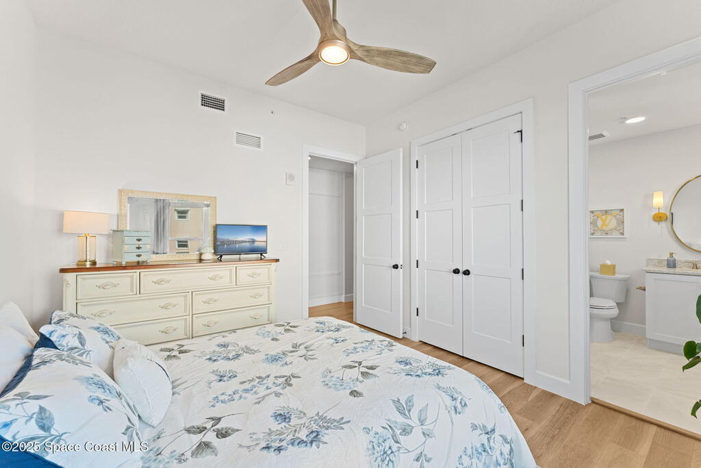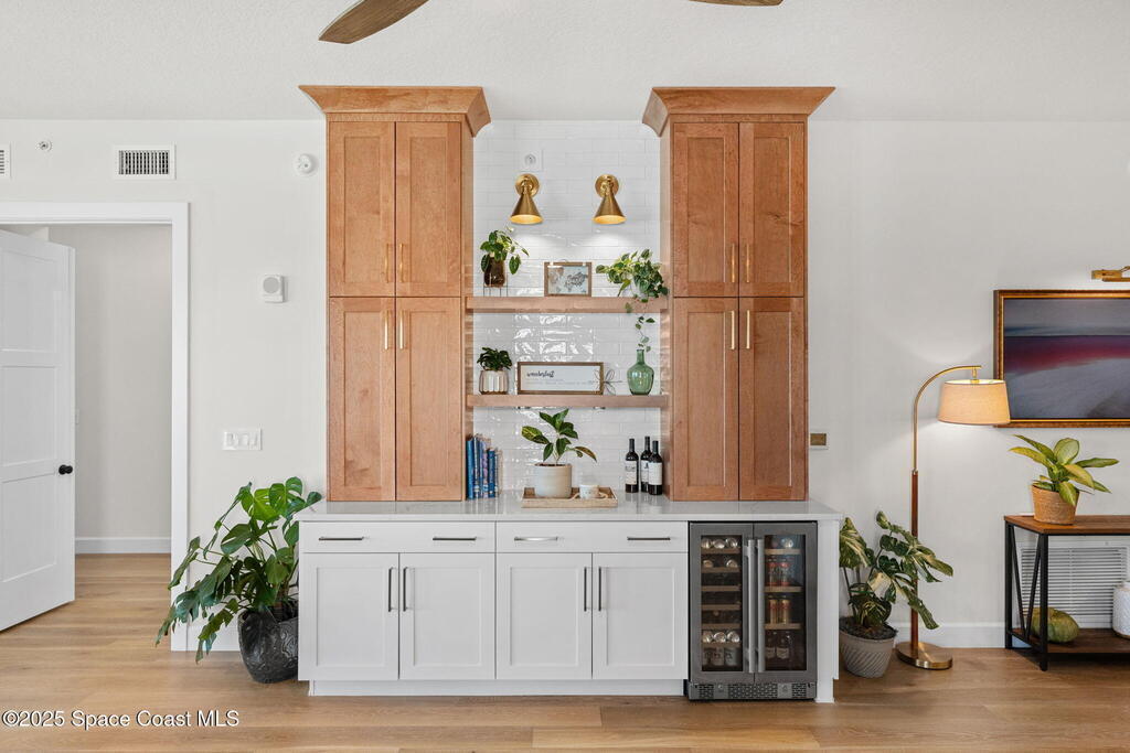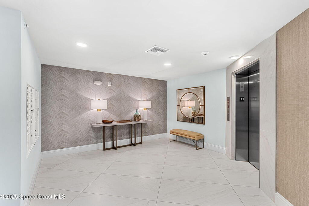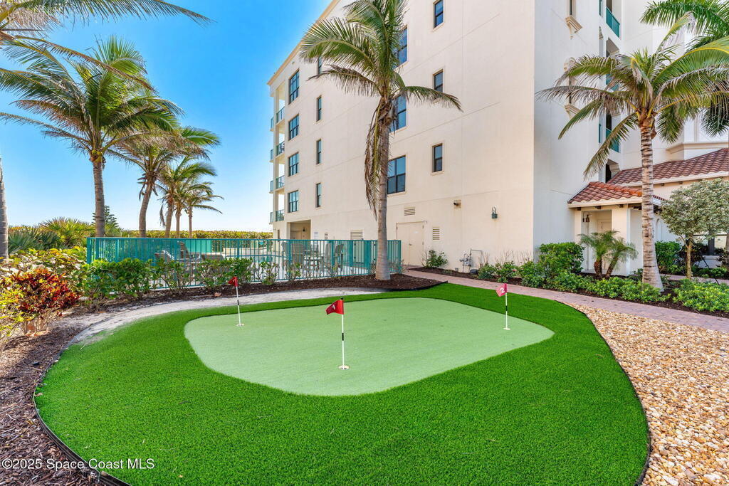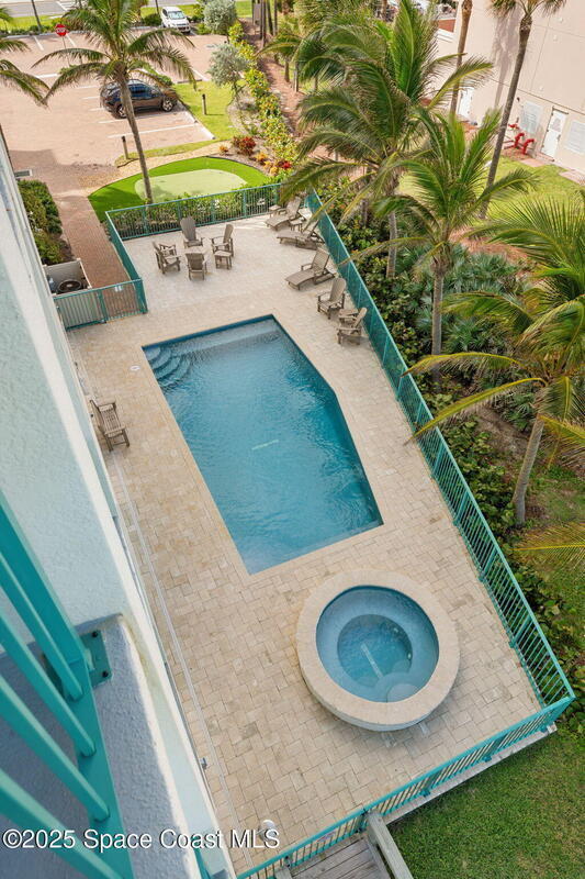 Built in 2022, this NE-corner condo delivers a modern beachfront lifestyle with unobstructed views of the ocean & rocket launches. Elevated 10' ceilings & floor-to-ceiling glass frame the horizon, while sliding doors open to a nearly 300 sq ft terrace that blurs the line between indoors & out. High-end finishes define every space, from custom cabinetry, quartz counters & stainless appliances in the kitchen to the custom bar/buffet at dining, built-in media center, window treatments & closet systems. Impact-rated glass, 1 3/4 solid core interior doors & concrete block walls provide peace of mind, complemented by fire sprinkler protection for safety. Community amenities elevate every day with a clubhouse, fitness facility, heated pool, hot tub & putting green. Blending sleek style with coastal ease, this residence is designed for both comfort & connection, offering an unmatched opportunity to embrace oceanfront living at its most effortless.
