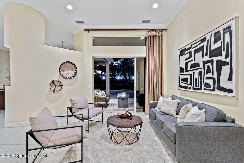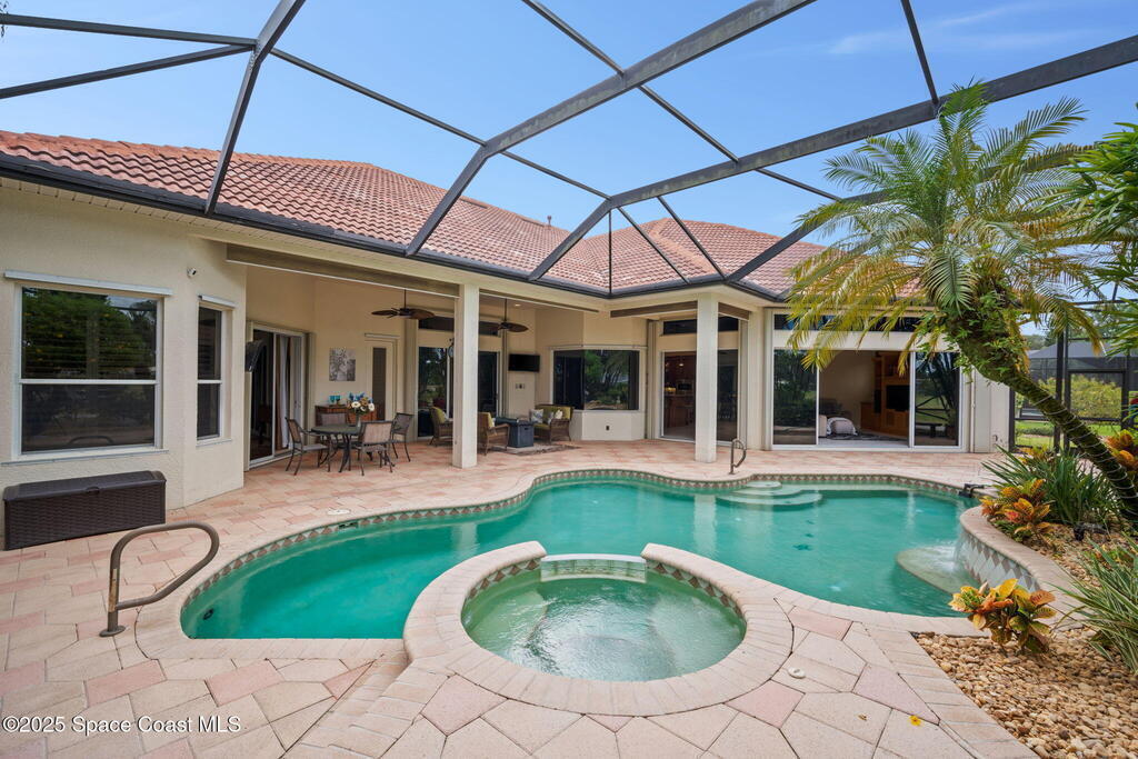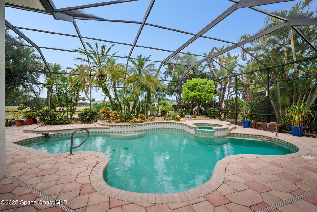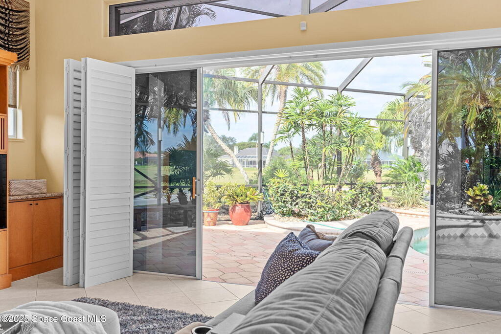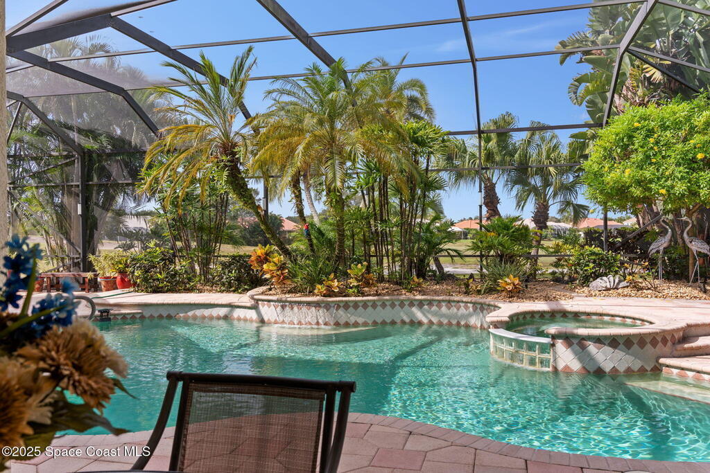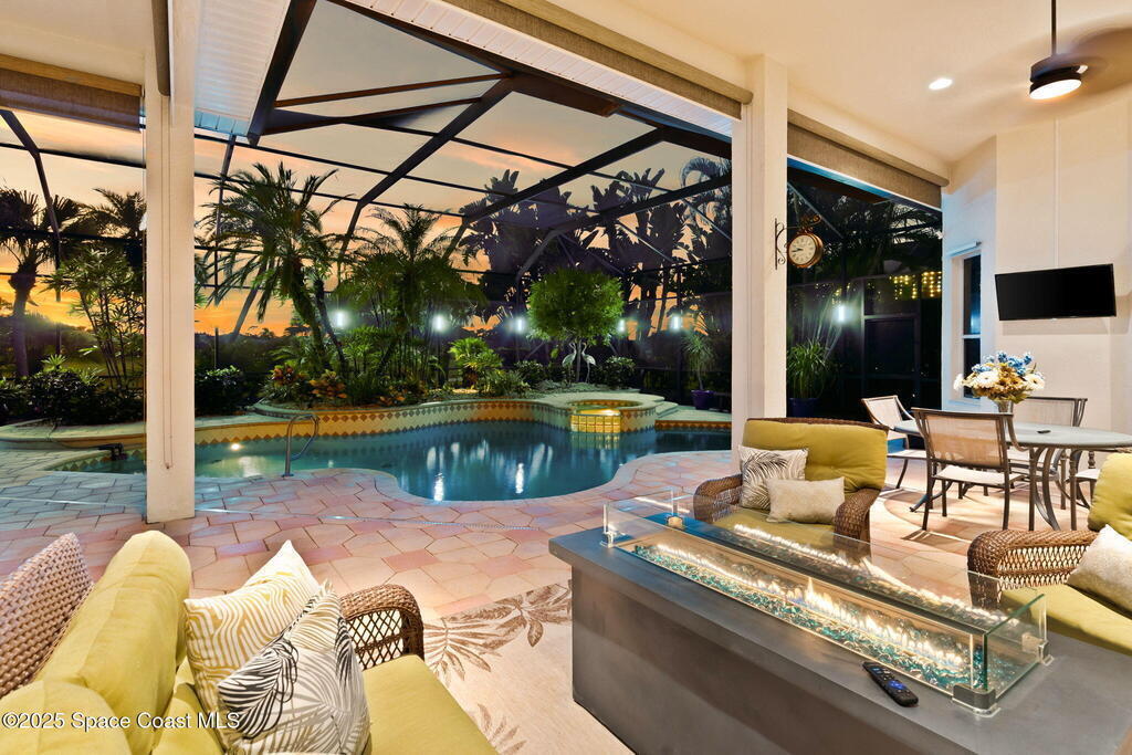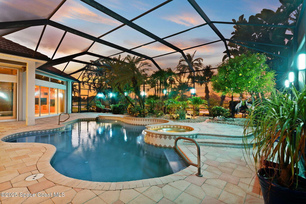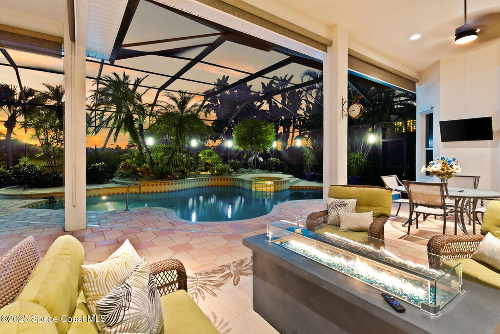 Luxury living in Baytree! Located on the 8th fairway in gated Saddleworth, this elegant single-story home offers over 3,150 SF of open living with high ceilings, plantation shutters, tile floors, and premium finishes. Gourmet kitchen features granite countertops, large island, gas cooktop, Bosch dishwasher, new refrigerator, walk-in pantry, and breakfast nook overlooking the pool. Spacious primary suite with sitting area, dual custom closets, Jacuzzi tub, walk-in shower, and aquarium window. Custom office with built-ins plus 2 additional guest rooms. Enjoy resort-style outdoor living with screened lanai, covered seating, tropical landscaping, and heated saltwater pool & spa with waterfalls and LED lighting. Brick paver circular driveway, 3-car garage, natural gas generator, central vac, security system, hurricane shutters, and 2025 HVAC. Immaculate and move-in ready in one of Baytree's most desirable cul-de-sacs--minutes to top-rated schools, golf, parks, dining, and Suntree amenities