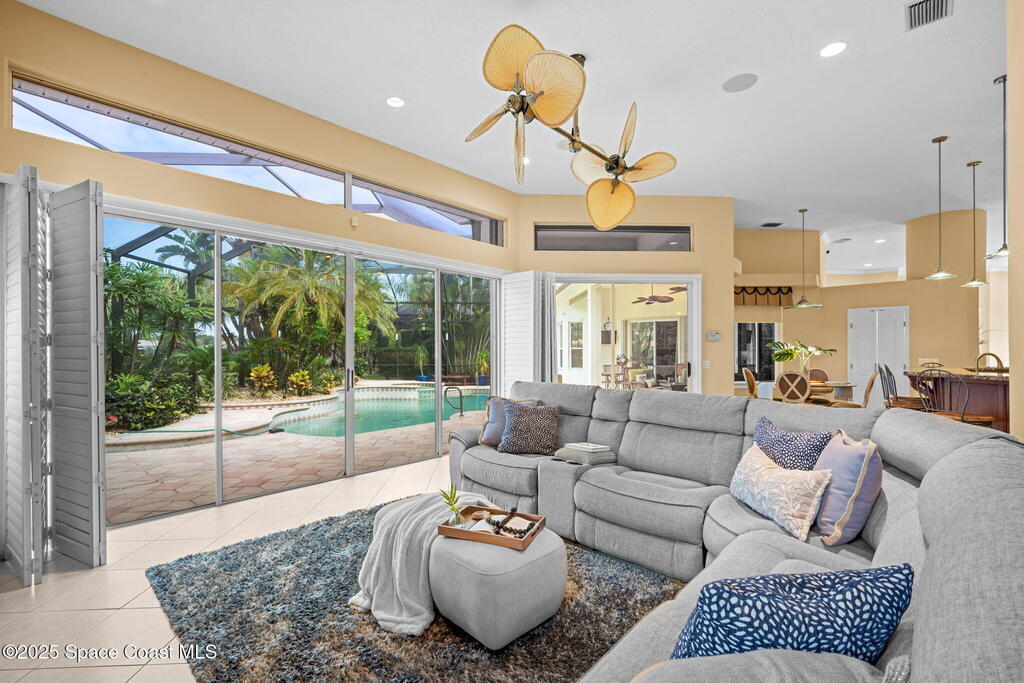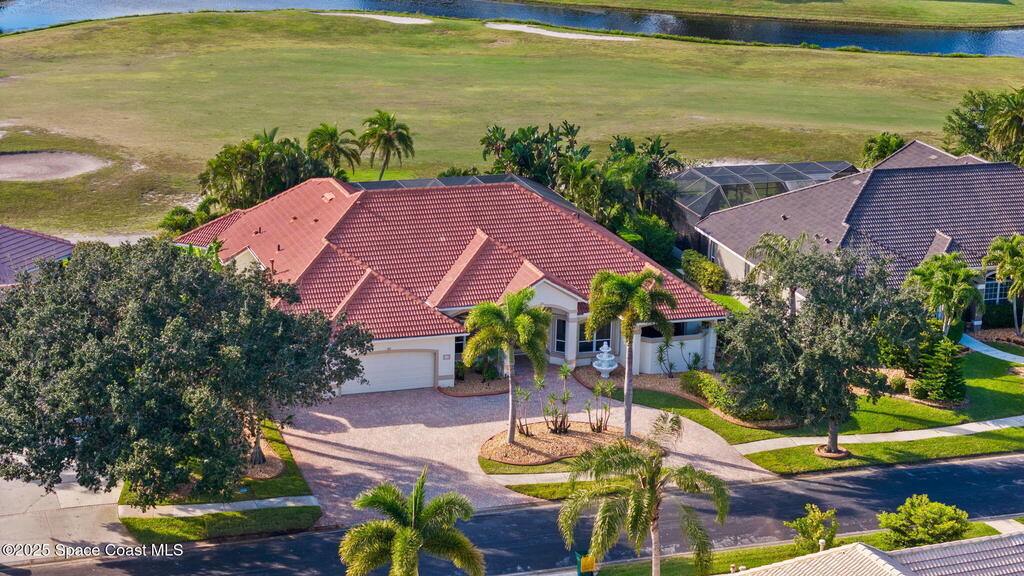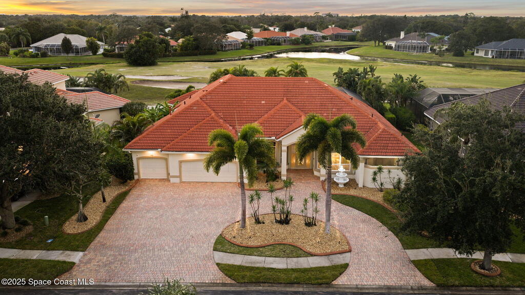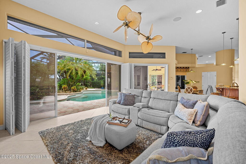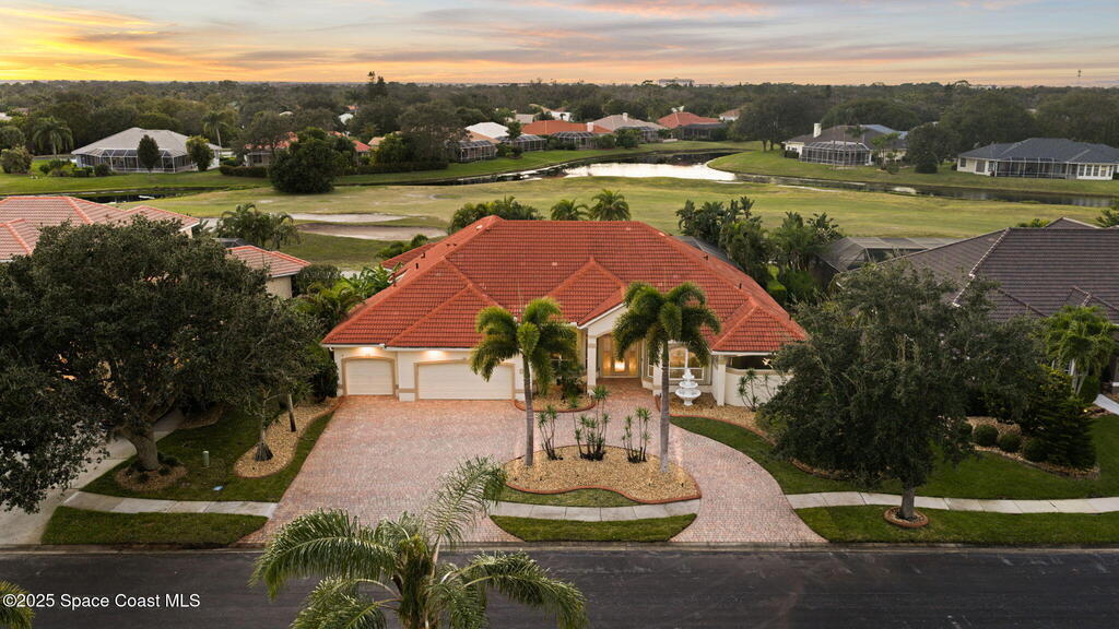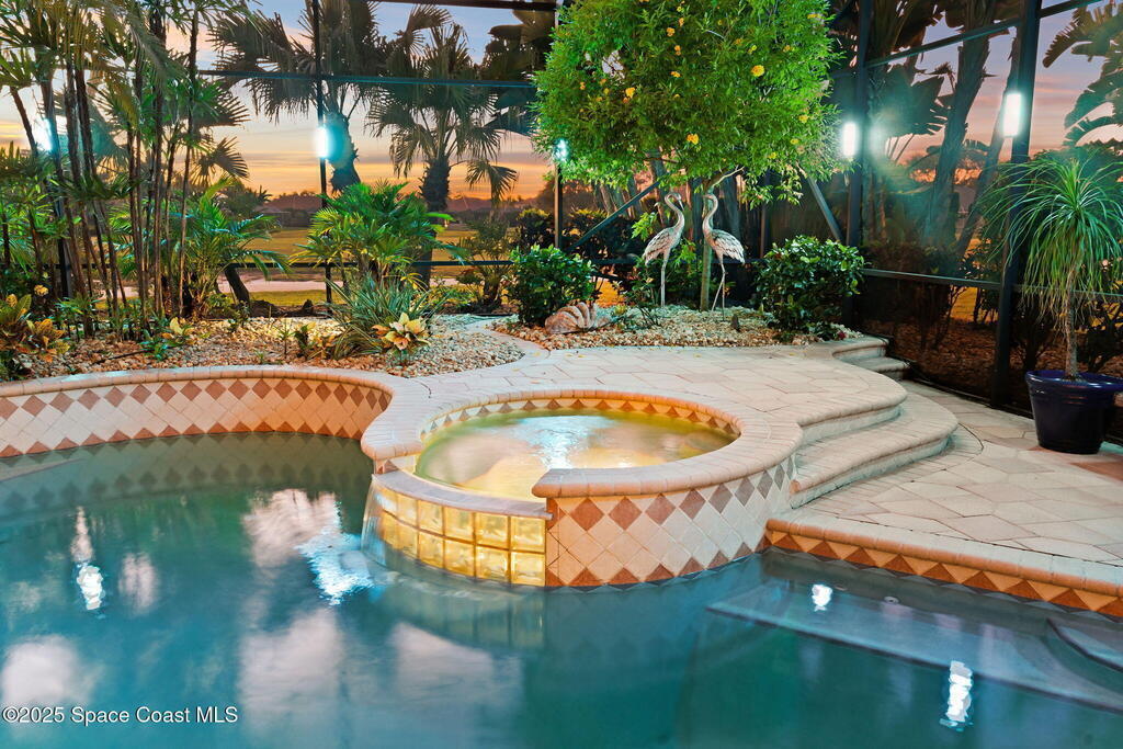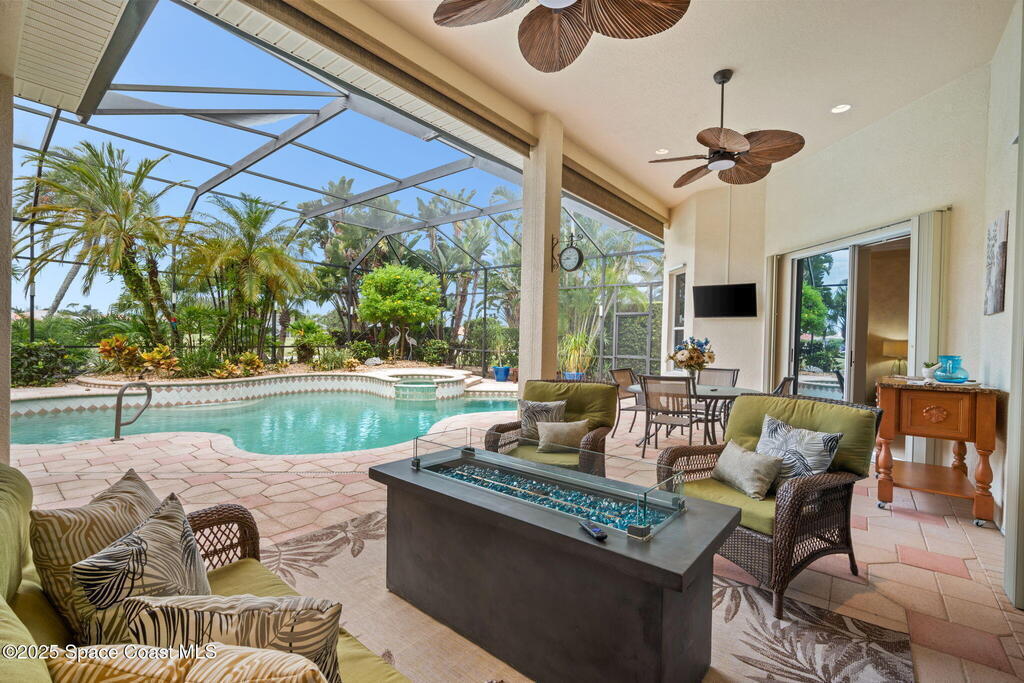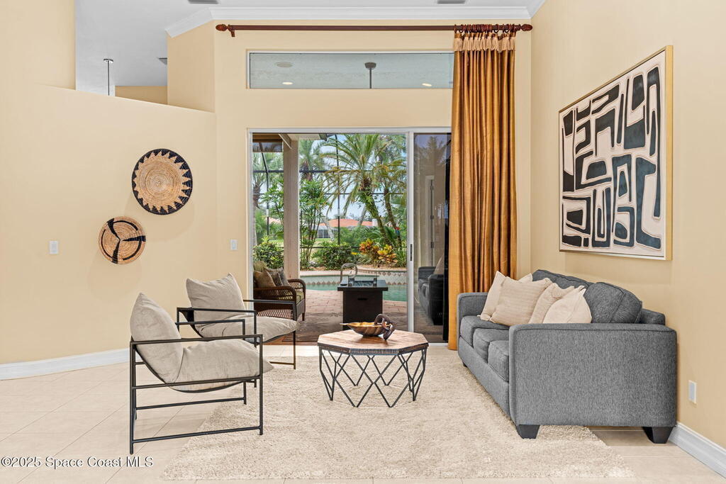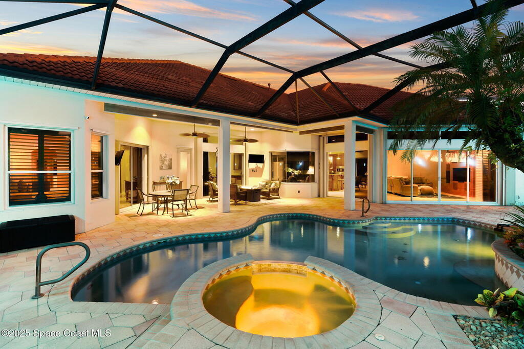 Luxury living in Baytree! Located on the 8th fairway in gated Saddleworth, this elegant single-story home offers over 3,150 SF of open living with high ceilings, plantation shutters, tile floors, and premium finishes. Gourmet kitchen features granite countertops, large island, gas cooktop, Bosch dishwasher, new refrigerator, walk-in pantry, and breakfast nook overlooking the pool. Spacious primary suite with sitting area, dual custom closets, Jacuzzi tub, walk-in shower, and aquarium window. Custom office with built-ins plus 2 additional guest rooms. Enjoy resort-style outdoor living with screened lanai, covered seating, tropical landscaping, and heated saltwater pool & spa with waterfalls and LED lighting. Brick paver circular driveway, 3-car garage, natural gas generator, central vac, security system, hurricane shutters, and 2025 HVAC. Immaculate and move-in ready in one of Baytree's most desirable cul-de-sacs--minutes to top-rated schools, golf, parks, dining, and Suntree amenities