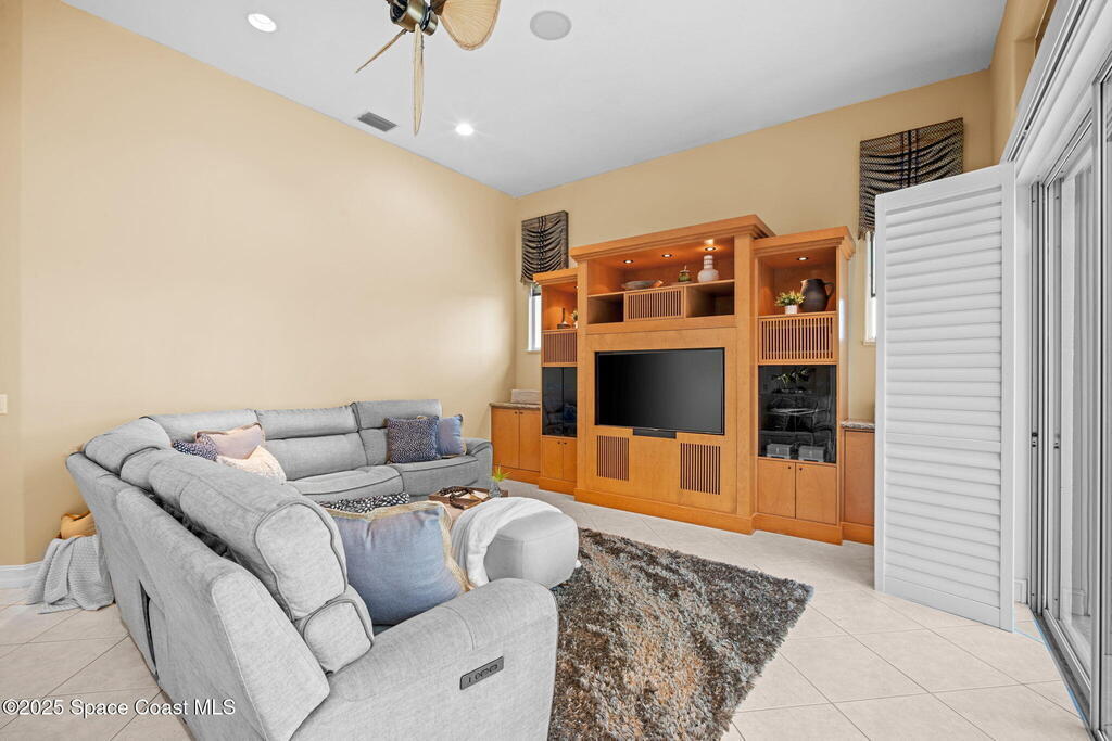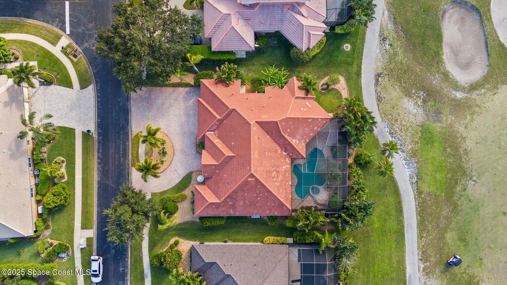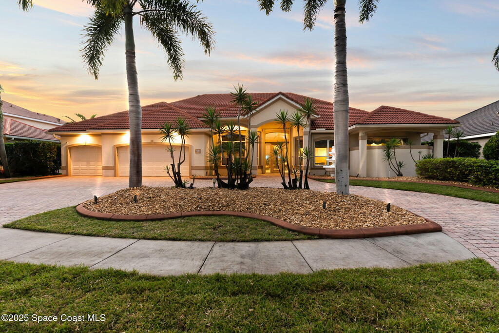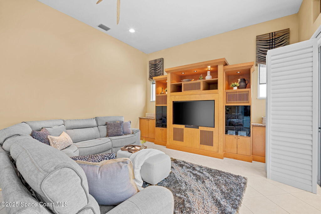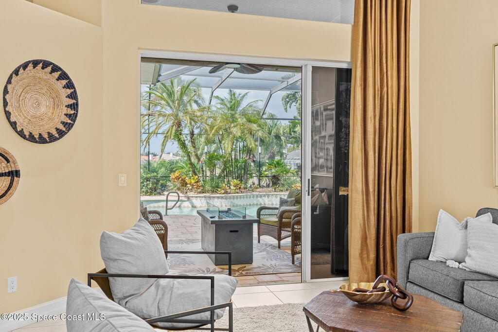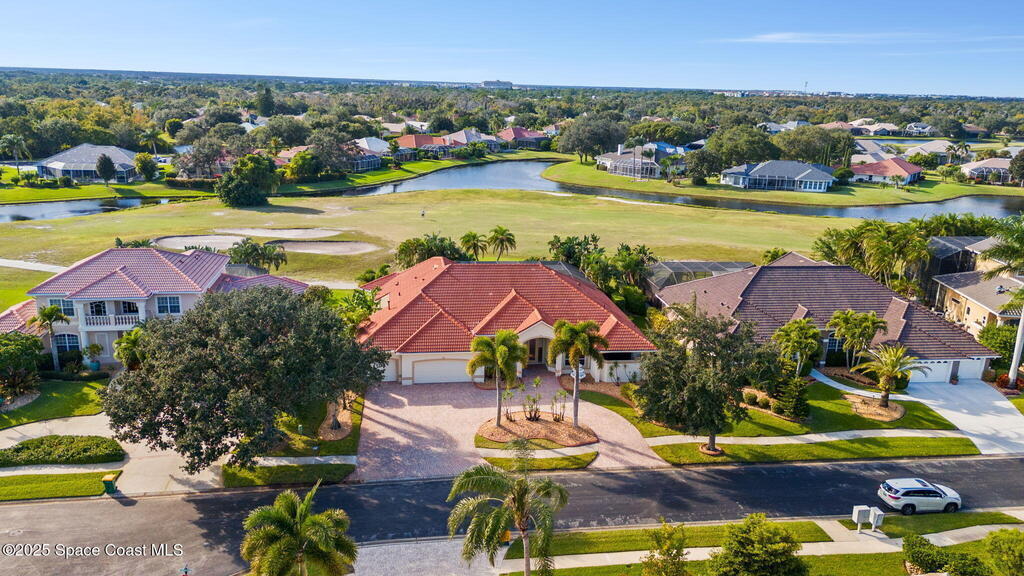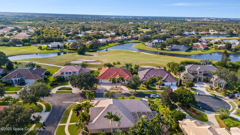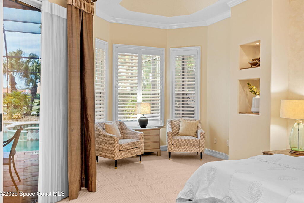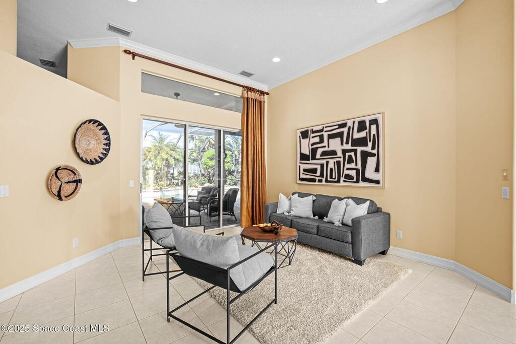 Luxury living in Baytree! Located on the 8th fairway in gated Saddleworth, this elegant single-story home offers over 3,150 SF of open living with high ceilings, plantation shutters, tile floors, and premium finishes. Gourmet kitchen features granite countertops, large island, gas cooktop, Bosch dishwasher, new refrigerator, walk-in pantry, and breakfast nook overlooking the pool. Spacious primary suite with sitting area, dual custom closets, Jacuzzi tub, walk-in shower, and aquarium window. Custom office with built-ins plus 2 additional guest rooms. Enjoy resort-style outdoor living with screened lanai, covered seating, tropical landscaping, and heated saltwater pool & spa with waterfalls and LED lighting. Brick paver circular driveway, 3-car garage, natural gas generator, central vac, security system, hurricane shutters, and 2025 HVAC. Immaculate and move-in ready in one of Baytree's most desirable cul-de-sacs--minutes to top-rated schools, golf, parks, dining, and Suntree amenities