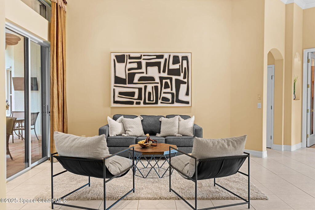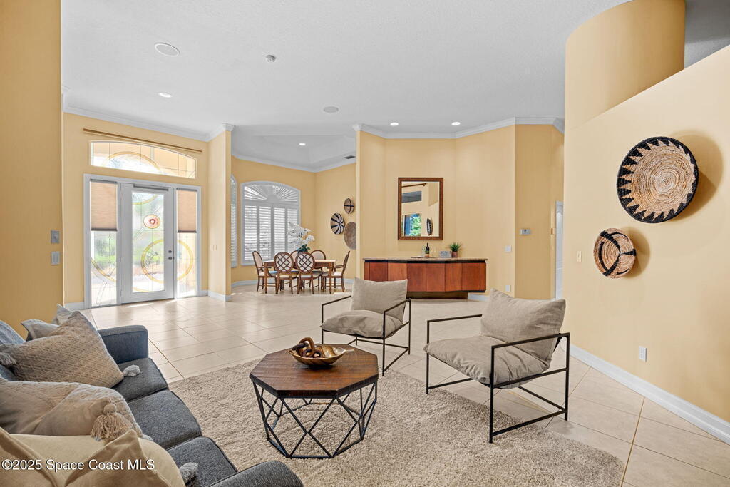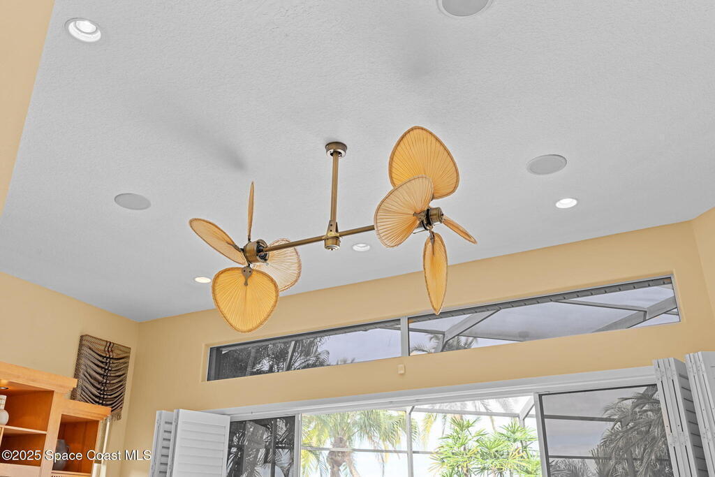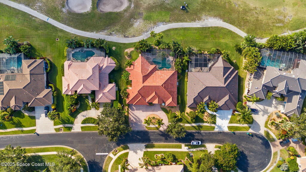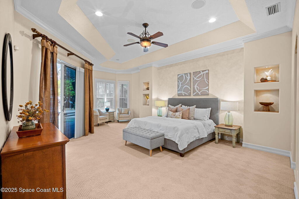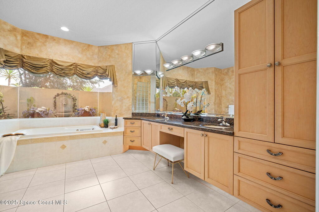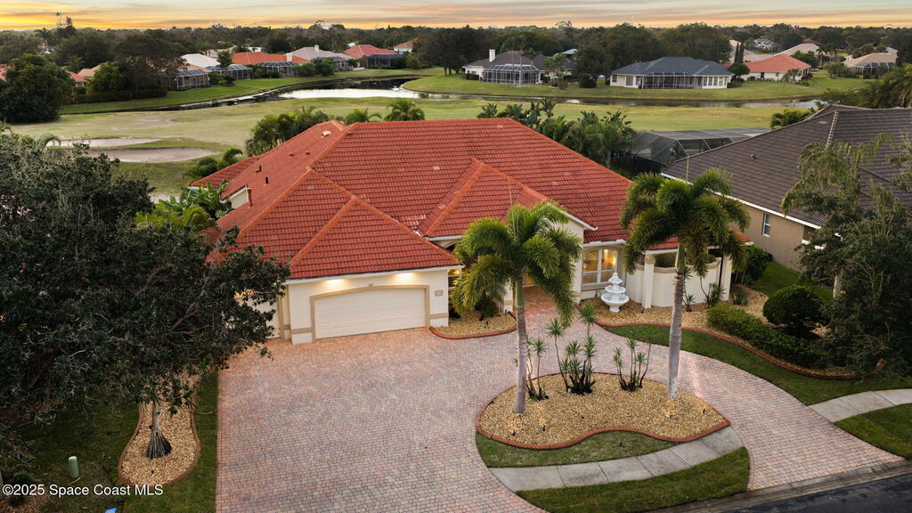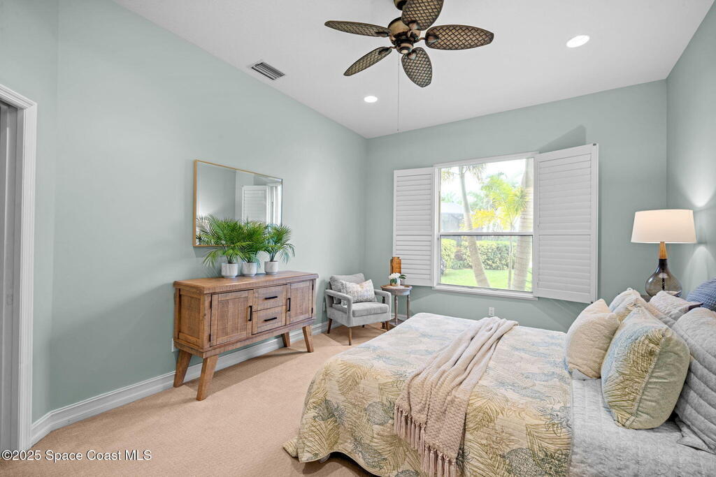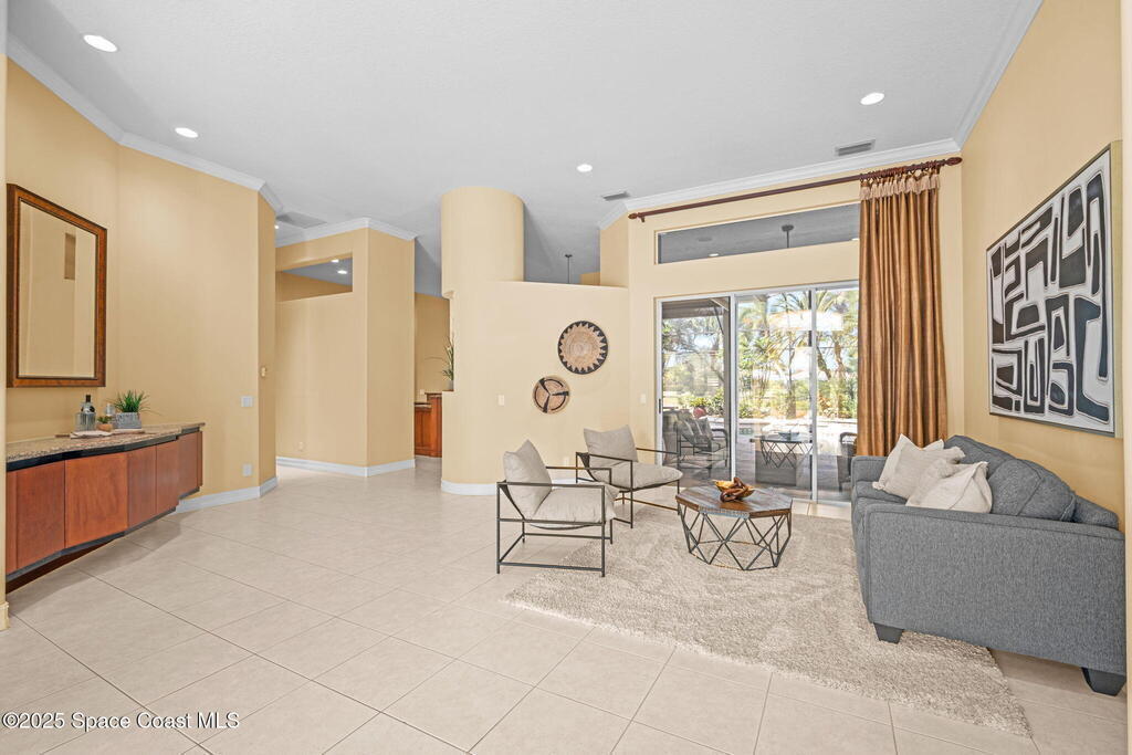 Luxury living in Baytree! Located on the 8th fairway in gated Saddleworth, this elegant single-story home offers over 3,150 SF of open living with high ceilings, plantation shutters, tile floors, and premium finishes. Gourmet kitchen features granite countertops, large island, gas cooktop, Bosch dishwasher, new refrigerator, walk-in pantry, and breakfast nook overlooking the pool. Spacious primary suite with sitting area, dual custom closets, Jacuzzi tub, walk-in shower, and aquarium window. Custom office with built-ins plus 2 additional guest rooms. Enjoy resort-style outdoor living with screened lanai, covered seating, tropical landscaping, and heated saltwater pool & spa with waterfalls and LED lighting. Brick paver circular driveway, 3-car garage, natural gas generator, central vac, security system, hurricane shutters, and 2025 HVAC. Immaculate and move-in ready in one of Baytree's most desirable cul-de-sacs--minutes to top-rated schools, golf, parks, dining, and Suntree amenities