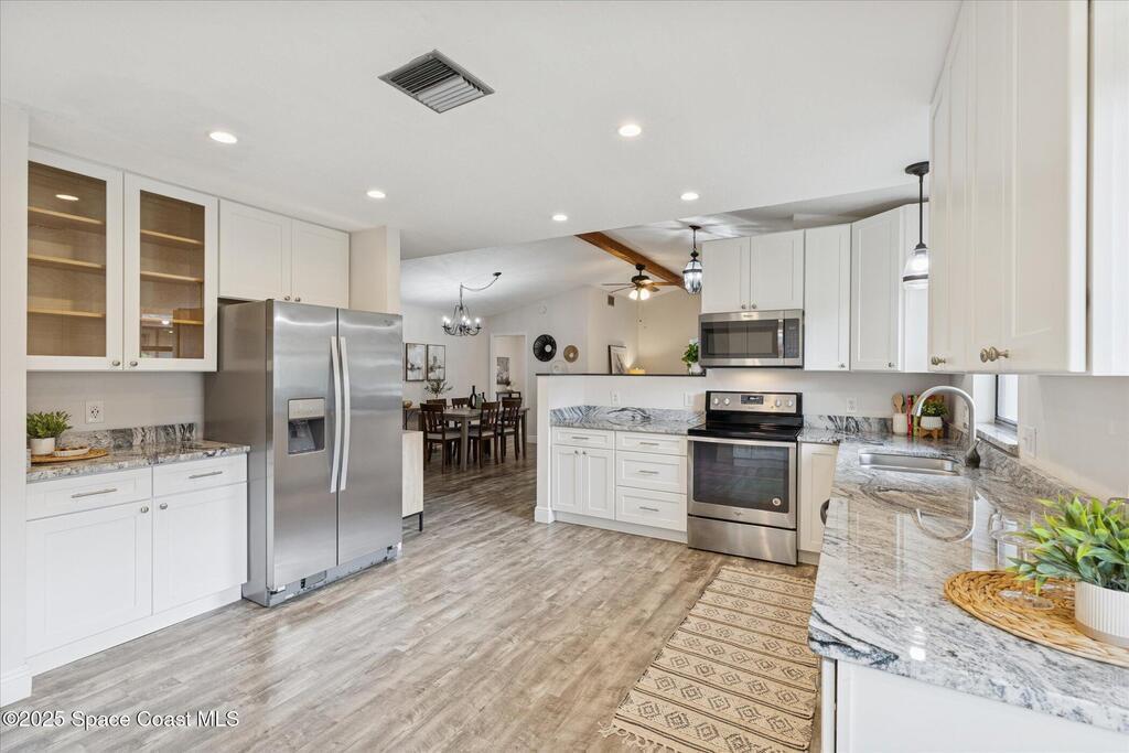 Remodeled move-in ready 3 bed, 2 bath home with a 2-car garage and an oversized driveway. Easy single-level living with a tropical palm tree-filled backyard. The updated kitchen offers granite counters, additional cabinetry for pantry items, stainless steel appliances, ample space to add your dream island and an open flow to the living and dining spaces. A flexible bonus room--perfect as a sunroom, den, office, or second living area--is wrapped in whitewashed shiplap and surrounded by windows for all-day natural light. Fill it with all the plants your heart desires! The wood beam spanning the living room ceiling adds another touch of character. Your primary bedroom has an ensuite with granite counters and a clean, classic subway tiled walk-in shower. Even the guest bathroom is remodeled! Step outside to a fully fenced backyard that shouts Florida lifestyle, ideal for relaxing or weekend cookouts. Love the outdoors? You're a short drive to Kiwanis Island and Kelly Park with public boat