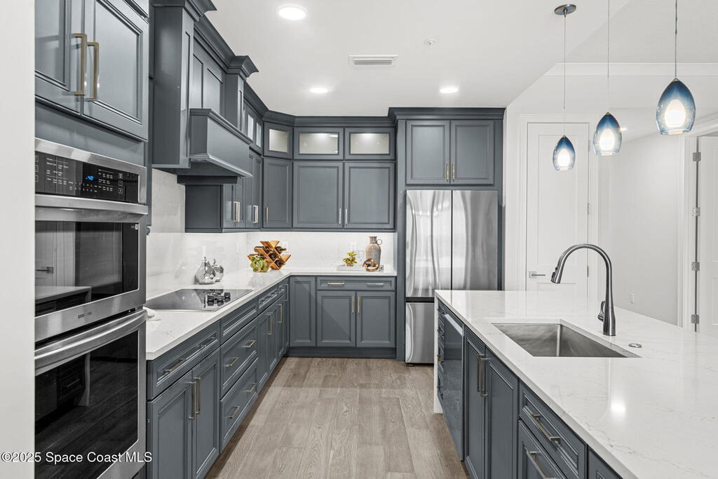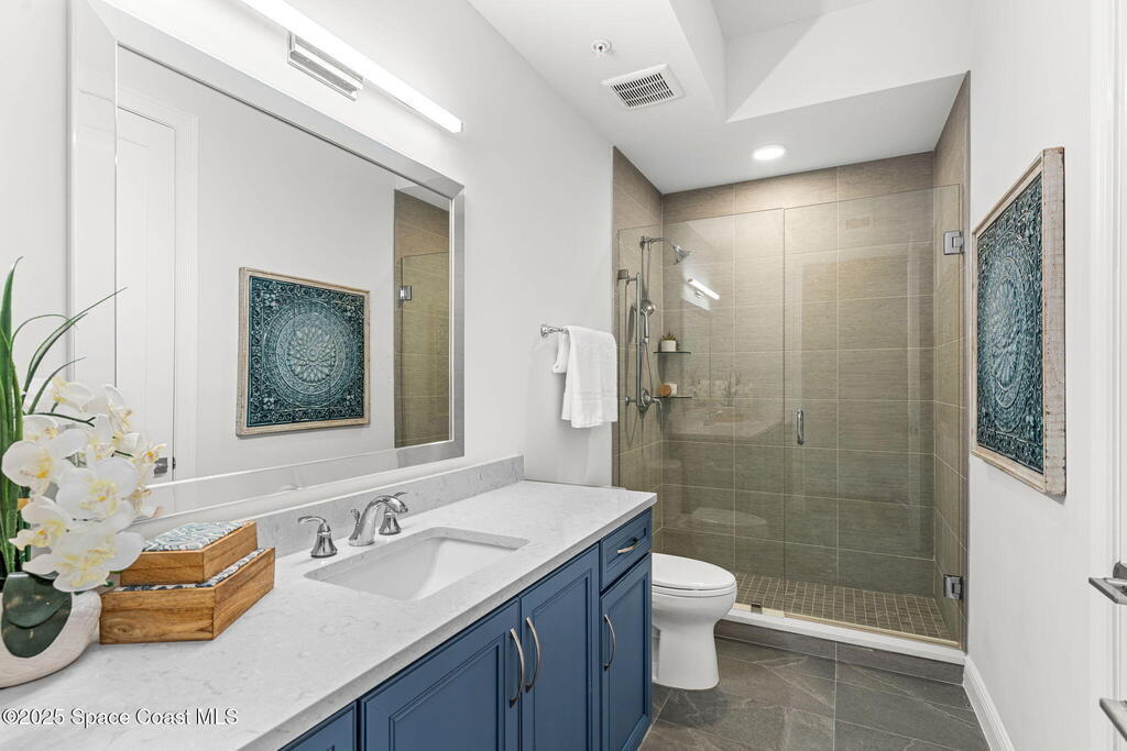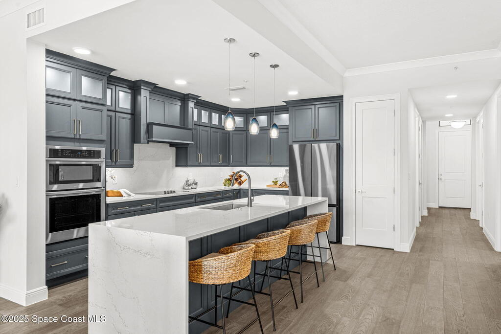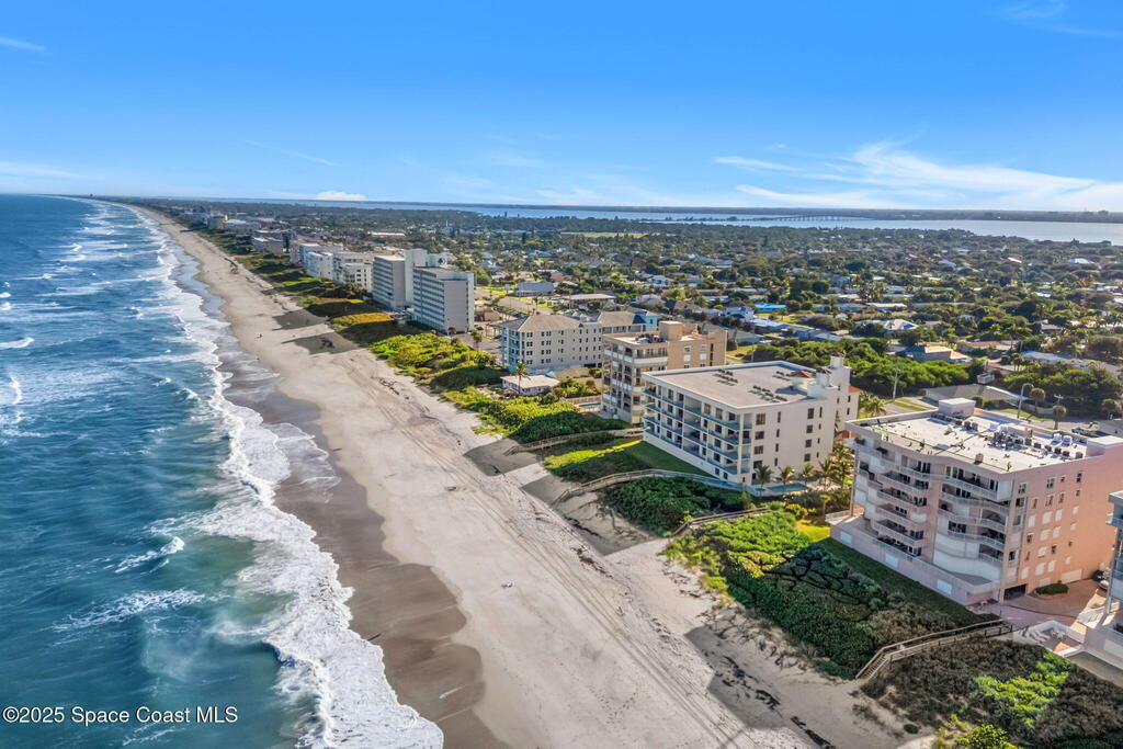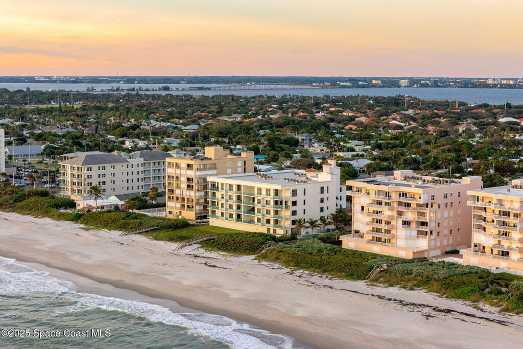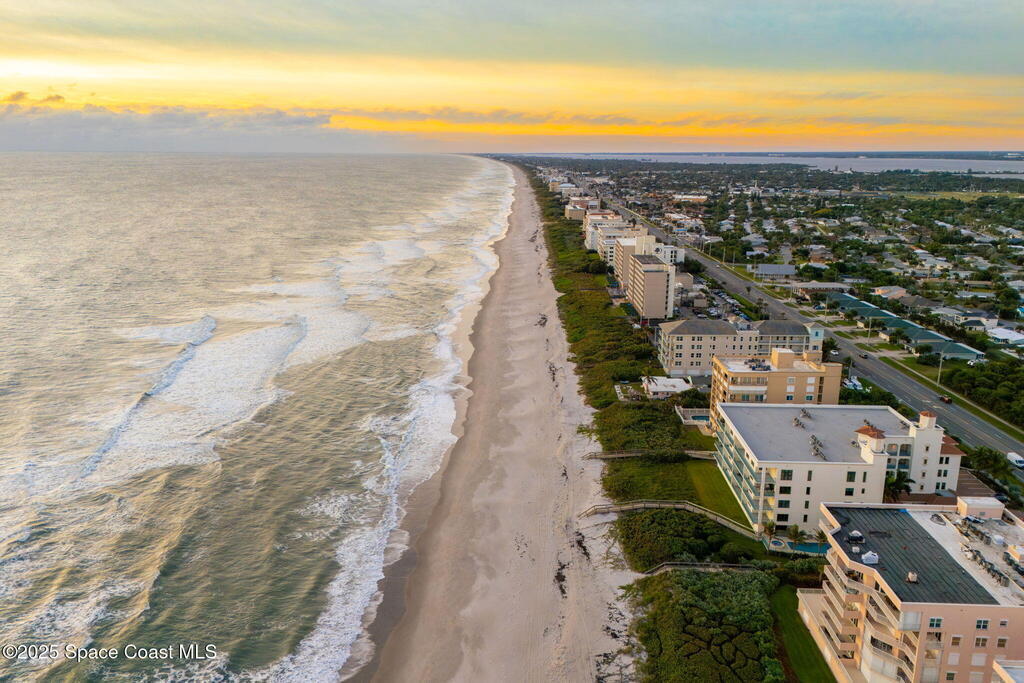 Welcome to The Palm Beach, one of the most exclusive oceanfront addresses on Florida's Space Coast. Built in 2022, this boutique Mediterranean-style building offers only 25 residences, designed to deliver privacy, luxury, and coastal serenity.Perched on the fourth floor, Unit 402 spans over 2,100 square feet with three bedrooms, three baths, and 10-foot ceilings that create an airy, open feel throughout. The interior features real wood flooring, impact-rated windows and doors, and a European-style kitchen with stainless steel appliances, a detached coffee bar, and elegant designer finishes. The primary suite includes a spa-inspired bath and a spacious walk-in closet, while the private balcony invites in the ocean breeze and sweeping Atlantic views. Amenities at The Palm Beach include a resort-style pool, hot tub, full fitness center, putting green, and an extensive grassy area perfect for pets.