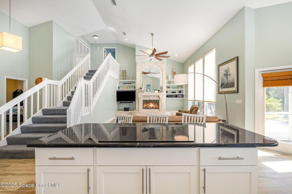 Direct river access. 3 car garage Home located on .35 acre, close to area of new custom homes. Masterfully renovated 5 bedroom, 3 full baths, plus half pool bath. 5th bedroom, ideal for office, hobby room or guest quarters with private entrance located off garage. Dedicated Master suite is upstairs. Porcelain tile flooring replaced on 1st level. Both downstairs bathrooms renovated. Custom eat in kitchen with granite counters. Family room with dramatic coquina fireplace. Formal dining room, living room, screened pool with waterfall. Upstairs Master suite with screened patio overlooking canal. Updated electrical panel & A/C compressor downstairs. Wood decking, dock & boat lift, lift max. 3,000 lbs.. No HOA