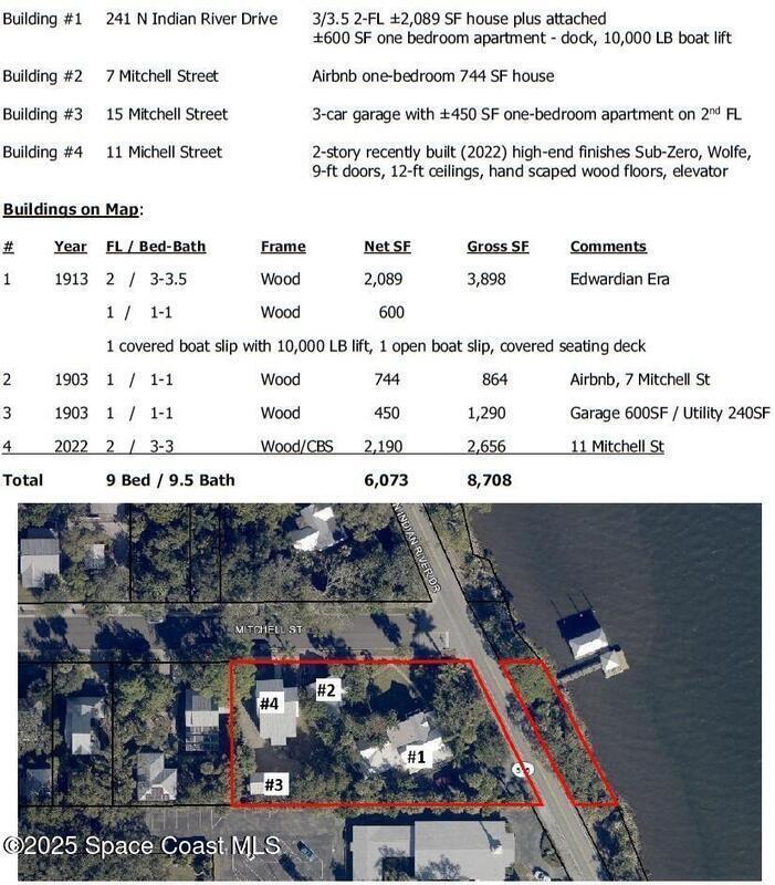 Rare opportunity to own a unique, income-producing waterfront property in Historic Cocoa Village! This Edwardian era fully furnished main house (former B&B) and furnished cottage (thriving Air BnB) sit on 133' of Indian River frontage with dock and 10,000 lb. boat lift. A stunning 2 level 2022 built home with elevator features a gourmet kitchen with Wolf gas range, Miele coffee maker, wine bar, brick accents, hand-scraped hardwood floors, and gorgeous views. Three spacious bedrooms and baths provide modern comforts. Property also includes a 3-car garage, utility room for tenants and a 1 bedroom apt above with patio and garden planters. All furniture in three buildings conveys, along with three active leases. Walk to Cocoa Village, watch rocket launches, walk, bike and run along the Indian River. Ideal for investors or multi-generational living!