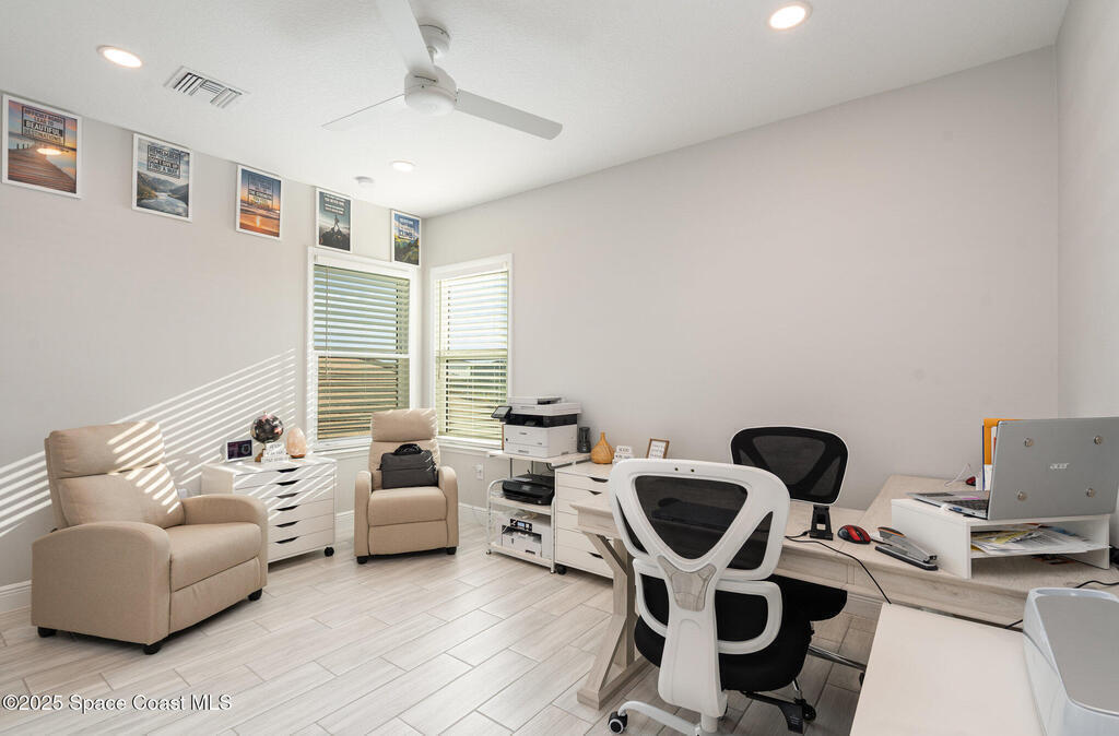Nearly new 2024-built home in Viera's exclusive Laurasia! This spacious 4-bedroom, 4.5-bath residence offers 3,690 sq ft of bright, open-concept living with soaring ceilings and effortless flow for everyday comfort or entertaining. The Gourmet Kitchen package dazzles with Level 4 cabinets, upgraded countertops, and a microwave drawer. Premium Level 3 flooring runs throughout, with matching tile upstairs. Unwind by a 6-ft electric fireplace set on a custom stone wall. Impact windows, a cell-phone booster, and abundant LED high-hat lighting on both floors elevate daily living. The primary suite adds a relaxing soaking tub and premium shower. A private study, laundry cabinets, and extra garage direct-line outlets add function. Outside, enjoy a premium lot with extra lanai outlets plus water and gas stubs, pool-service prep, and space to build your dream backyard oasis. Minutes to schools, parks, The Avenue Viera, beaches, I-95, and Space Coast employers--move-in ready. A MUST SEE!