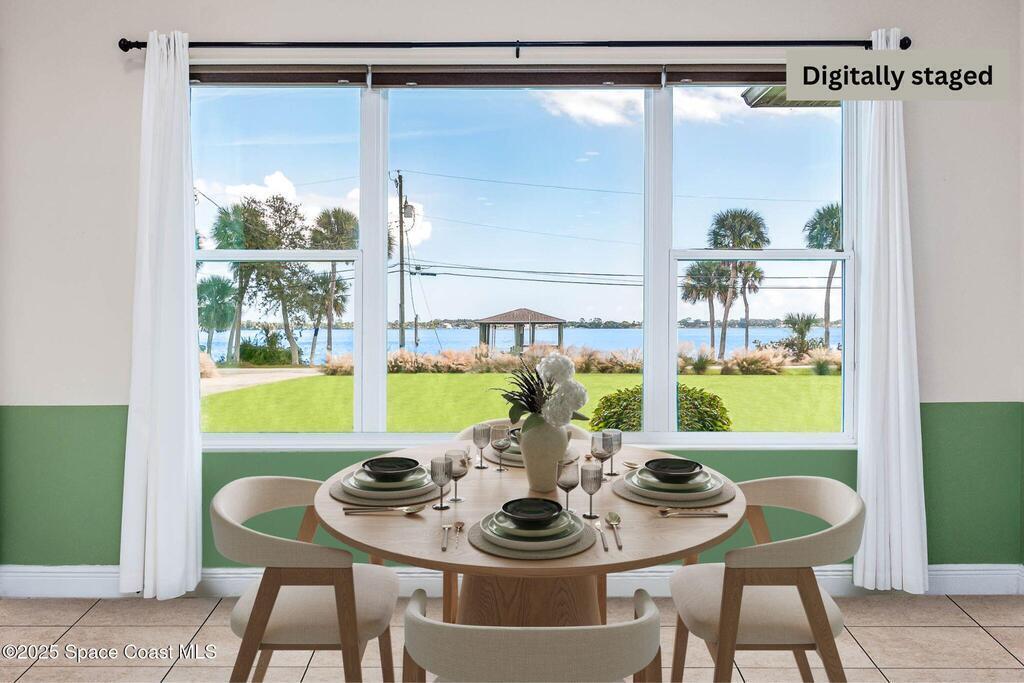 A rare opportunity for waterfront living on historic Rockledge Dr w/ a spectacular panorama of the Indian River, where dolphins & manatees are your daily neighbors. Your private, deep-water covered dock w/ a boat lift awaits on your nearly 1-ac. property. With 100 ft of shoreline, this is a perfect spot for boaters & nature lovers. Inside, 8 ft doors create a sense of space. The great room & dining area look out onto the water. The spacious kitchen is a chef's delight w/ shaker cabinets, granite counters & a walk-in pantry. Enjoy meals on the large screened front porch or relax on the quiet back porch overlooking the beautifully landscaped yard, maintained by a sprinkler system. A long driveway leads to a 3-car garage w/ an epoxy floor. The owner's suite is a spacious retreat w/ 3 closets, dual vanities, a walk-in shower, & separate tub. A guest bdrm also has its own full bath. Built for efficiency & peace of mind, this energy-smart home includes roll-down/accordion hurricane shutters