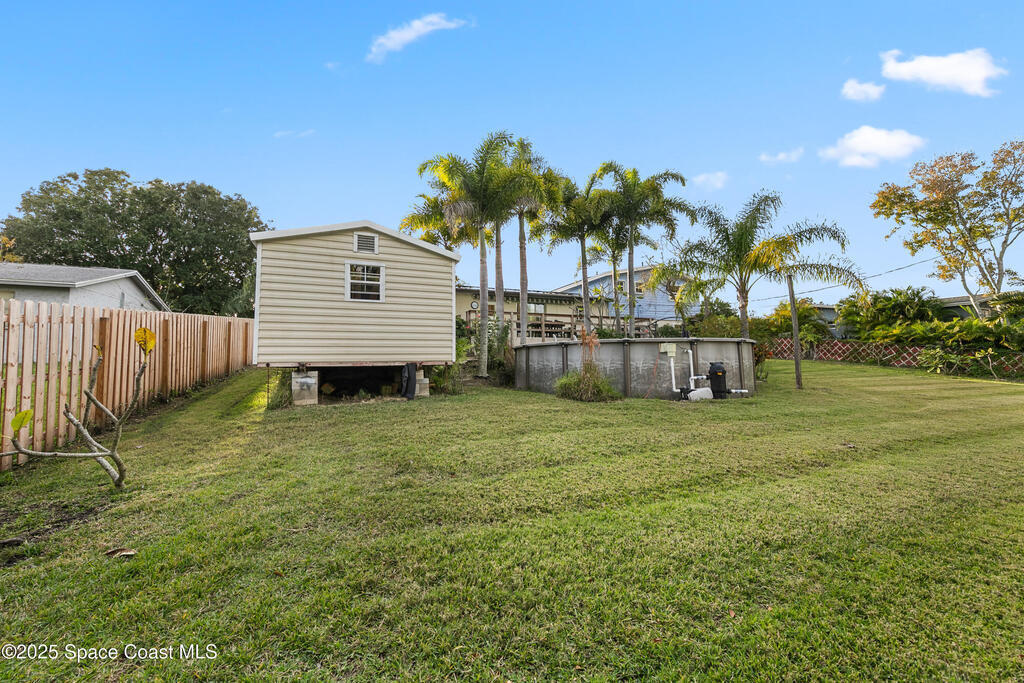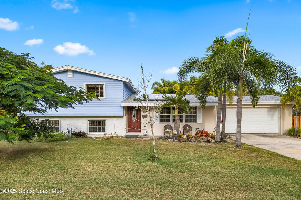 Split-level home with scenic backdrop overlooking Elbow Creek. Entry level features a living/dining room combo and updated kitchen with sliding doors to a large patio overlooking a lush backyard with palm trees, shrubs, and a mango tree. Upper level offers 3 bedrooms with wood floors and 2 baths. Lower level includes a spacious living room, bedroom, bath, and laundry room--ideal for an in-law suite or rental opportunity. Updates include new sewer lines throughout, roof (2022), water heater (2020), AC (2021), accordion shutters, brand new impact front door, new wood fence, and high-end kitchen appliances. Above-ground pool (4 yrs) with excellent pump system. Extra concrete slab on SW side accommodates boat, trailer, or RV. Oversized shed frees garage for parking. New Hardie board siding on 2-story section. Centrally located minutes to Downtown Eau Gallie, shopping, dining, and the beach.