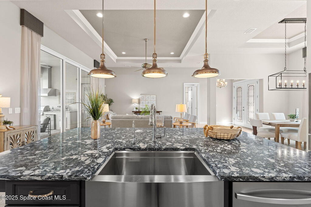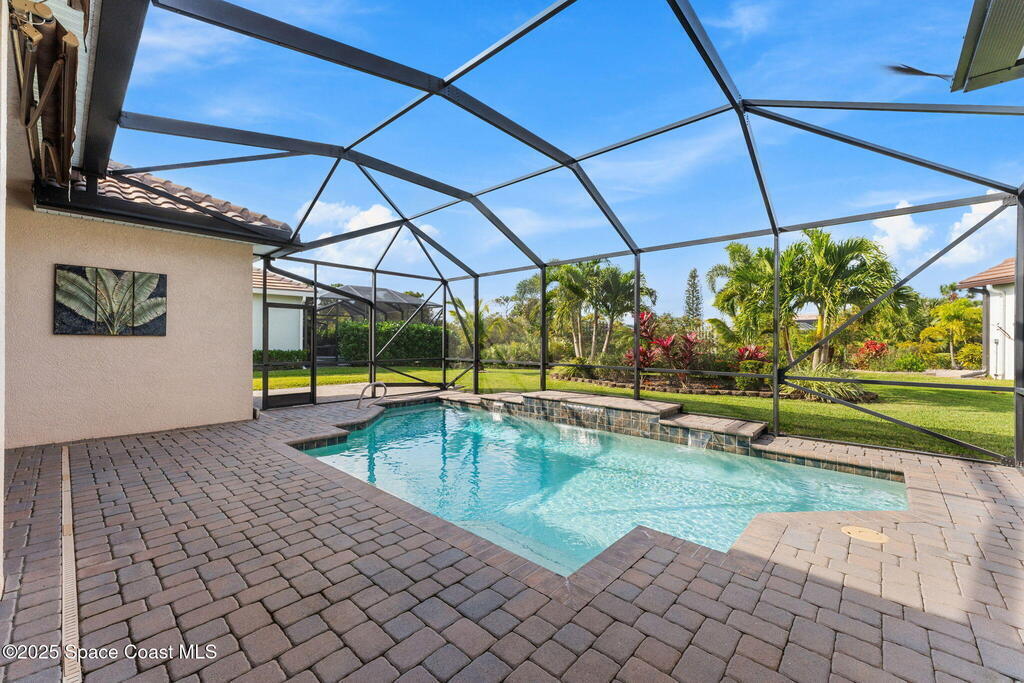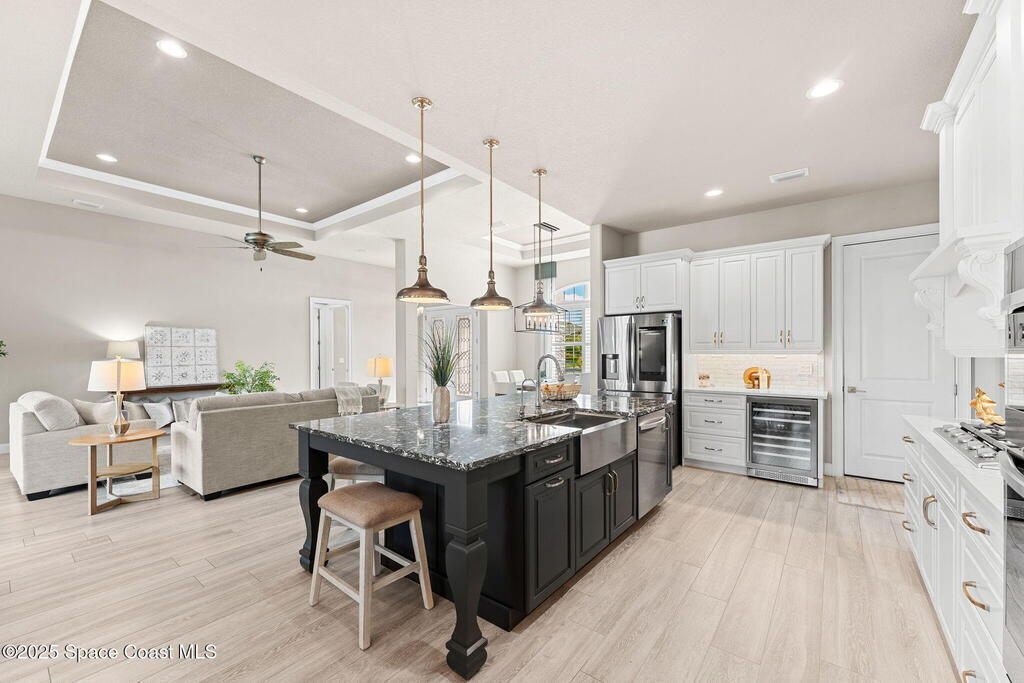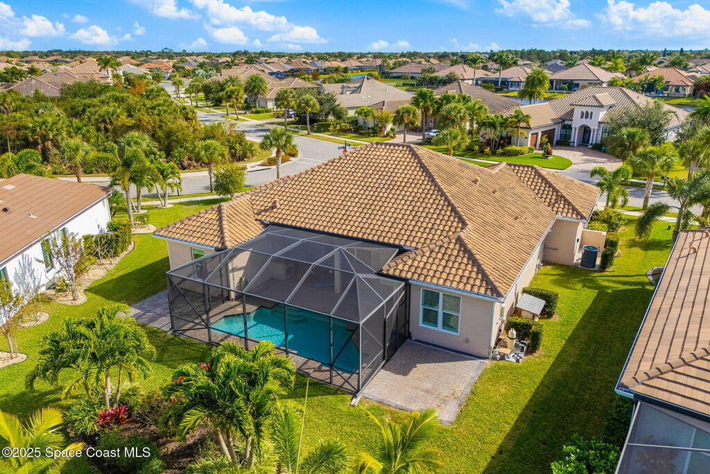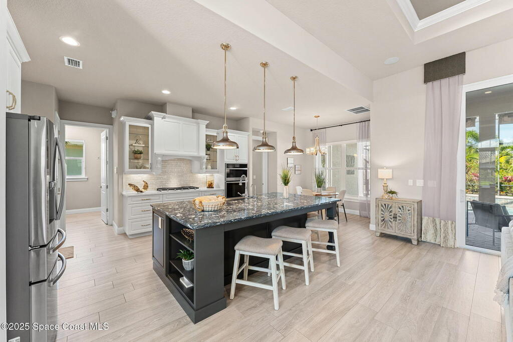 Vaulted ceilings, wall-to-wall tile, and a wide-open layout define this former model home in gated St. Andrews Manor, where upgrades shape the way it lives. Granite countertops elevate the kitchen, and both the indoor and outdoor kitchens have exhaust fans. Impact windows and electric roll-down storm doors simplify storm prep, backed by a whole-house surge protector, reverse osmosis system, and a gas Generac 22kW generator. A split-bedroom design preserves privacy, highlighted by a guest suite with a built-in wet bar, drink fridge, and custom cabinetry. Outside, an electric awning shades the lanai, a saltwater pool anchors the space, and rear gutters drain to preserve the backyard. A 3-car garage, 2020 washer and dryer, and 2023 oven complete a home that feels polished, prepared, and perfectly placed in one of the area's most convenient and highly desirable gated communities.