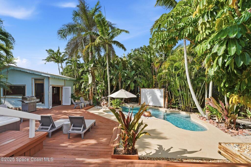 Welcome to Exclusive Tropical Paradise, where mid century character meets modern ease, just steps from the beach and tucked into a lush, Florida poolside escape. Imagine being on your own private island with a fully remodeled concrete block home featuring a split bedroom floor plan, central living spaces, impact windows, upgraded kitchen and baths, and a tropical backyard retreat with a built in tiki bar on a spacious quarter acre lot. With neighbors on only two sides and a private alley behind, privacy is a standout feature. This oasis works just as beautifully as a personal residence as it does as an investment. It has been a top performing Cocoa Beach vacation rental for the past six years, and offered fully turnkey. The location seals the deal. Access to a more remote section of the beach and minutes to Cocoa Beach, you are close to dining, shopping, and local favorites while still enjoying a quiet, one of a kind setting.