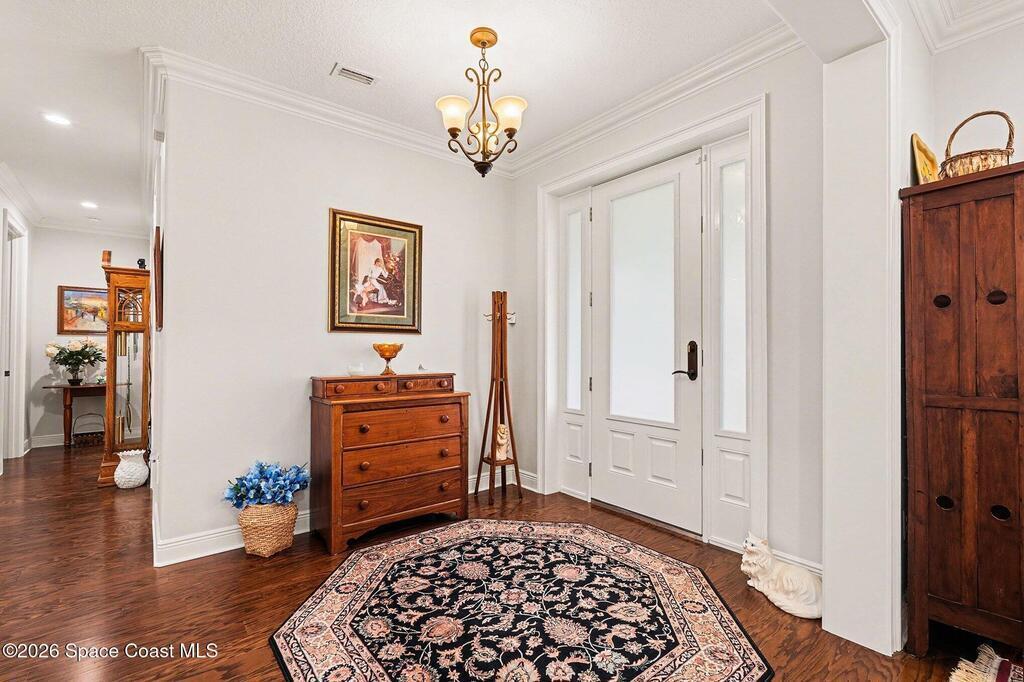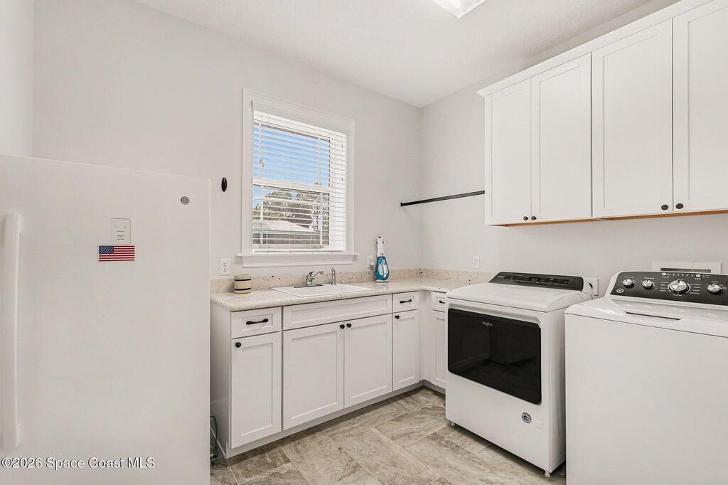 Custom-built in 2021, this beautifully designed 3-bedroom, 3.5-bath home sits on a private .78-acre lot in Titusville, Florida, near the Indian River and Space Coast amenities. The split floor plan features a metal roof, hurricane impact windows, and a whole-house natural gas Generac generator for seamless power. Open-concept living includes formal dining, great room, sunroom, breakfast bar, and nook with 9' ceilings and 8' doors throughout. The chef's kitchen offers quartz countertops, a large island, walk-in pantry, pull-out cabinetry, and a natural gas range with exterior-vented hood. The primary suite includes an attached office, dual walk-in closets, soaking tub, separate shower, and dual vanities. Additional features include a second office, large indoor laundry room, central vacuum, two HVAC systems. 2-car garage with epoxy floors. Detached climate-controlled workshop with impact windows, epoxy floors, carport, and pavered drive and walkways. Check out the video!