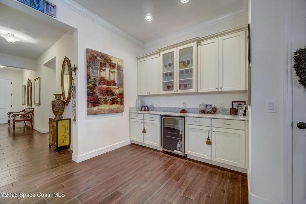 Perfectly situated in the heart of Cocoa Beach, just steps from both the Atlantic Ocean and the Banana River, this stunning beachside villa offers the best of coastal living. This concrete block home with a tile roof and hurricane-impact windows is truly move-in ready and designed for comfort, style, and durability. Spacious 3-bedroom, 2.5-bath residence features 12-foot ceilings and beautiful wood-look tile flooring throughout. Open and airy living spaces include a formal dining room and family room, ideal for everyday living and entertaining. The stylish kitchen is the heart of the home, showcasing granite countertops, stainless steel appliances, a beverage cooler, coffee bar, and custom soft-close cabinetry. The primary suite offers a peaceful retreat with a large walk-in closet and a luxurious en-suite bath featuring double sinks and an oversized Roman shower. A well-appointed laundry room with built-in cabinetry adds both convenience and storage. Located on a private corner lot