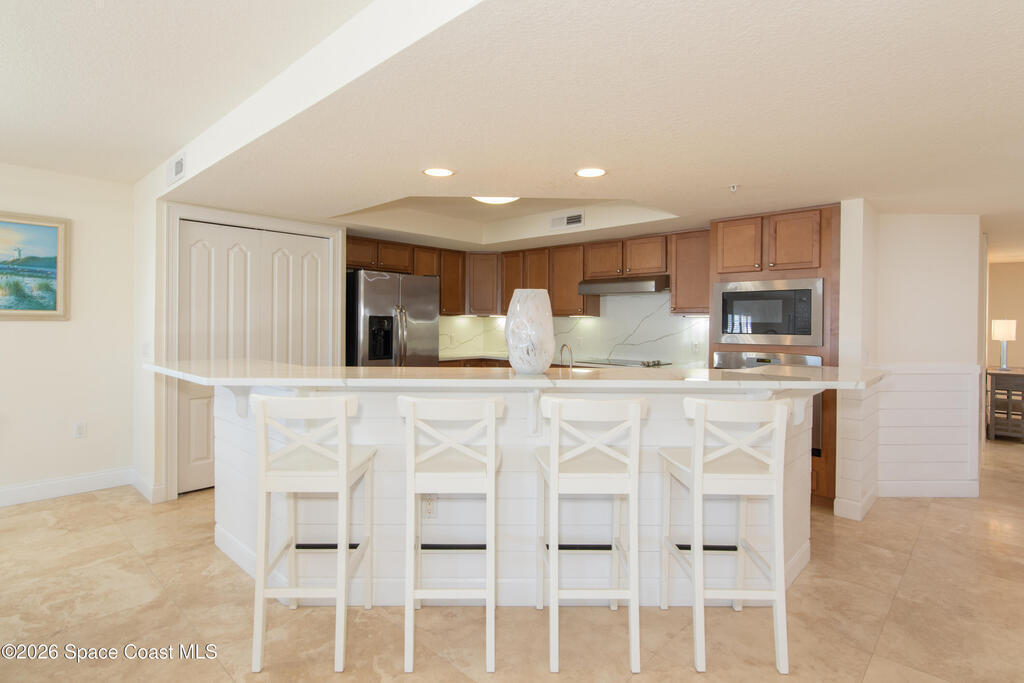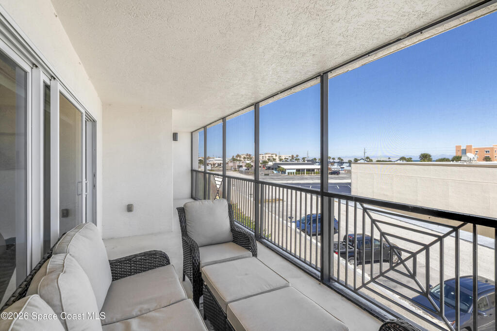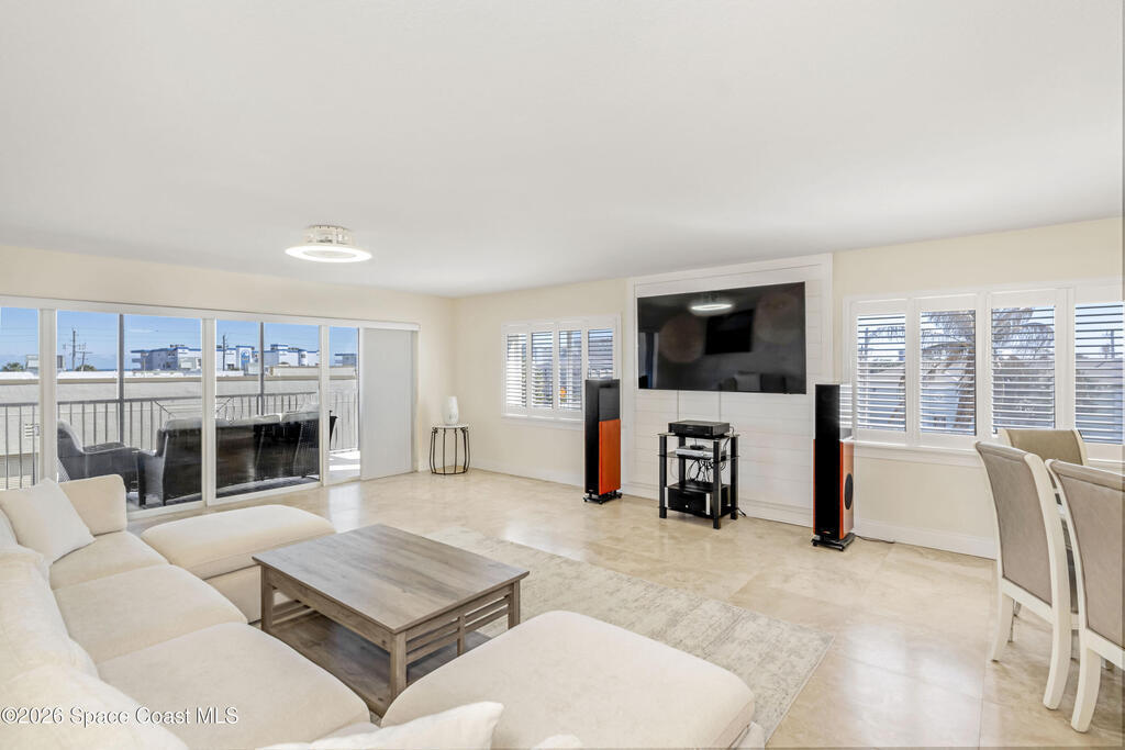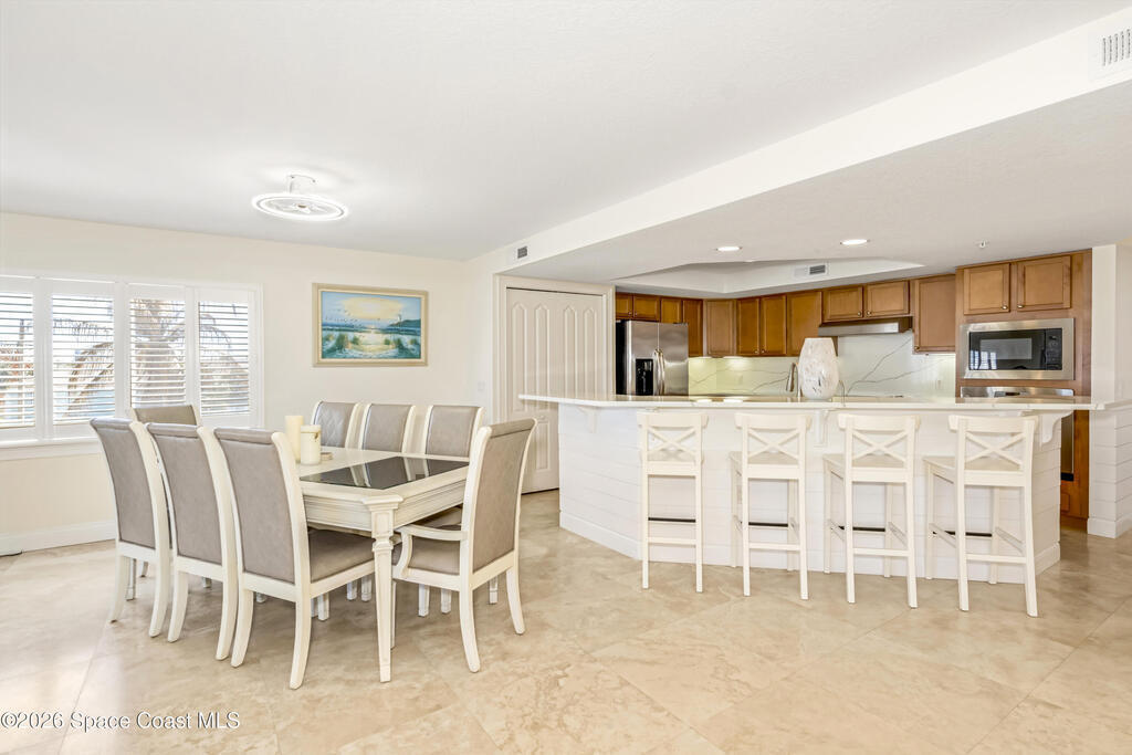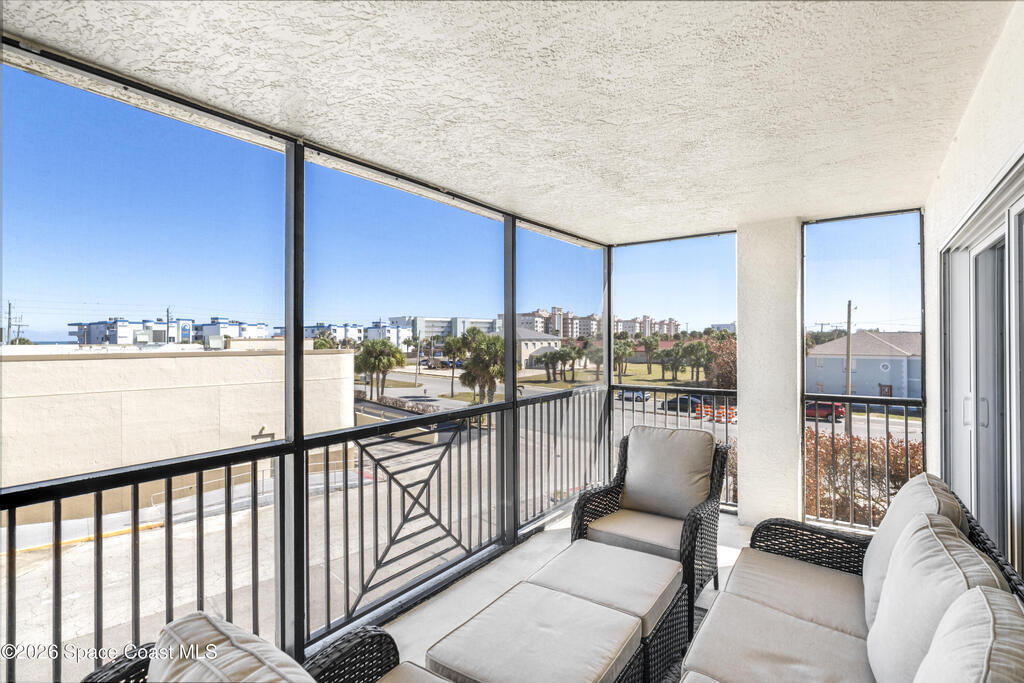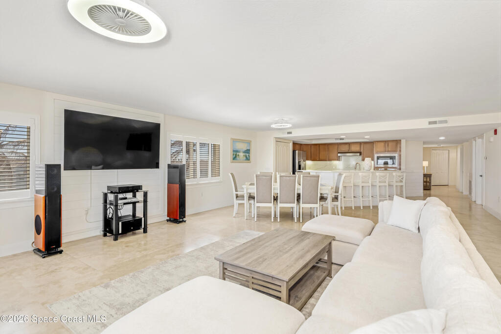 THE ULTIMATE BEACHSIDE HIDEAWAY: LUXURY CORNER END-UNIT + 2 GARAGE SPACES. Just steps to the sand, approximately 200 yards to the beach via a dedicated pedestrian walkway, this rare Southeast corner end-unit delivers extra privacy, abundant natural light, and turn-key coastal upgrades. Fully renovated with travertine stone flooring throughout, absolutely zero carpet. Stunning gourmet kitchen featuring a massive white quartz waterfall island, updated cabinetry, and designer shiplap millwork for a custom, high-end feel. Spa-inspired bathrooms with quartz vanities, updated showers, and modern fixtures. Impact windows, custom plantation shutters, and newer washer, dryer, and hot water tank (approx. 2 years). The golden ticket is parking: TWO deeded spaces, private enclosed garage plus coveted under-building space . Resort-style Palm Springs amenities include pool, clubhouse, fitness center, tennis and pickleball. Walk to dining, shopping, and beach living made easy.