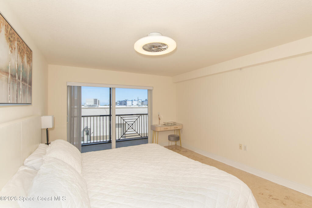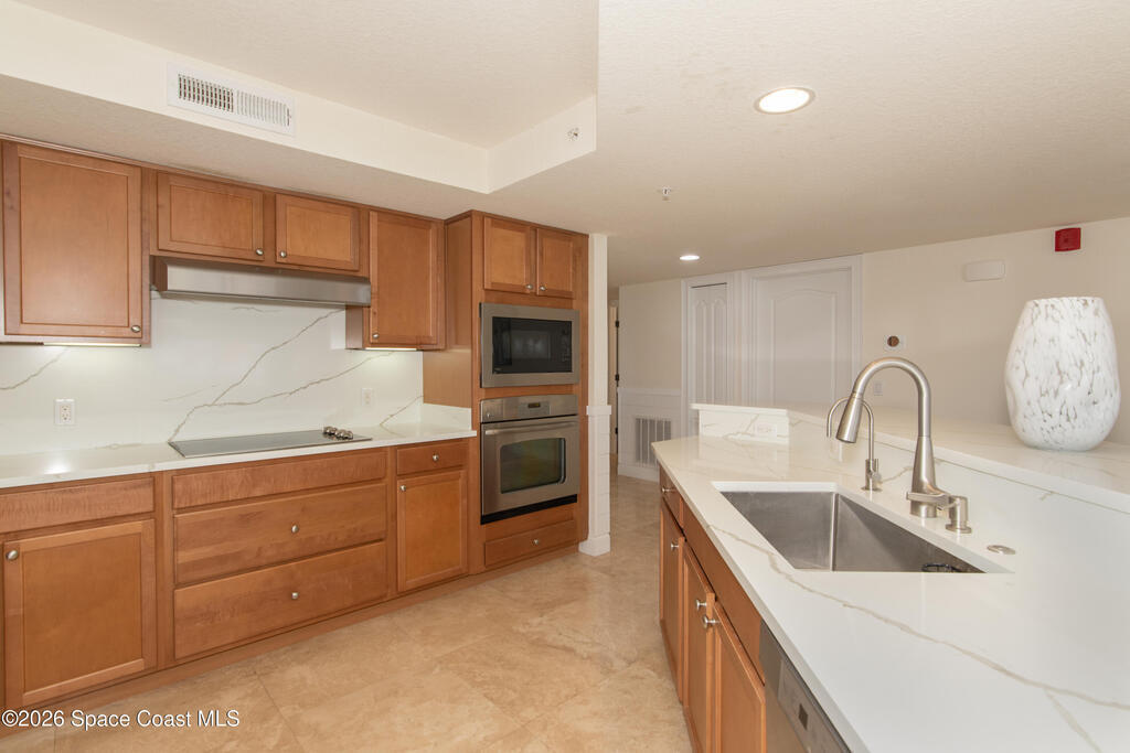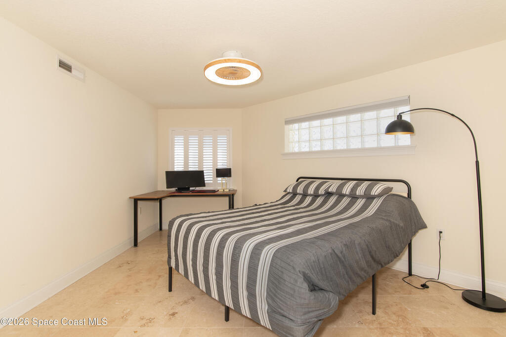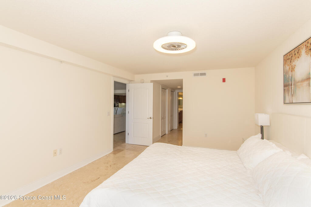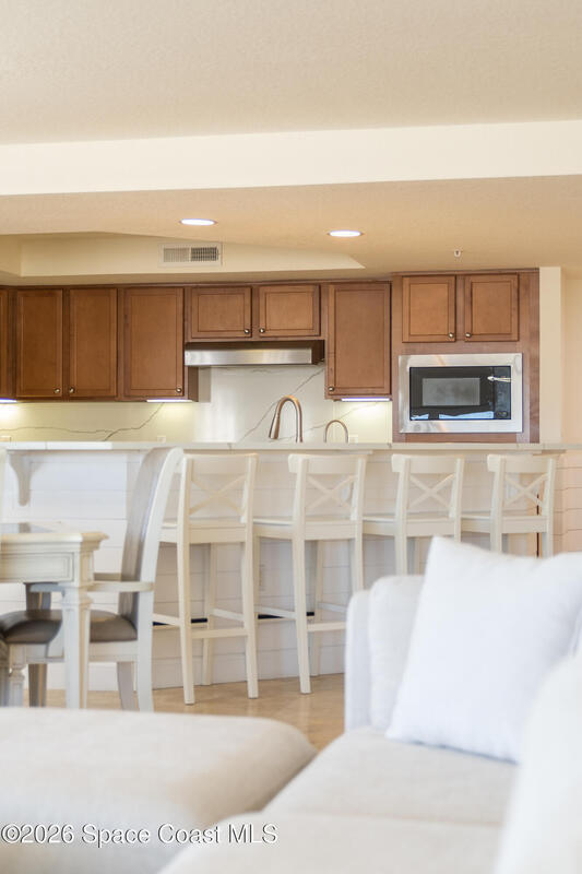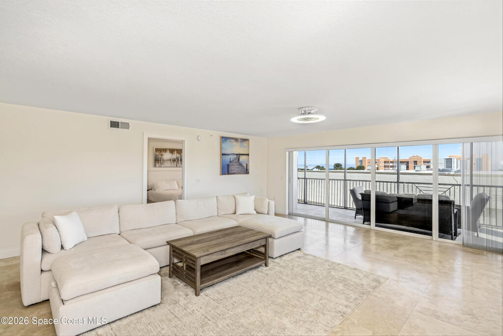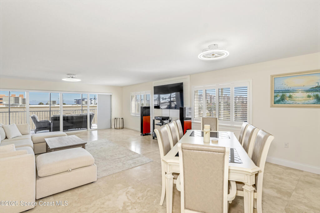 THE ULTIMATE BEACHSIDE HIDEAWAY: LUXURY CORNER END-UNIT + 2 GARAGE SPACES. Just steps to the sand, approximately 200 yards to the beach via a dedicated pedestrian walkway, this rare Southeast corner end-unit delivers extra privacy, abundant natural light, and turn-key coastal upgrades. Fully renovated with travertine stone flooring throughout, absolutely zero carpet. Stunning gourmet kitchen featuring a massive white quartz waterfall island, updated cabinetry, and designer shiplap millwork for a custom, high-end feel. Spa-inspired bathrooms with quartz vanities, updated showers, and modern fixtures. Impact windows, custom plantation shutters, and newer washer, dryer, and hot water tank (approx. 2 years). The golden ticket is parking: TWO deeded spaces, private enclosed garage plus coveted under-building space . Resort-style Palm Springs amenities include pool, clubhouse, fitness center, tennis and pickleball. Walk to dining, shopping, and beach living made easy.