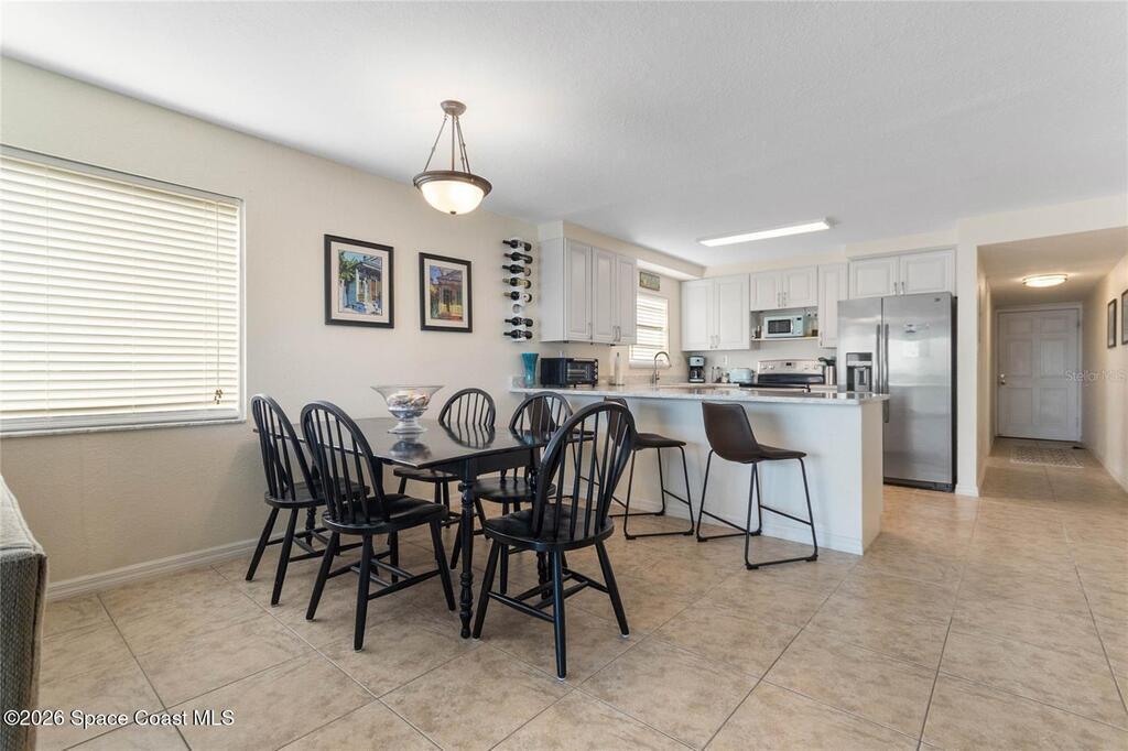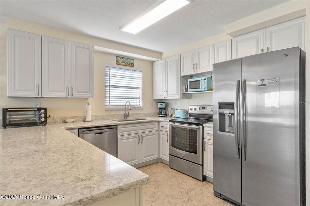 Wake up to endless ocean views and the soothing rhythm of the Atlantic in this direct oceanfront 3-bedroom, 2-bath corner residence on Cocoa Beach. Perched on the fourth floor, this light-filled condo offers sweeping, unobstructed water views from every angle and an expansive private balcony--perfect for sunrise coffee and sunset cocktails. Designed for relaxed coastal living, the redesigned 2023 kitchen features new cabinetry, granite countertops, counter-height bar, and stainless-steel appliances. The spacious primary suite is a true retreat with ocean views, balcony access, and dual closets. Upgrades include tile flooring, hurricane-rated sliders, updated lighting, refreshed baths, in-unit washer/dryer, new HVAC and water heater (2024), and newer front screen door. One-car garage provides ideal beach gear storage. Three-way split plan ensures privacy. Offered fully furnished and turnkey. Building completed concrete restoration (2024-25), pool renovation, and Milestone Inspection.