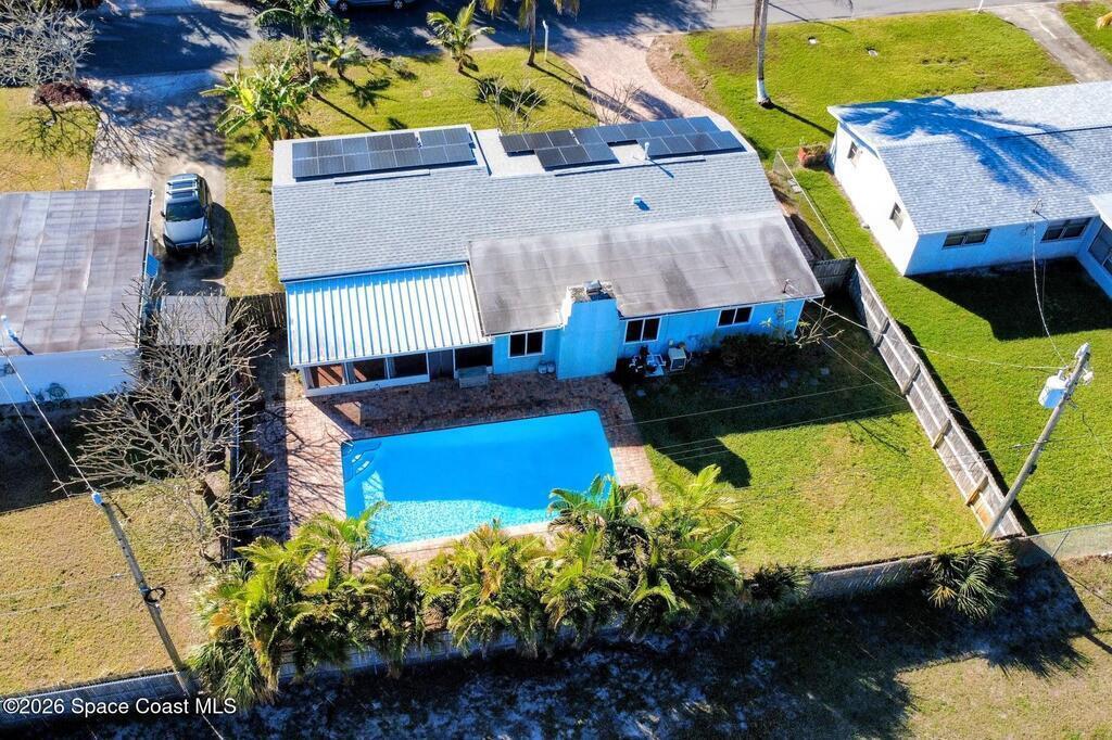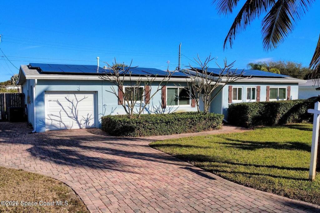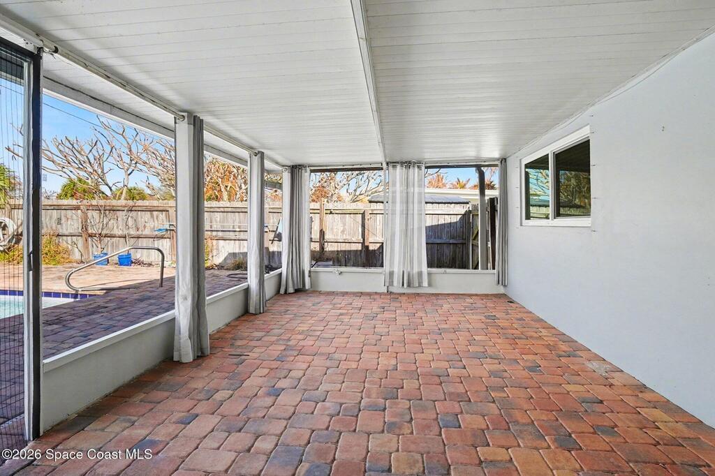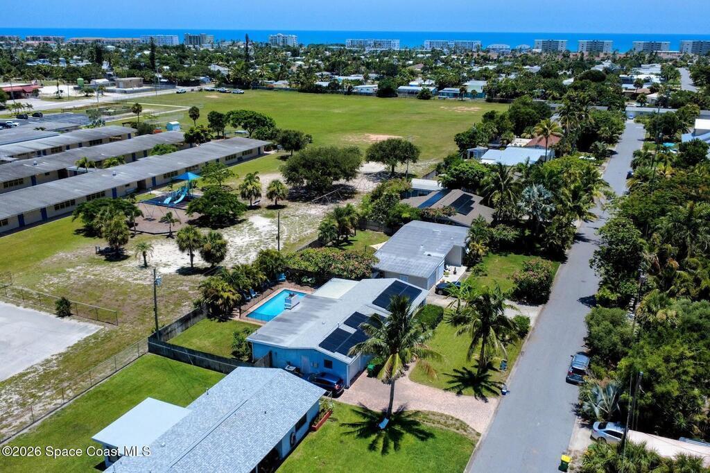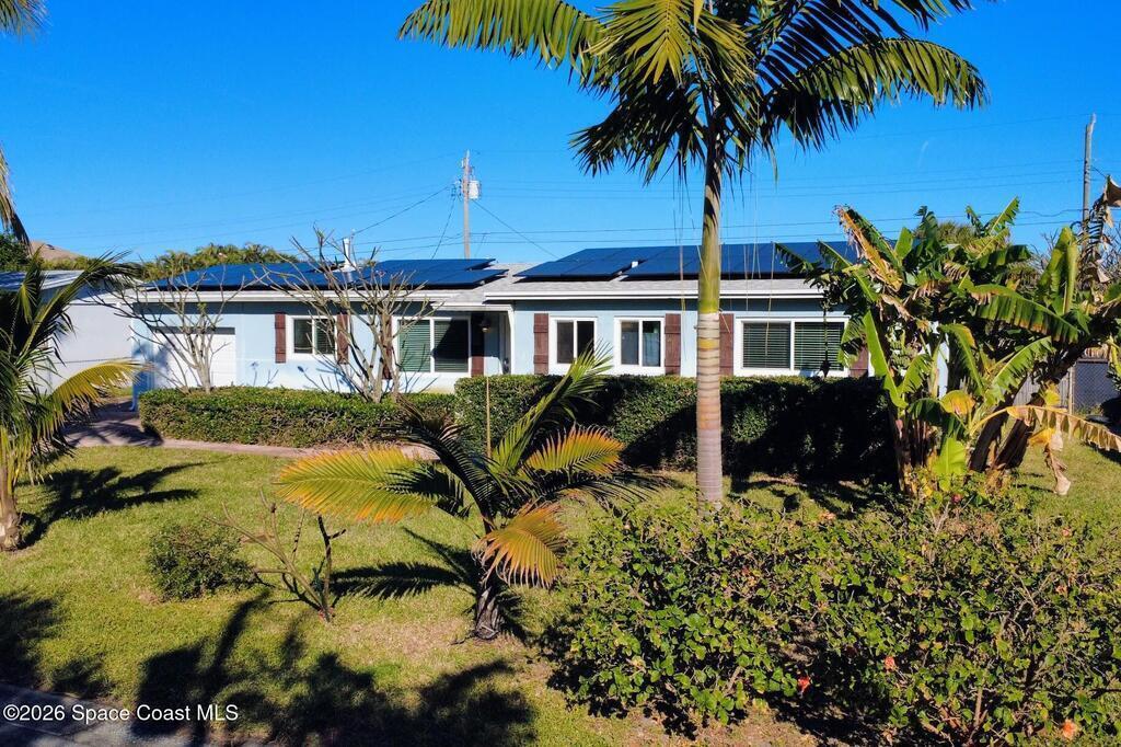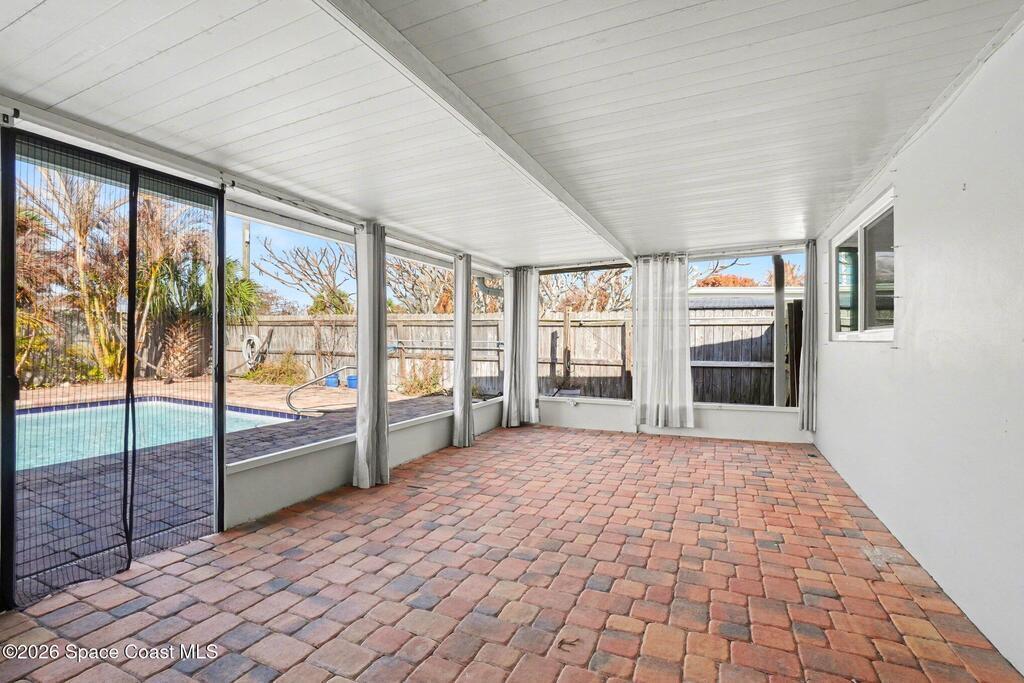 Updated 4-bedroom, 2-bath beachside pool home just blocks from the ocean in unincorporated Brevard County, offering the benefit of lower property taxes and coastal living. The open floor plan features an updated kitchen with granite countertops, stainless steel appliances, wood-look tile flooring throughout, and beautifully remodeled bathrooms. Major upgrades include a 2024 roof, 2019 AC, 2019 energy-efficient windows, hurricane shutters, impact rated front and rear doors, a 100% paid-off solar system, PVC sewer line from the house to the road, and the sellers are in the process of lining the remaining cast iron. Outside, the fully fenced backyard offers a large pool, brick paver deck, gas heater, and screened enclosure for easy Florida living.