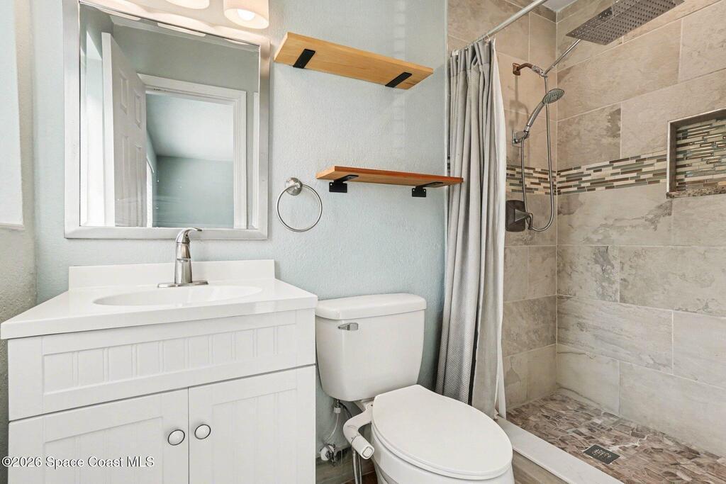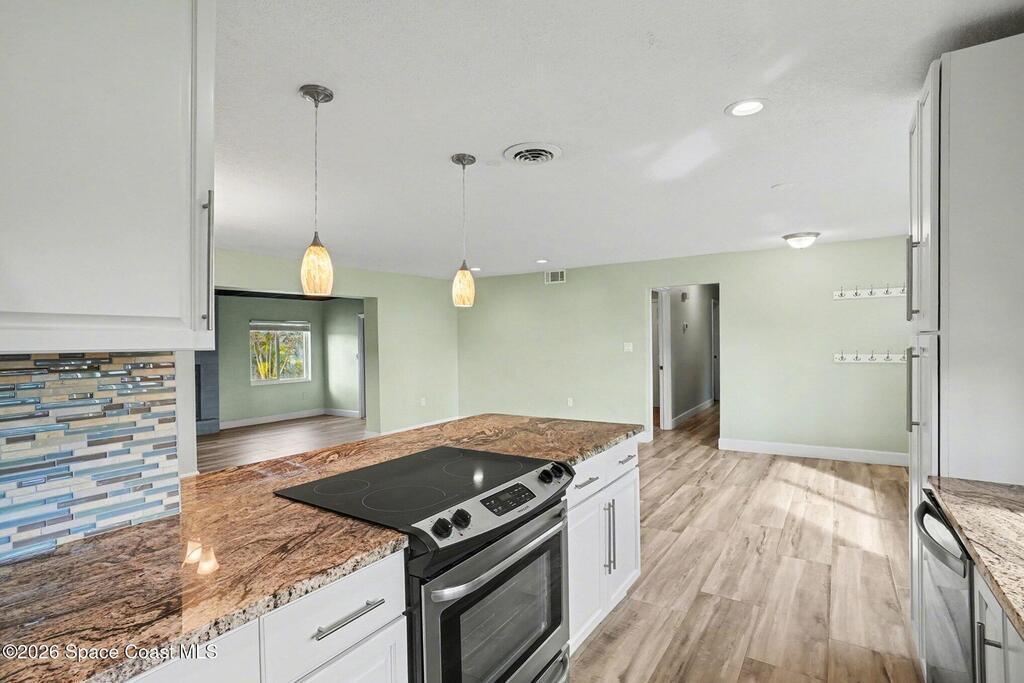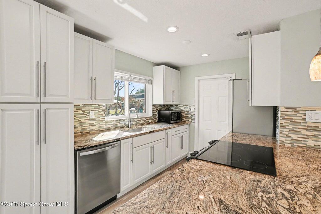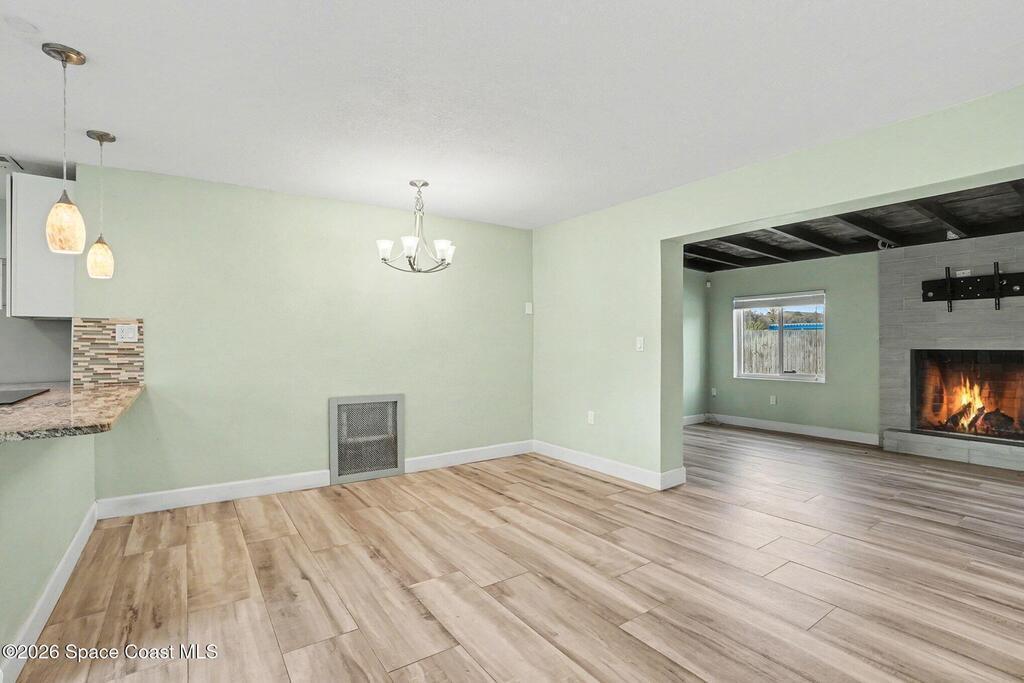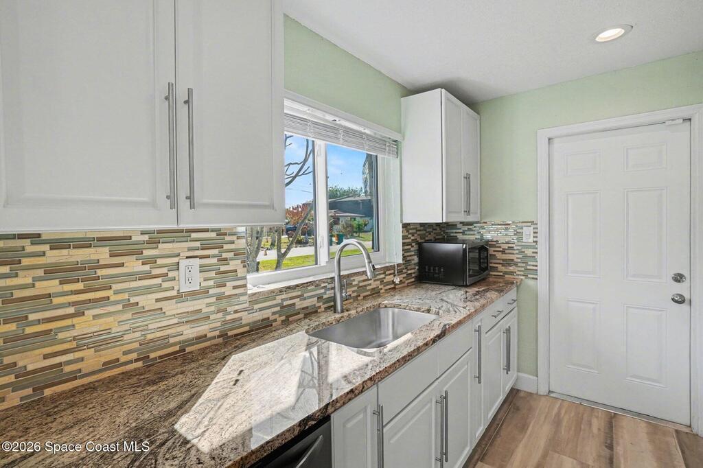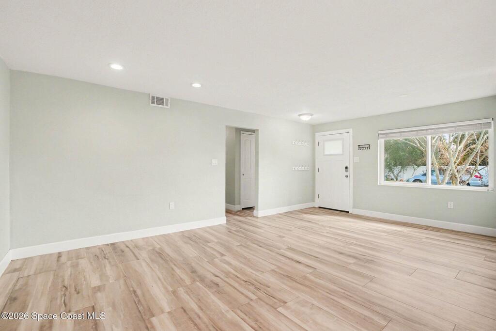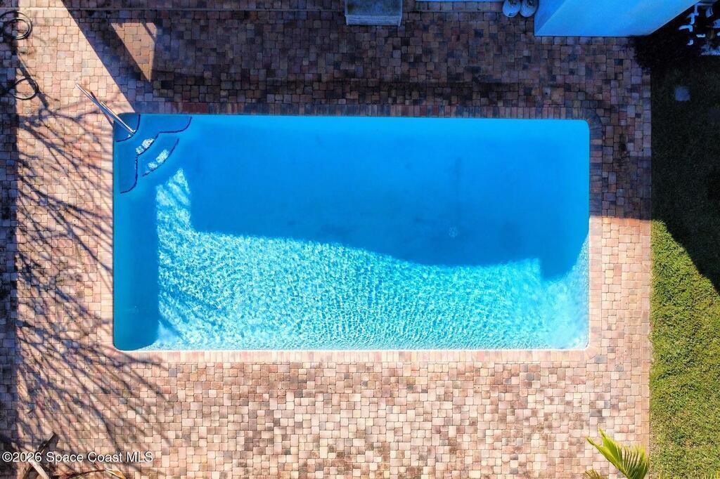 Updated 4-bedroom, 2-bath beachside pool home just blocks from the ocean in unincorporated Brevard County, offering the benefit of lower property taxes and coastal living. The open floor plan features an updated kitchen with granite countertops, stainless steel appliances, wood-look tile flooring throughout, and beautifully remodeled bathrooms. Major upgrades include a 2024 roof, 2019 AC, 2019 energy-efficient windows, hurricane shutters, impact rated front and rear doors, a 100% paid-off solar system, PVC sewer line from the house to the road, and the sellers are in the process of lining the remaining cast iron. Outside, the fully fenced backyard offers a large pool, brick paver deck, gas heater, and screened enclosure for easy Florida living.