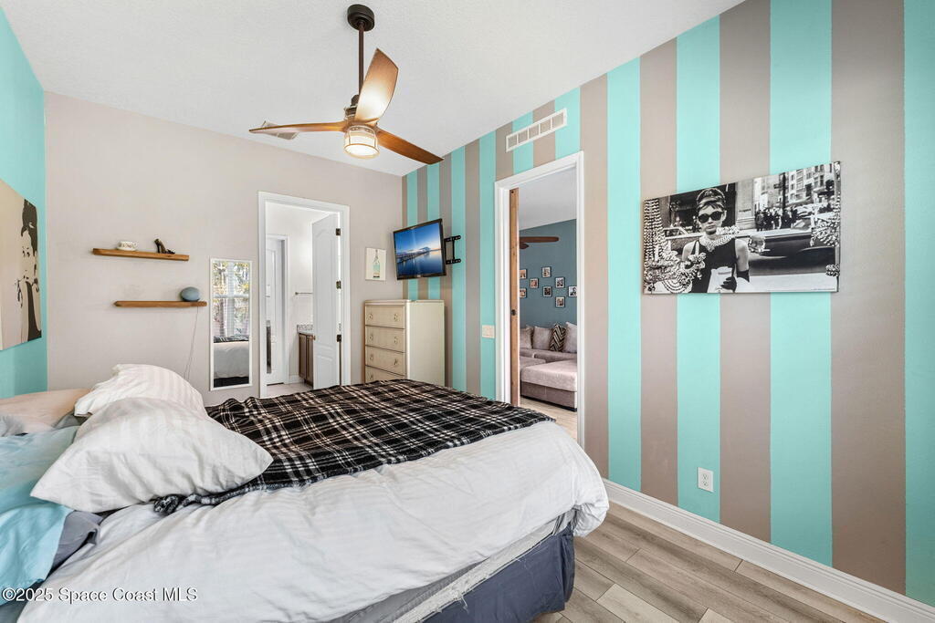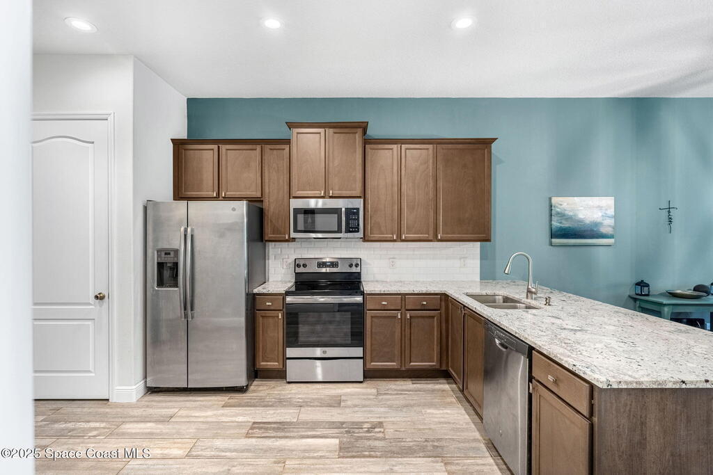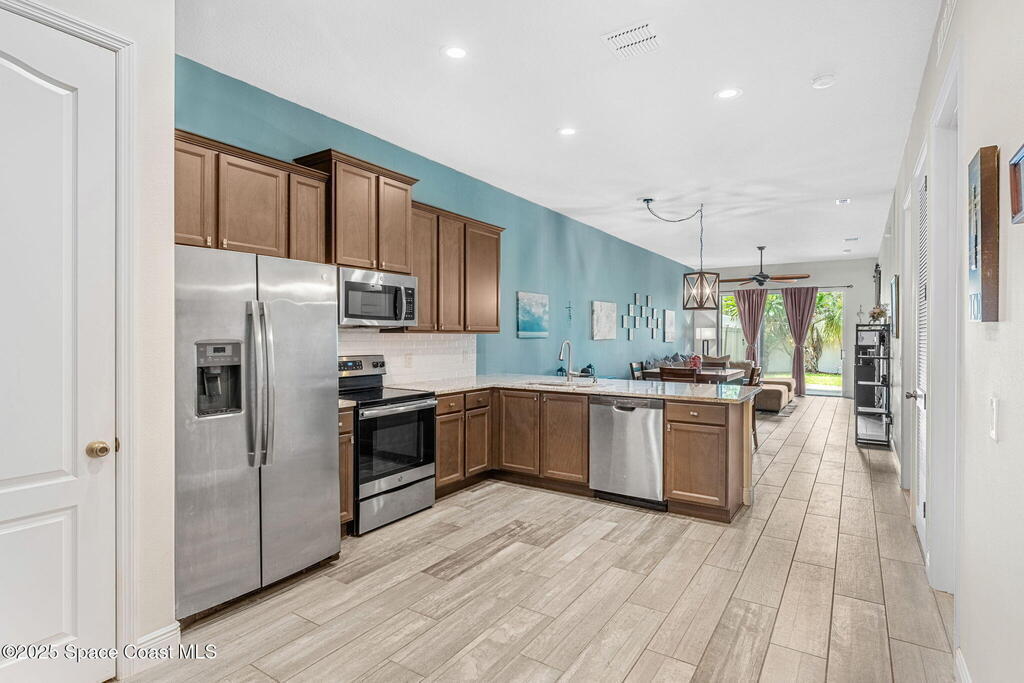 Beautifully open and confidently modern, this home welcomes you with soaring ceilings, wood-look tile underfoot, and wide baseboards that give every room a crisp, finished edge. The kitchen steals the spotlight with crown-topped cabinetry, stainless appliances, granite counters, a long counter-height breakfast bar built for gathering, and a walk-in pantry ready for real-life grocery runs. Generous living and dining spaces glide to a triple disappearing slider that opens to a covered porch made for year-round lounging, framed by tropical greenery in a private, fully fenced backyard. The primary suite delivers with a spacious walk-in closet, dual granite vanities, plenty of counter space, and a tiled shower with coastal character. A flexible second bedroom, granite-accented guest bath, in-home laundry, and an attached two-car garage complete the package. All tucked inside a gated community with a pool, clubhouse, fitness center, and more--just an easy bike ride to the beach.