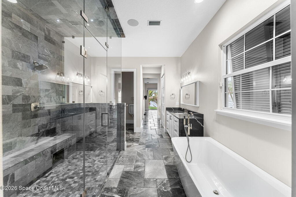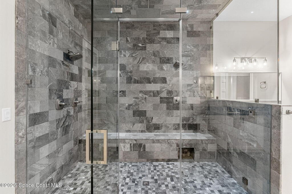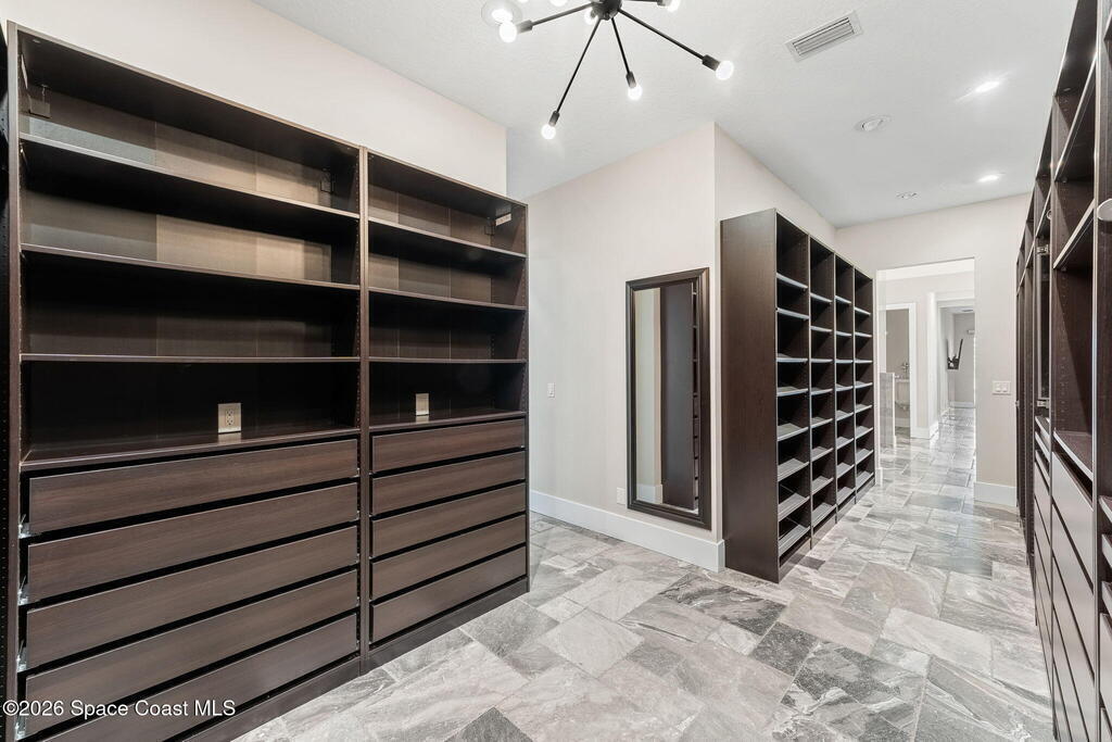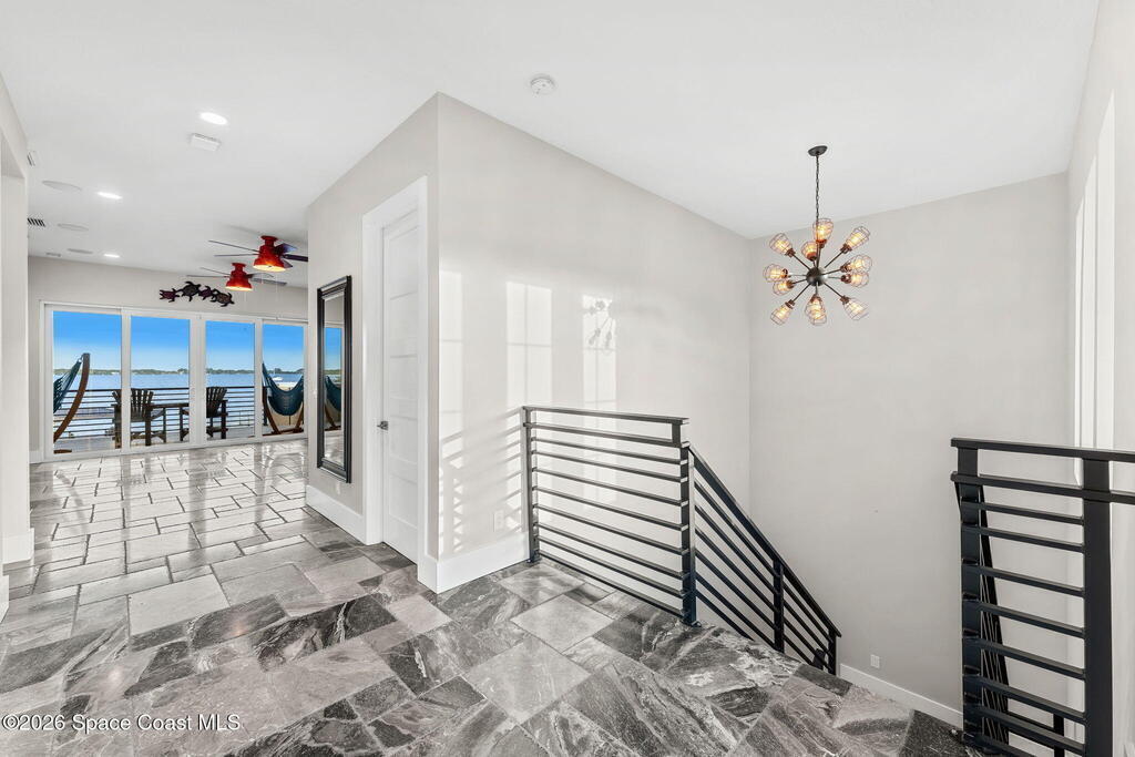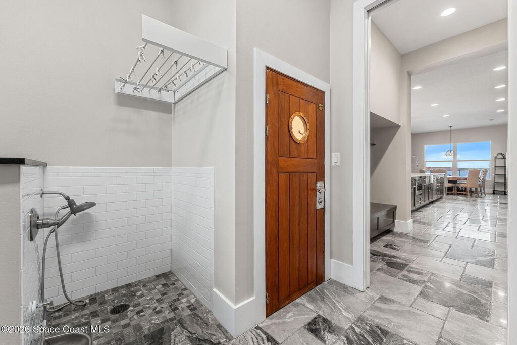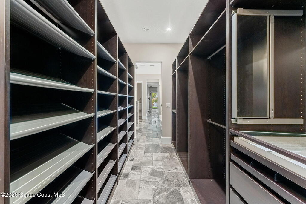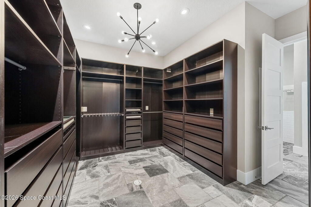 The ultimate private classic car showroom and motorcoach retreat. Stunning custom riverfront home w/ 8-car garage plus 10,000 lb tandem lift for your curated vehicle collection, additional high-clearance, 55 ft RV/boat garage w/ full hookups. A mariner's paradise w/ 110 ft open water frontage, a granite rock shoreline, and direct views of the intracoastal river. Custom dock w/ 2 lifts to accommodate up to a 30 ft boat with shore power. Enhanced solid poured concrete exterior, freshly painted and sealed, 5 bed 4.5 bath home w/ infinity edge saltwater pool and built-in spa, summer kitchen w/ custom Kalamazoo cabinetry and marine grade stainless steel grille. Impact sliding glass pocket doors w/ expansive river views, custom imported marble floors. Primary suite w/ custom walk-in steam shower and a freestanding soaker tub, and a massive walk-in closet leading to the laundry room. Chef's kitchen w/ 15 ft quartz island w/ waterfall edges, but the hidden butler's pantry steals the show.
