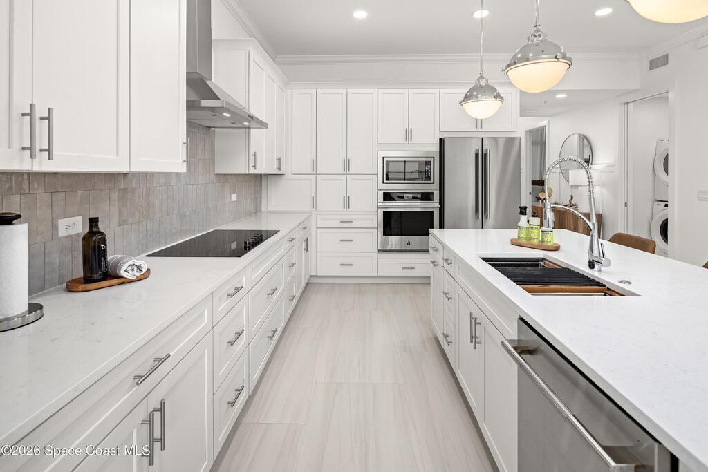 - Equipment/AppliancesDishwasher, Disposal, Electric Cooktop, Electric Oven, Electric Water Heater, Ice Maker, Microwave, Refrigerator, Washer/Dryer Stacked and Wine Cooler