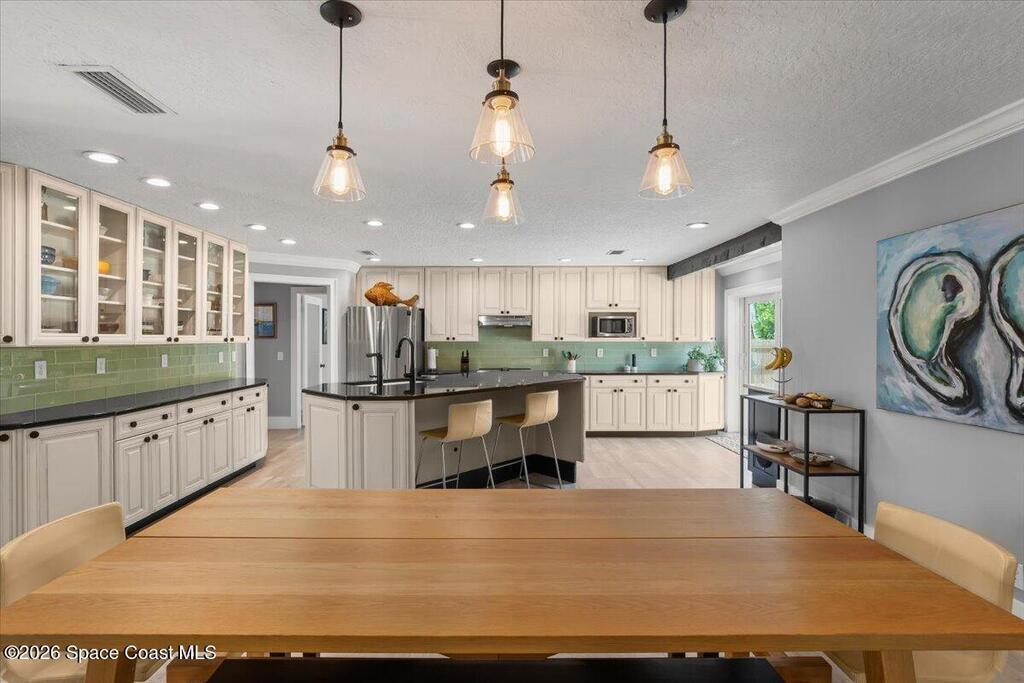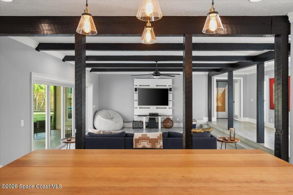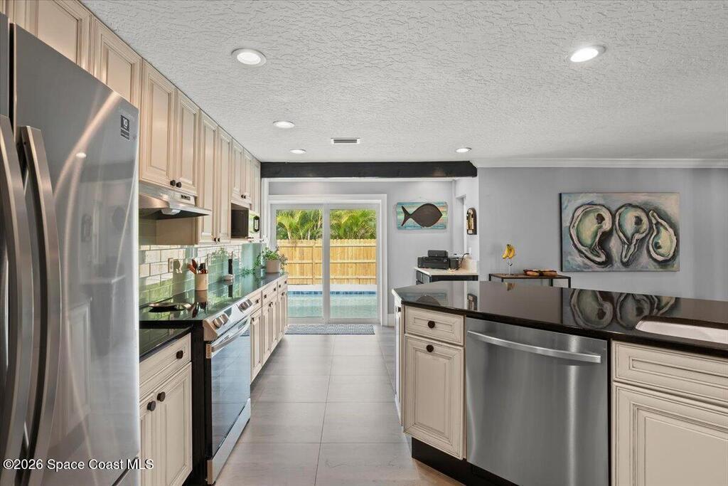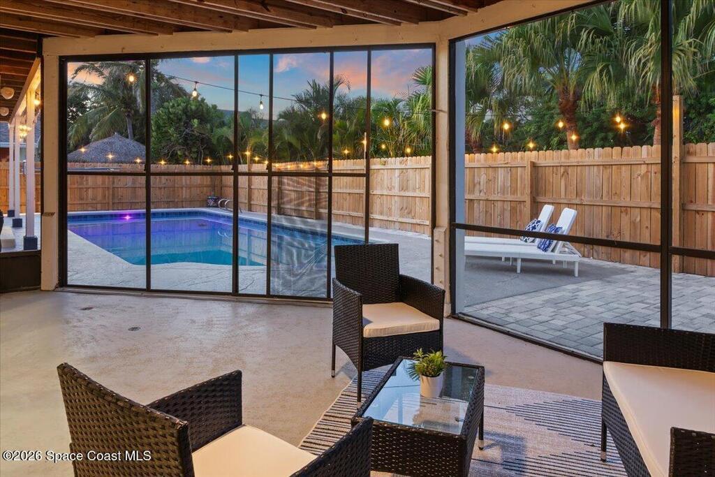 A beachside oasis--thoughtfully and extensively updated to offer modern comfort with true peace of mind. This 3/2 + Flex room home showcases a newer roof, upgraded PEX plumbing, impact-rated features, fully upgraded air conditioning, and a long list of additional high-quality improvements throughout. The split, open-concept floor plan is both functional and inviting, featuring spacious bedrooms, remodeled bathrooms, custom closet built-ins, and a versatile bonus flex room ideal for a home office or gym.Designed for effortless indoor-outdoor living, the home opens to a private backyard retreat with a large, beautifully updated pool and resurfaced deck --perfect for entertaining or relaxing after a day at the beach. Additional highlights include a circular drive with ample parking, boat/RV pad, extra spacious garage, new fencing, and an outdoor shower. With modern finishes and meticulous care evident at every turn, this coastal retreat located between the causeways is one of a kind!