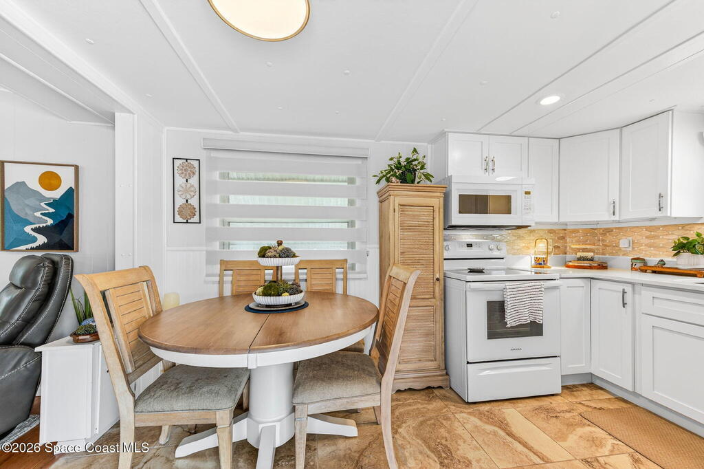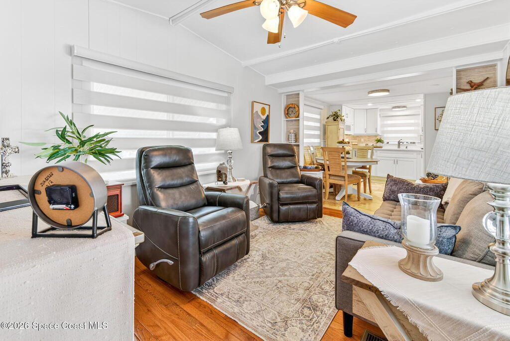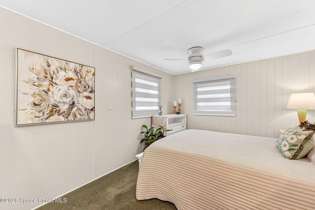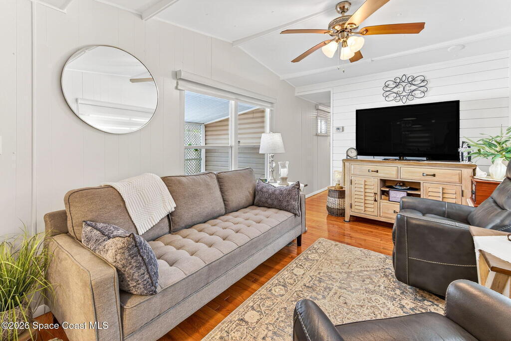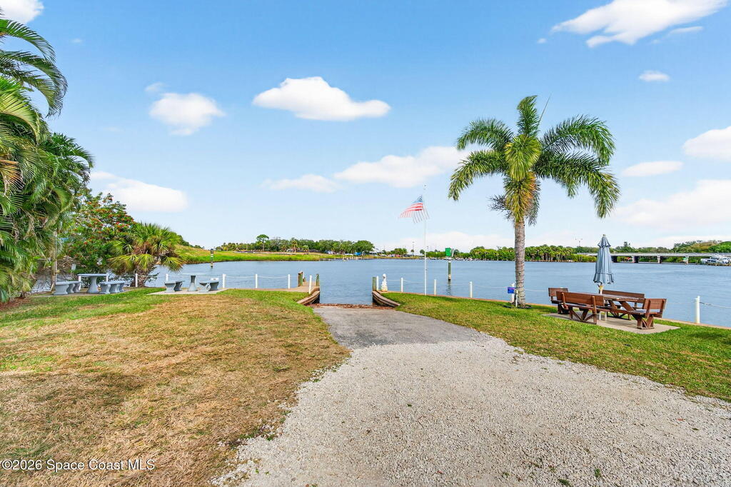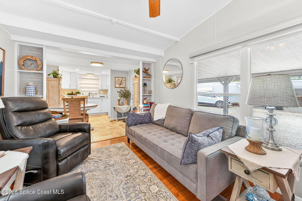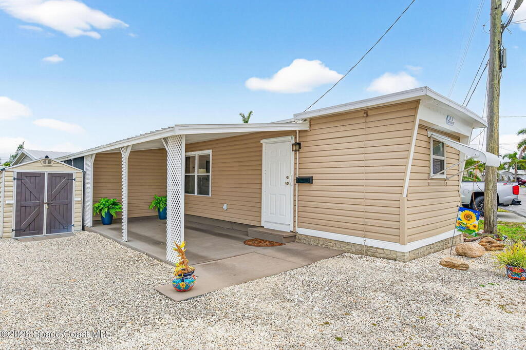 Welcome to this inviting and affordable 1 bed / 1 bath home located in desirable Palm Bay Estates! This home features a canal view from the screened in porch. It provides a functional layout and comfortable living space, perfect as a full-time residence, seasonal retreat or investment property. Upgrades include new vinyl siding, windows, tankless water heater, stackable washer / dryer, new kitchen appliances, quartz countertops, updated backsplash, LED lighting, new window treatments, plumbing, electrical system and breaker box. A beautiful new vanity, shower, and lighting add ambiance to the bathroom. The ac system has also been completely refurbished. Roof membrane is only 2 years old. Outside, enjoy a low-maintenance yard and peaceful surroundings. Ample parking includes an attached carport. Utility shed for additional storage. This 55+ community features a heated pool, clubhouse, picnic area, dog park, community boat ramp and access to Turkey Creek and the Indian River!