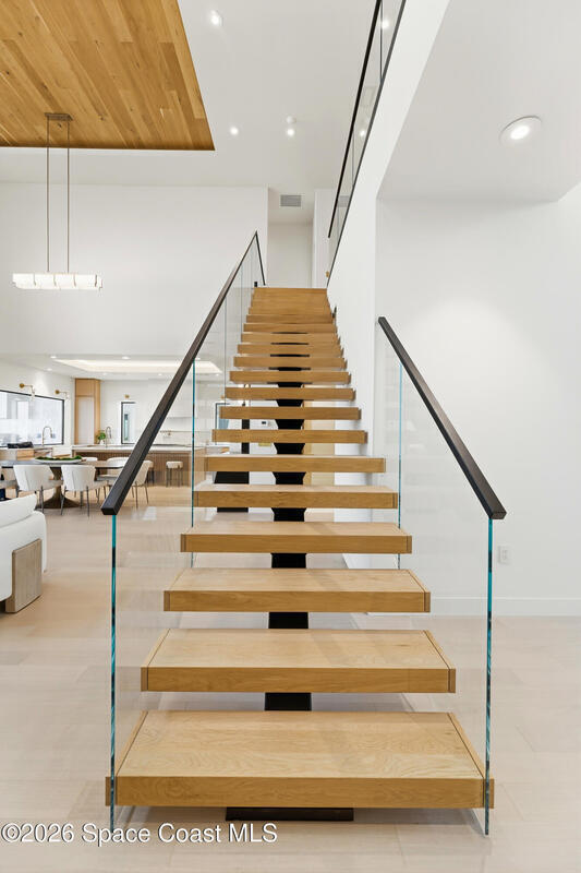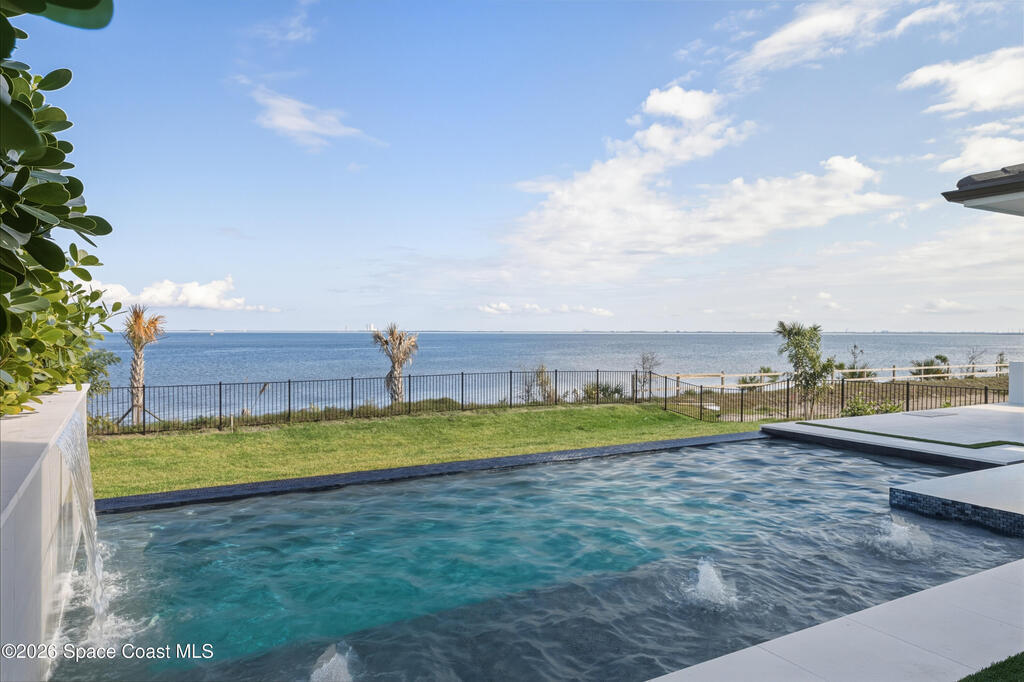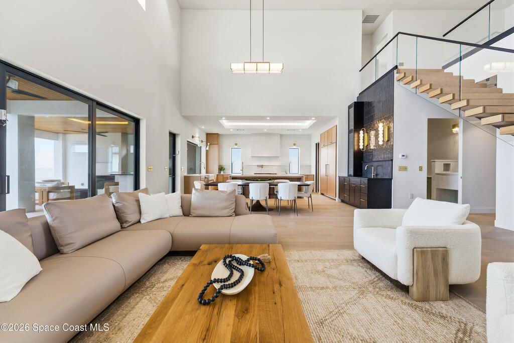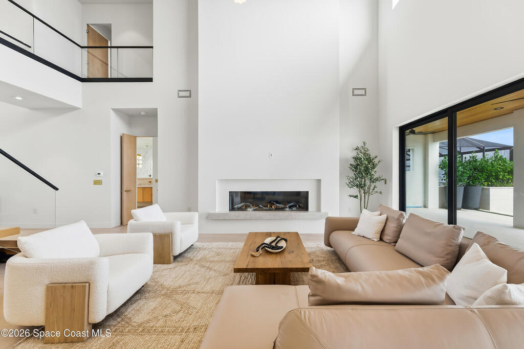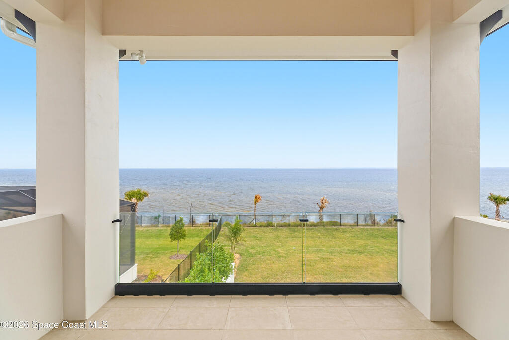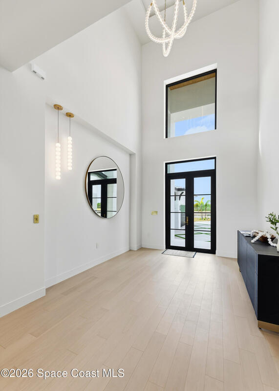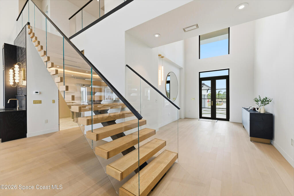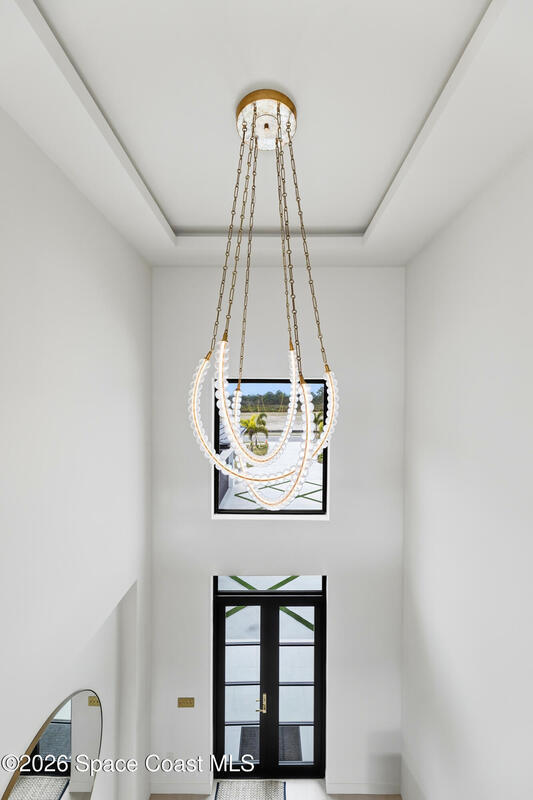 Experience waterfront living in this newly custom-built luxury home, perfectly positioned along the Intracoastal within the premier gated community of The Shores at Tranquility. Set on .45 acres with 69+ feet of direct waterfront, this 4-bedroom, 4-bath residence offers an oversized bonus room, a 4-car garage and is thoughtfully designed for both everyday comfort and elegant entertaining. A beautiful double-door entry welcomes you into 23-foot ceilings and 3-5 mile waterfront views showcased through oversized sliding glass doors, creating an unforgettable first impression with front-row views of Kennedy Space Center rocket launches, abundant wildlife, and breathtaking sunrises from the comfort of home.The heart of this home is a chef's kitchen featuring premium Monogram appliances, a 48-inch gas range with double ovens, six burners, and a griddle, quartz countertops with waterfall edges,