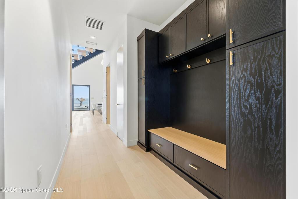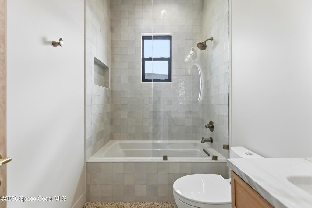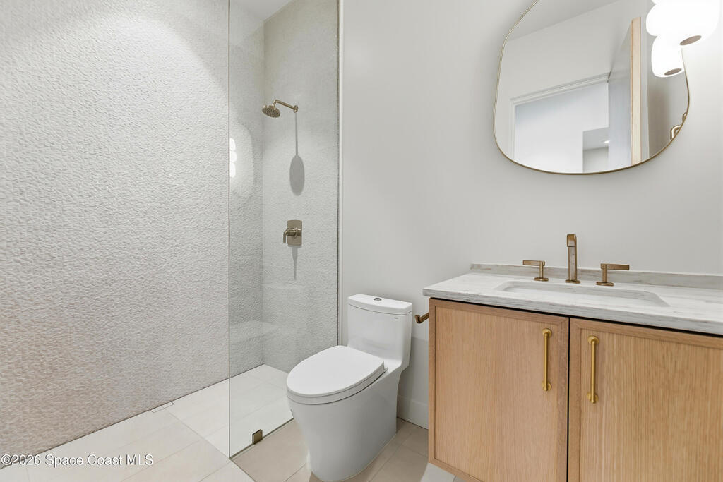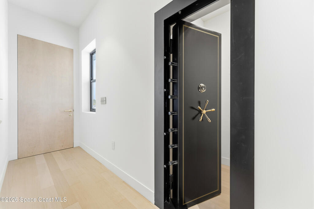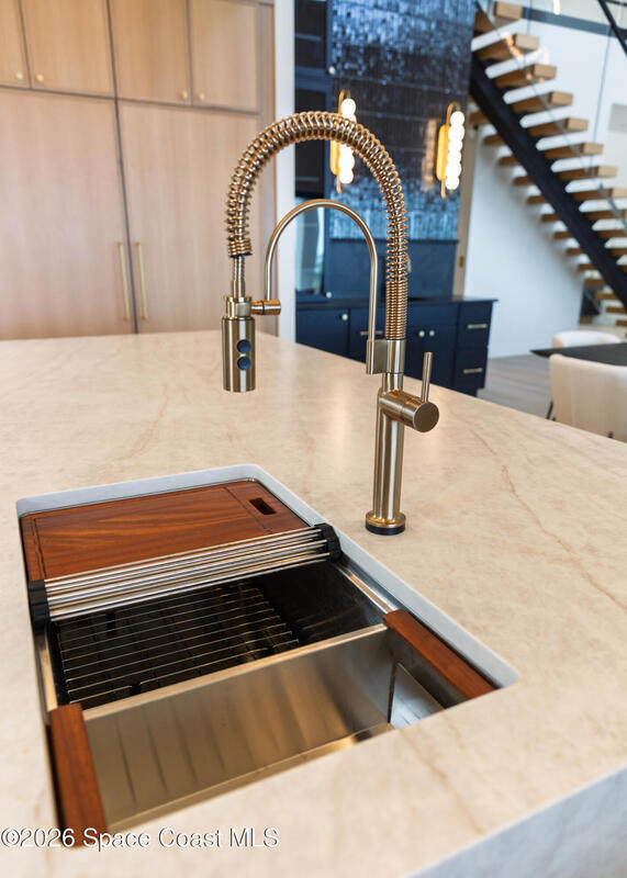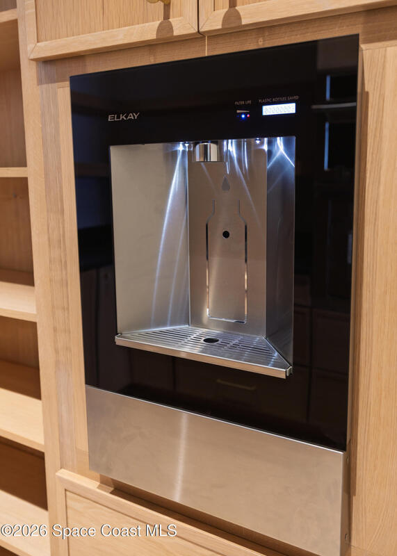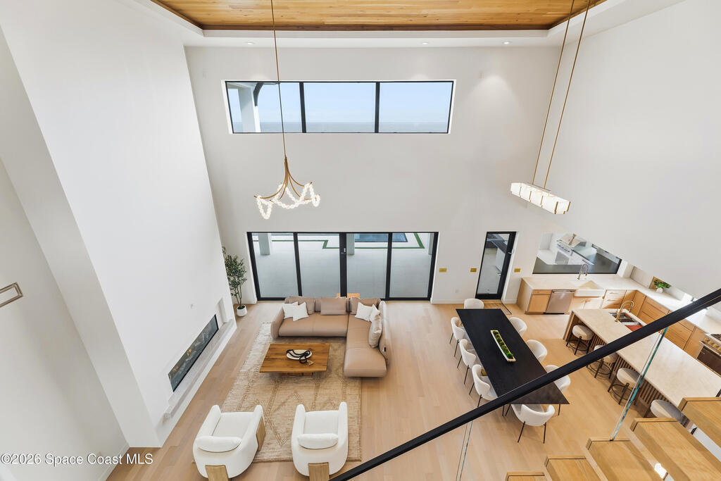 Experience waterfront living in this newly custom-built luxury home, perfectly positioned along the Intracoastal within the premier gated community of The Shores at Tranquility. Set on .45 acres with 69+ feet of direct waterfront, this 4-bedroom, 4-bath residence offers an oversized bonus room, a 4-car garage and is thoughtfully designed for both everyday comfort and elegant entertaining. A beautiful double-door entry welcomes you into 23-foot ceilings and 3-5 mile waterfront views showcased through oversized sliding glass doors, creating an unforgettable first impression with front-row views of Kennedy Space Center rocket launches, abundant wildlife, and breathtaking sunrises from the comfort of home.The heart of this home is a chef's kitchen featuring premium Monogram appliances, a 48-inch gas range with double ovens, six burners, and a griddle, quartz countertops with waterfall edges,