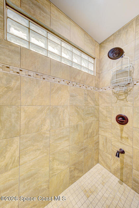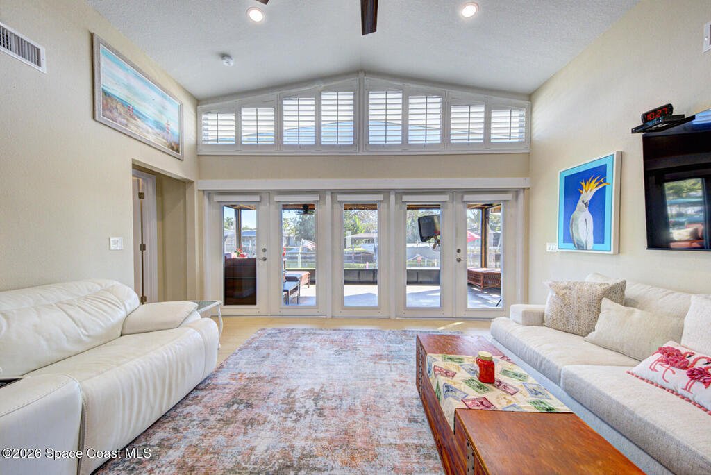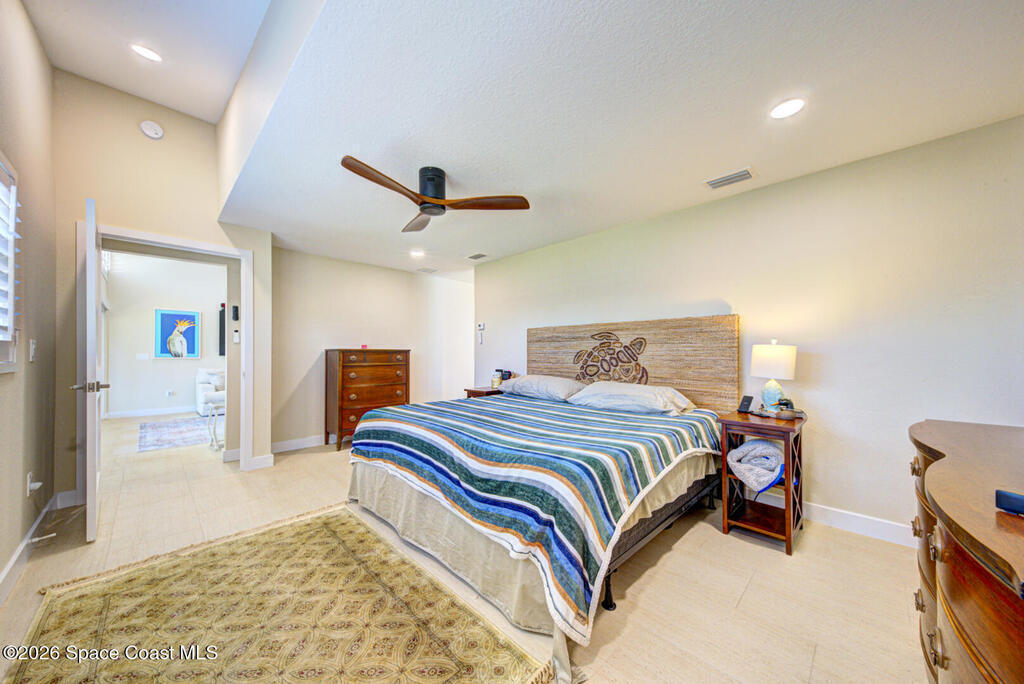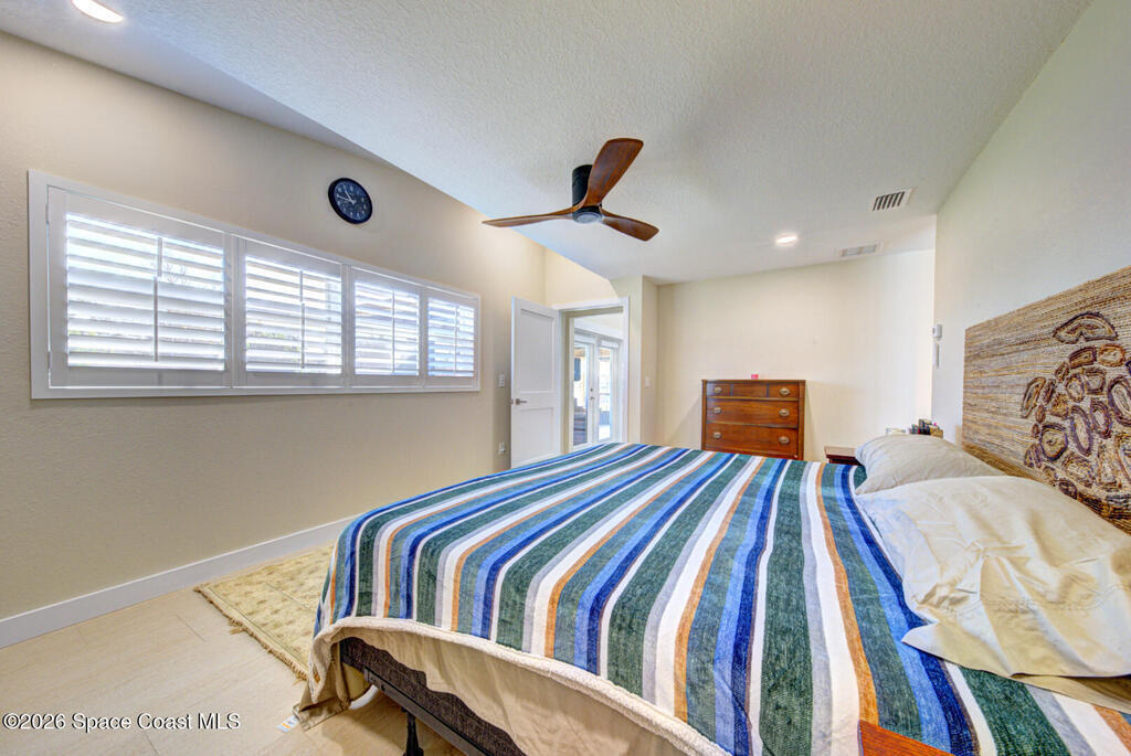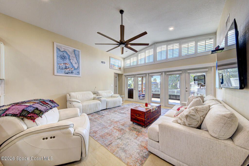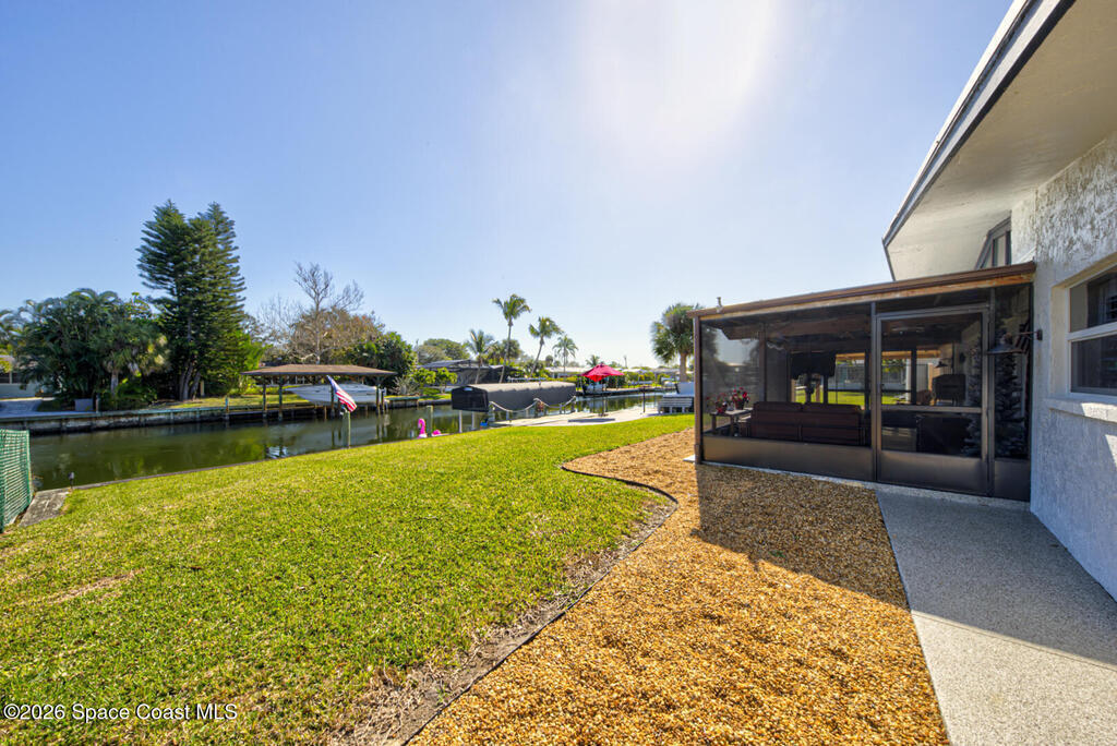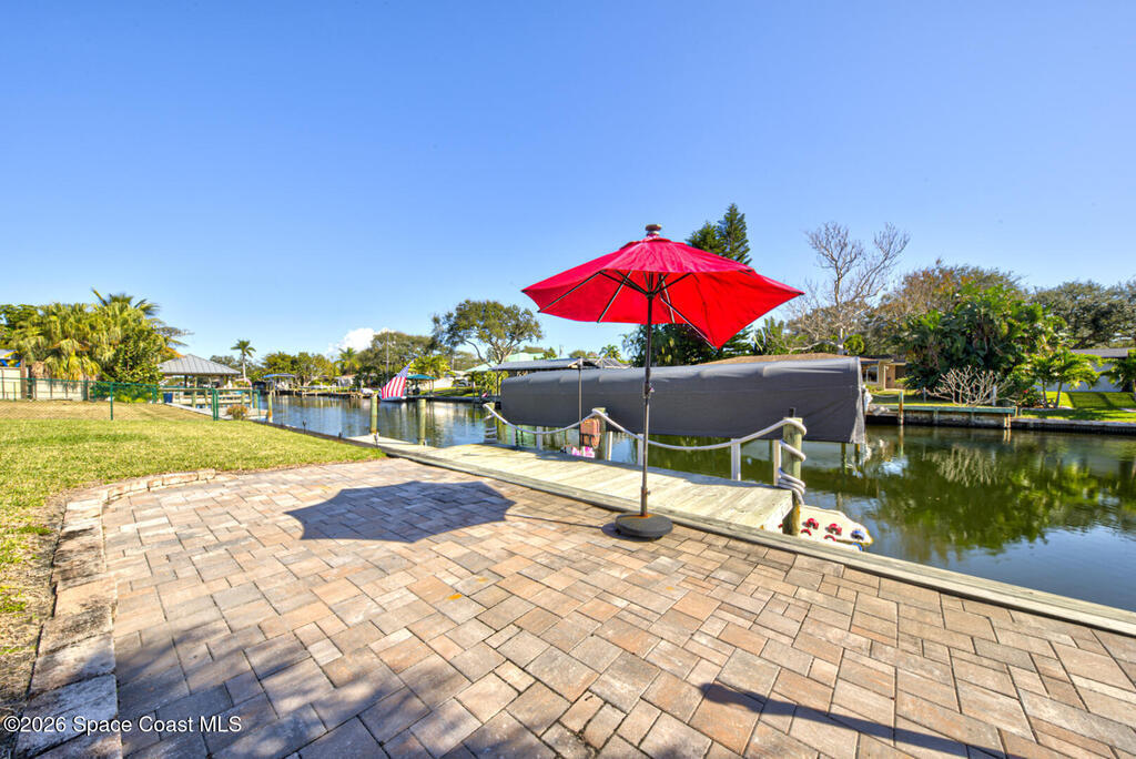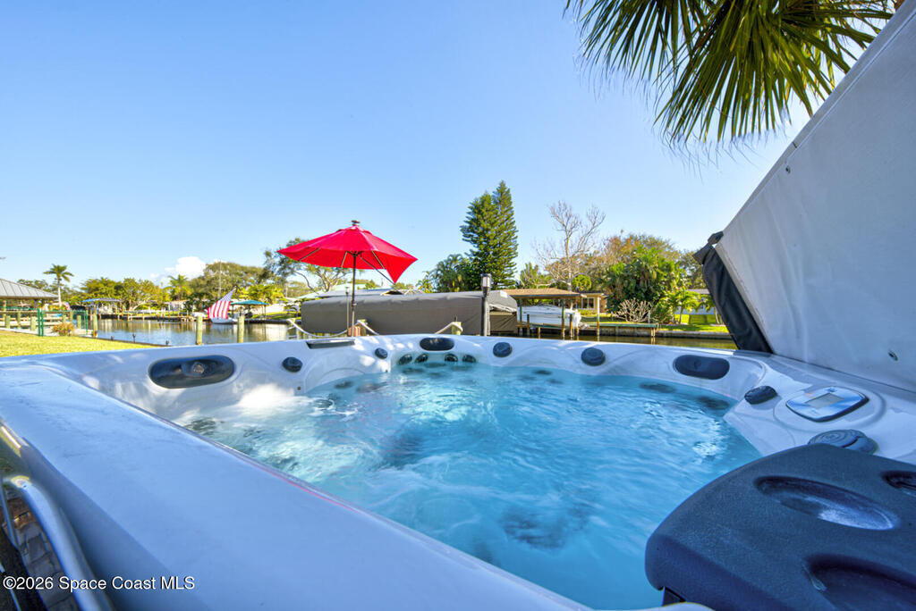 Luxury canal-front living in desirable Surfside neighborhood of Cocoa Beach--NO HOA. This beautifully designed 4-bedroom, 3-bath home features double-primary suites and direct access to a waterfront lifestyle with private floating dock. The open floor plan is filled with natural light and seamless indoor-outdoor flow. The kitchen, dining, and great room connect effortlessly, offering tranquil water views. The kitchen boasts SS appliances, abundant cabinetry, ample counter space, and recessed lighting. Elegant tile flooring imported from Ukraine runs throughout, complemented by plantation shutters and hurricane-rated windows, doors, and garage door. Primary suite provides a retreat with a spa-like bath, double-sink vanity, shower, and soaker tub. Highlights include epoxy-coated driveway and garage with extensive storage, solar panels producing approx. 3,000 kWh/month. A fenced backyard, screened patio, pergola, garden arbor, hot tub are perfect for boating and year-round enjoyment.