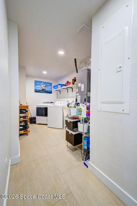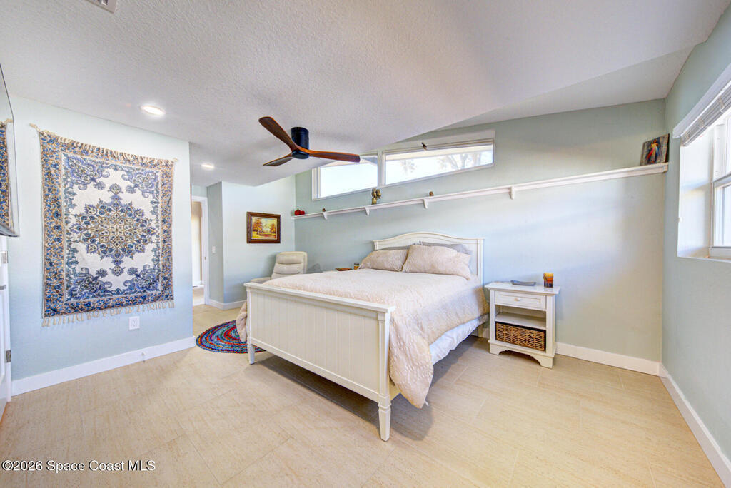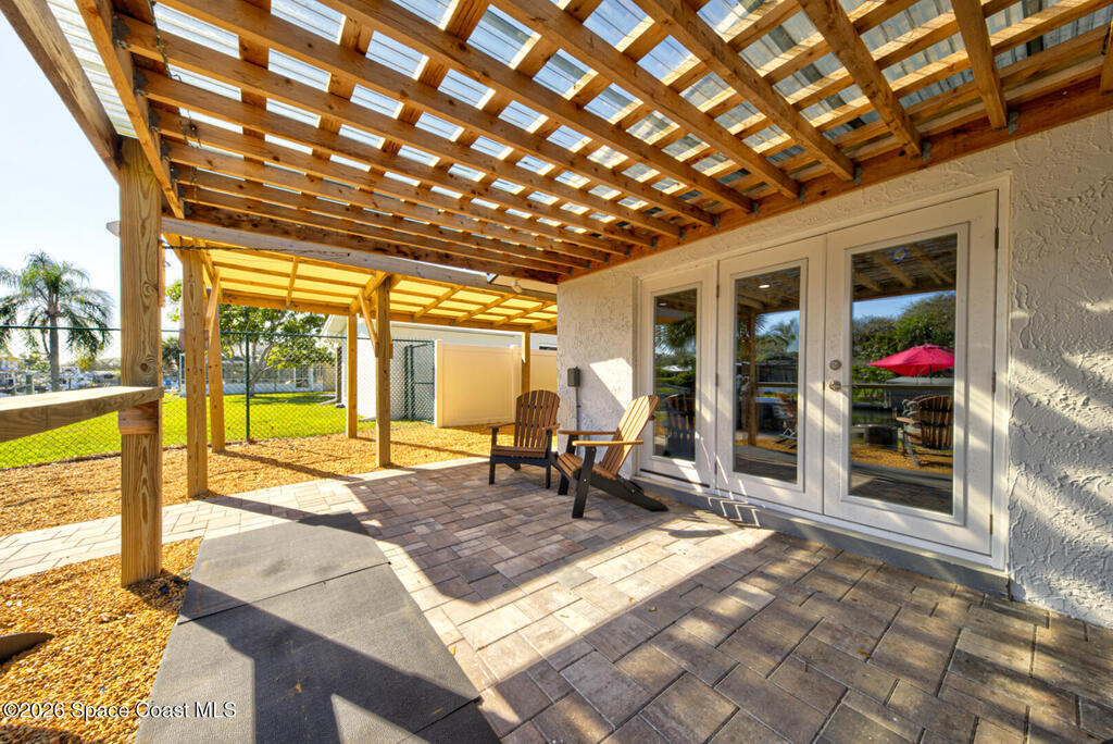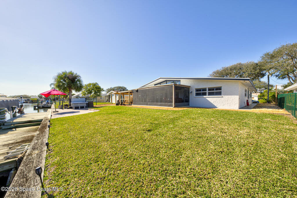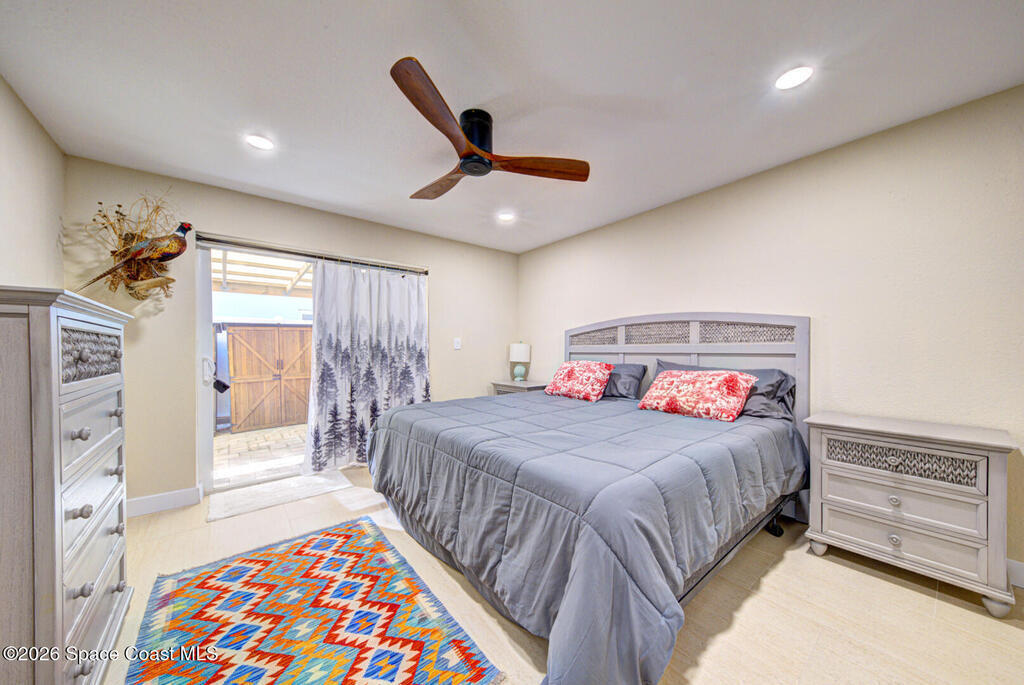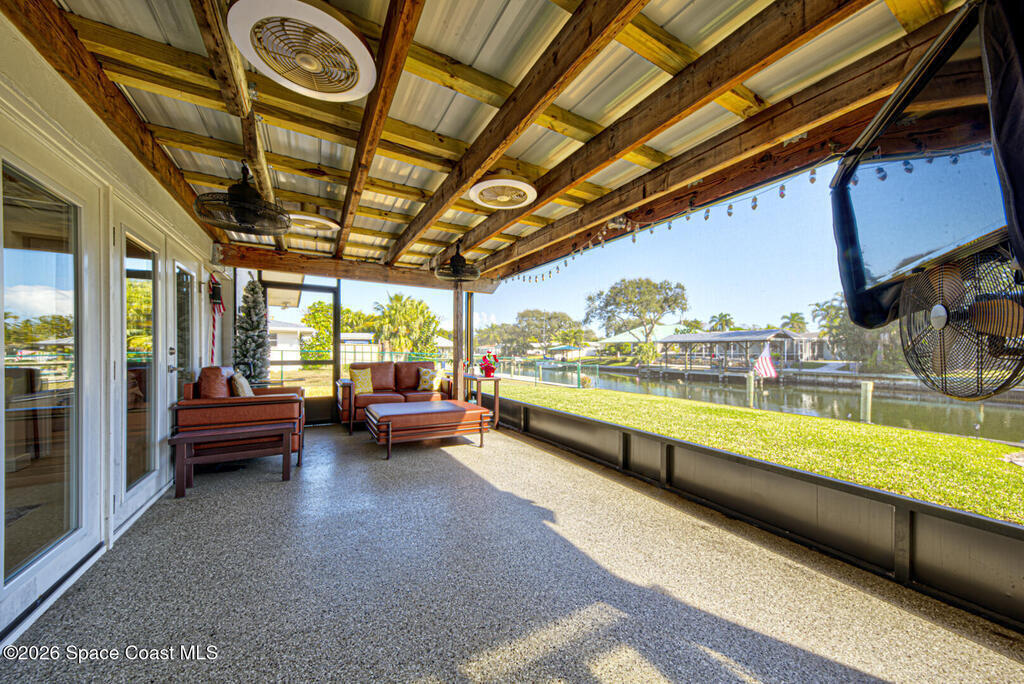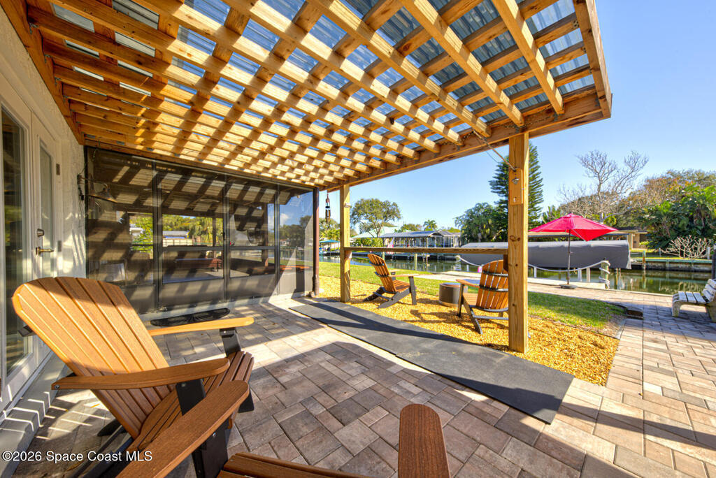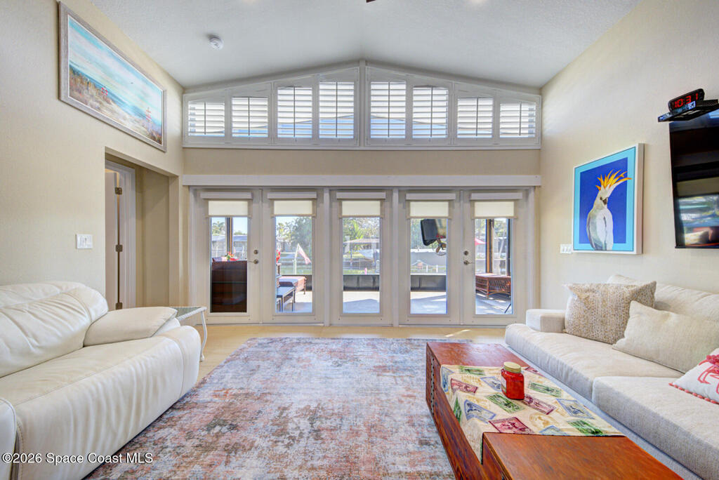 Luxury canal-front living in desirable Surfside neighborhood of Cocoa Beach--NO HOA. This beautifully designed 4-bedroom, 3-bath home features double-primary suites and direct access to a waterfront lifestyle with private floating dock. The open floor plan is filled with natural light and seamless indoor-outdoor flow. The kitchen, dining, and great room connect effortlessly, offering tranquil water views. The kitchen boasts SS appliances, abundant cabinetry, ample counter space, and recessed lighting. Elegant tile flooring imported from Ukraine runs throughout, complemented by plantation shutters and hurricane-rated windows, doors, and garage door. Primary suite provides a retreat with a spa-like bath, double-sink vanity, shower, and soaker tub. Highlights include epoxy-coated driveway and garage with extensive storage, solar panels producing approx. 3,000 kWh/month. A fenced backyard, screened patio, pergola, garden arbor, hot tub are perfect for boating and year-round enjoyment.