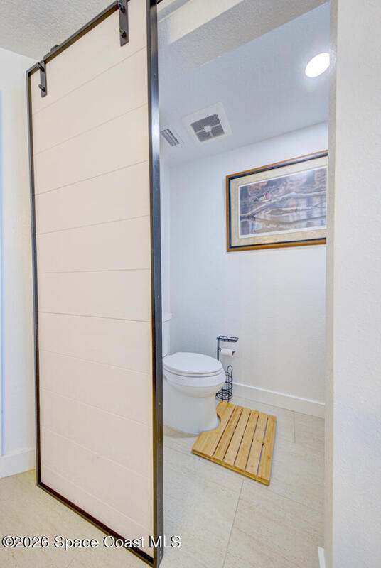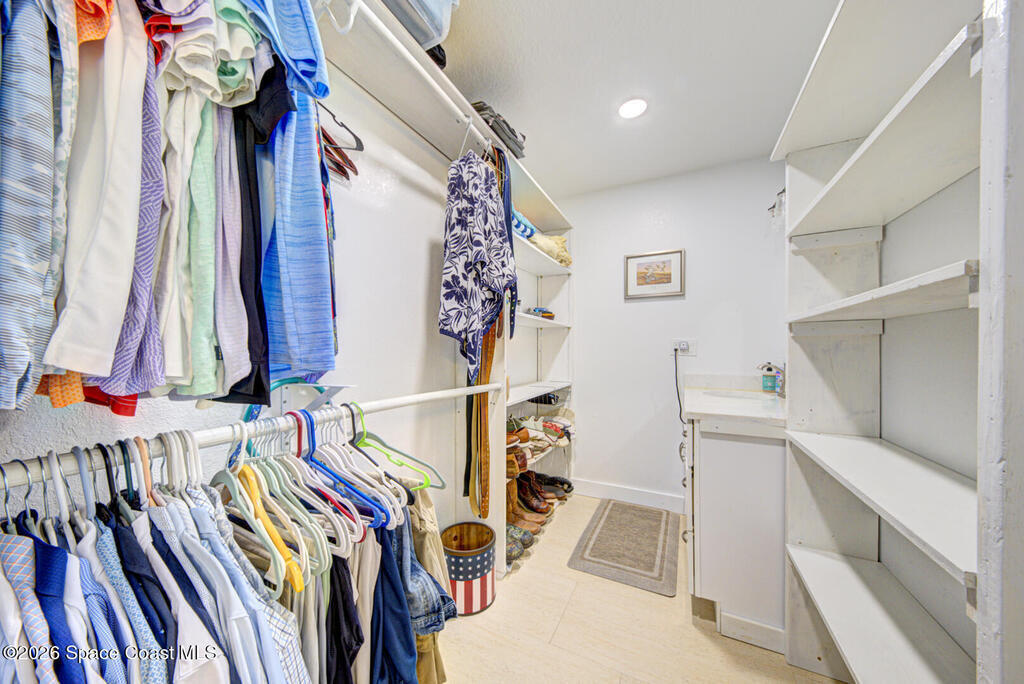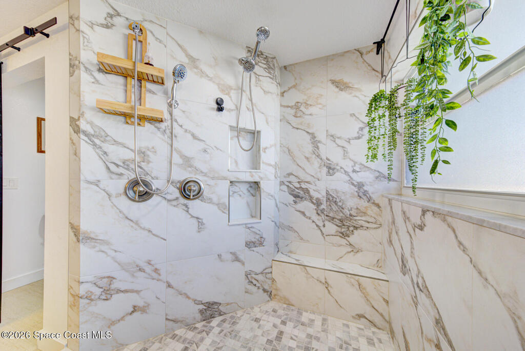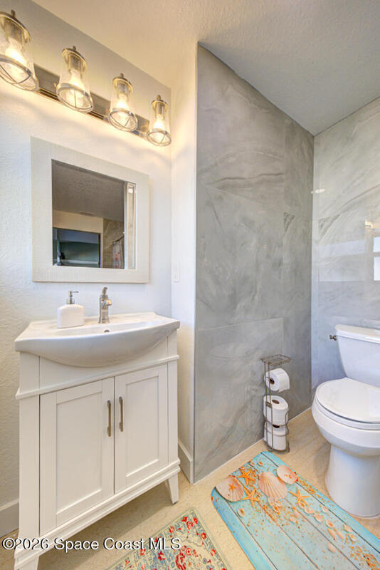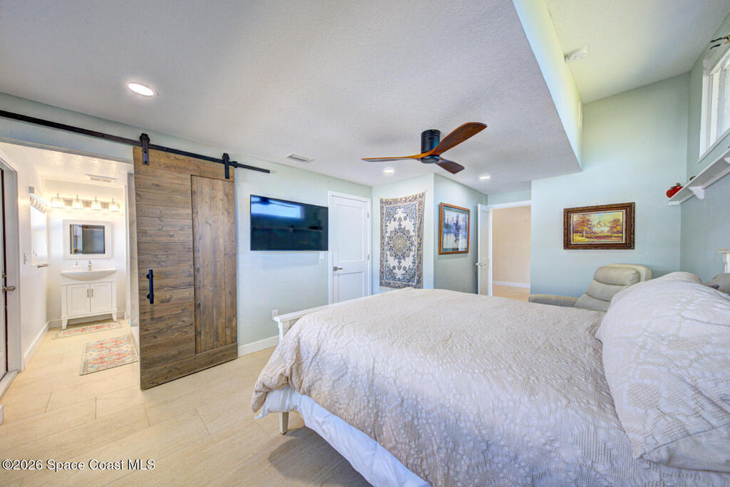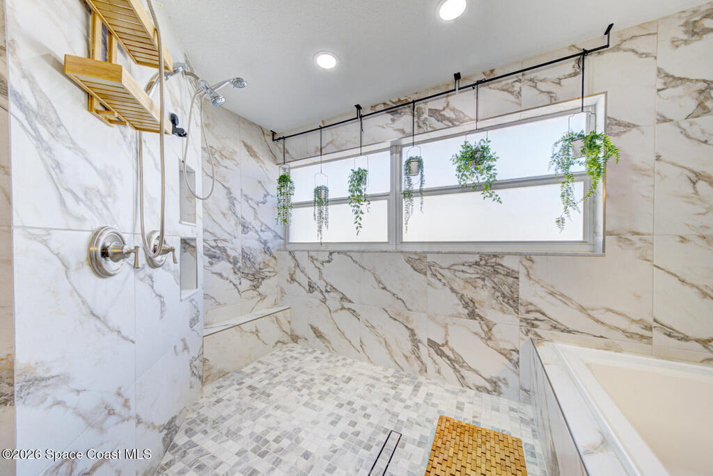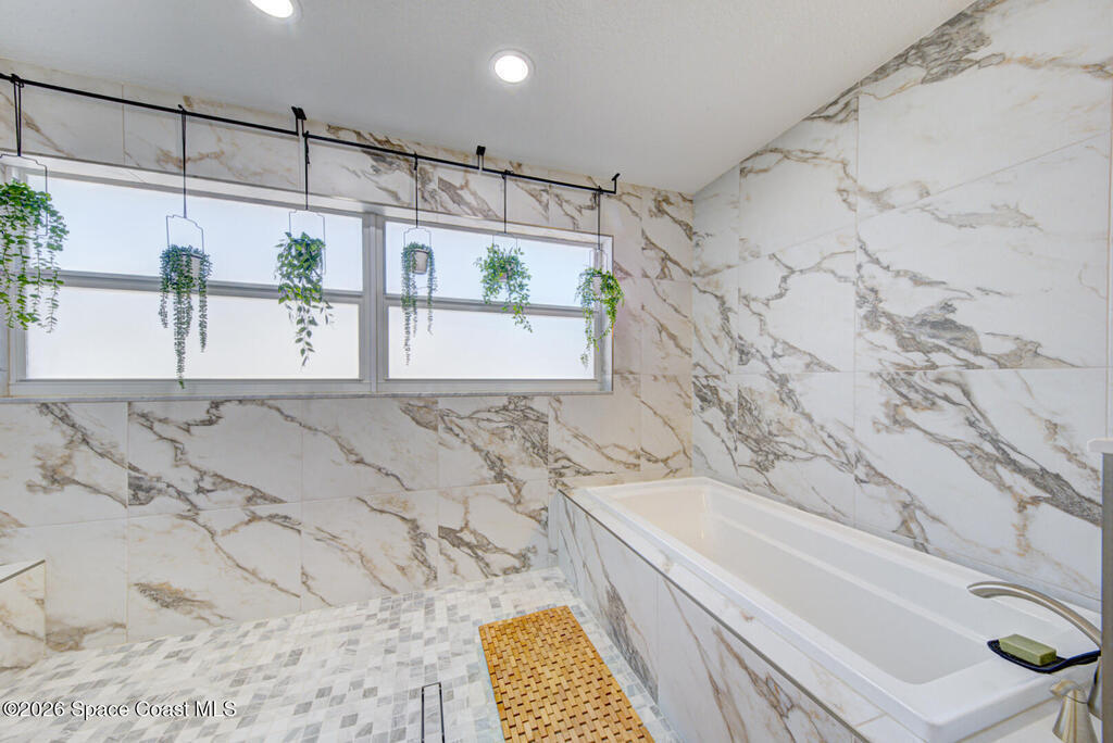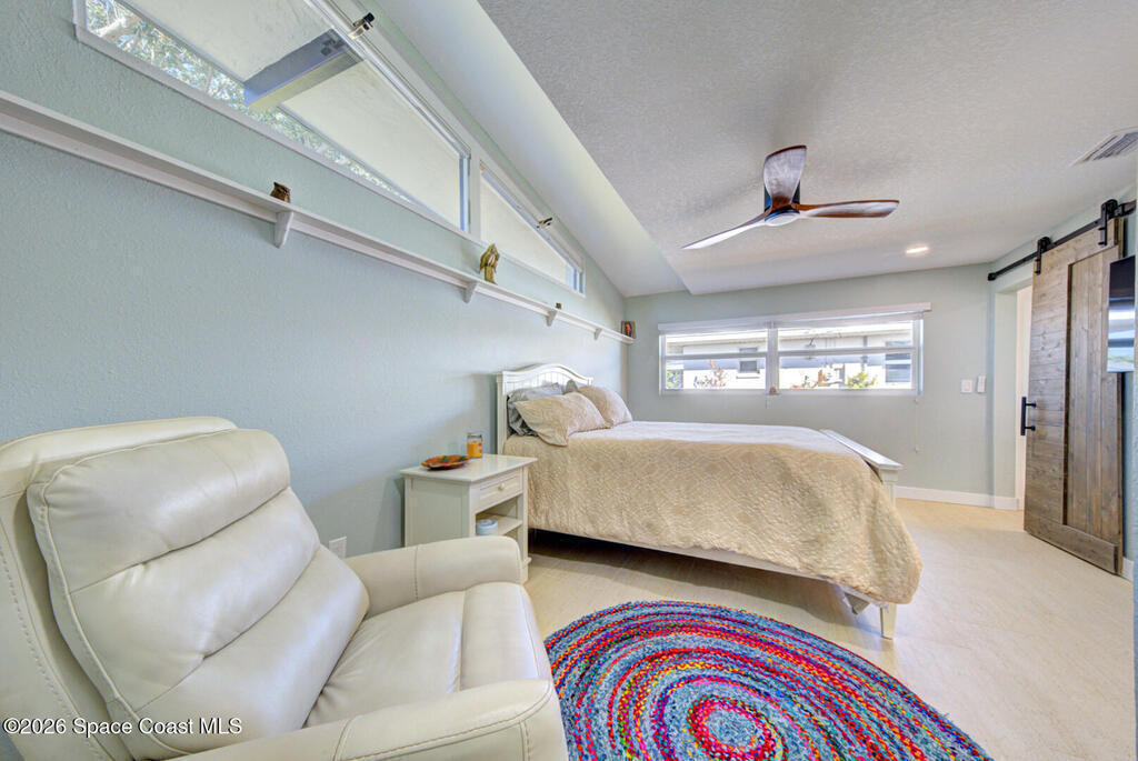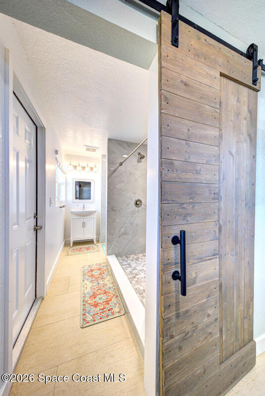 Luxury canal-front living in desirable Surfside neighborhood of Cocoa Beach--NO HOA. This beautifully designed 4-bedroom, 3-bath home features double-primary suites and direct access to a waterfront lifestyle with private floating dock. The open floor plan is filled with natural light and seamless indoor-outdoor flow. The kitchen, dining, and great room connect effortlessly, offering tranquil water views. The kitchen boasts SS appliances, abundant cabinetry, ample counter space, and recessed lighting. Elegant tile flooring imported from Ukraine runs throughout, complemented by plantation shutters and hurricane-rated windows, doors, and garage door. Primary suite provides a retreat with a spa-like bath, double-sink vanity, shower, and soaker tub. Highlights include epoxy-coated driveway and garage with extensive storage, solar panels producing approx. 3,000 kWh/month. A fenced backyard, screened patio, pergola, garden arbor, hot tub are perfect for boating and year-round enjoyment.