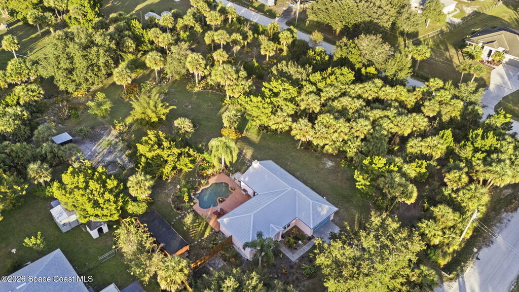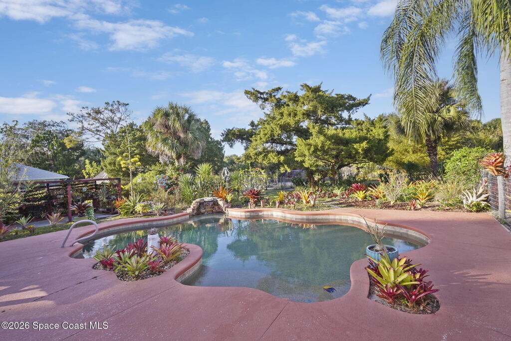 Garden, raise animals, or relax poolside. This unique two-acre retreat has it all. Sunlight pours through large windows, highlighting an open, easy floor plan with seamless luxury vinyl throughout. The spacious primary suite features a walk-in closet and a beautifully updated bath. The remodeled kitchen shines with newer appliances, new counters, sink, disposal, and a breakfast bar. French doors lead to a lush, tropical pool oasis with a covered shade house--perfect for lounging or showcasing plant collections. Imagine floating in the pool while watching rocket launches overhead. Enjoy peace of mind with a newer AC and newer appliances. Wander through winding paths on the second acre, complete with benches for wildlife viewing in your own private park. The property boasts fruit trees, gingers, bromeliads, plumeria, native plants, and mature oaks and cedars for shade. A rare, versatile paradise full of possibility. 2018 roof, 2023 AC, PEX water lines, shutters, termite bond.