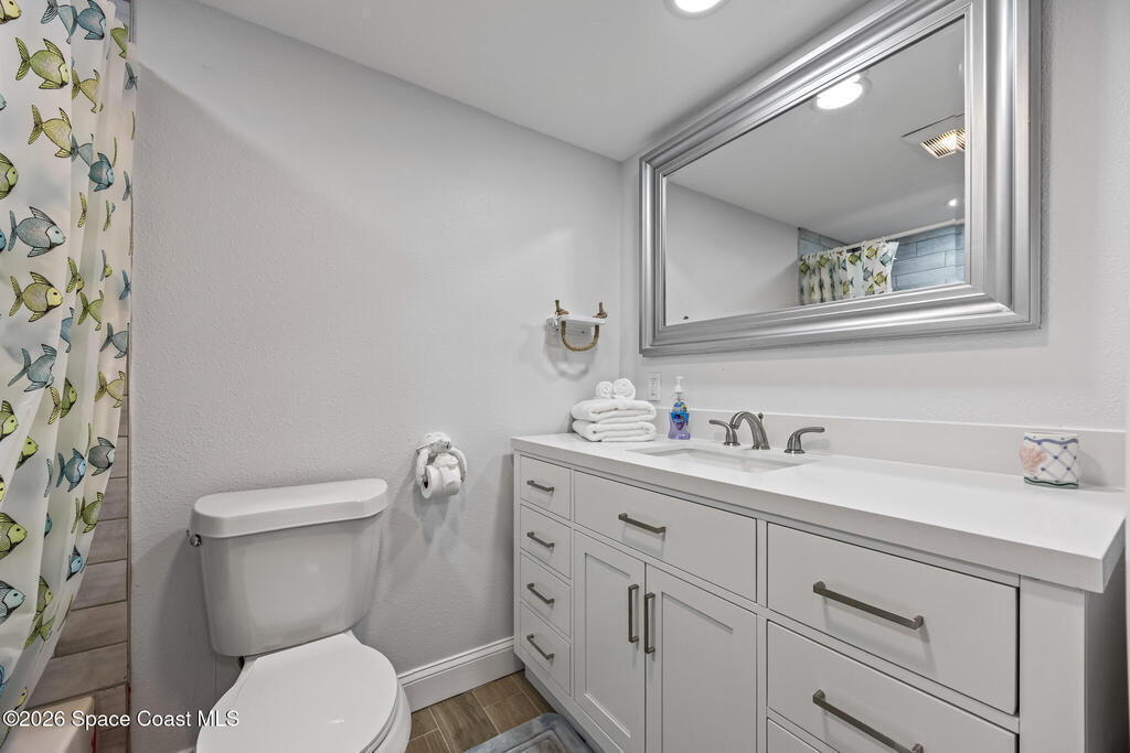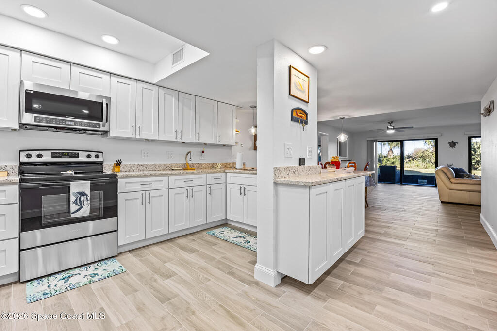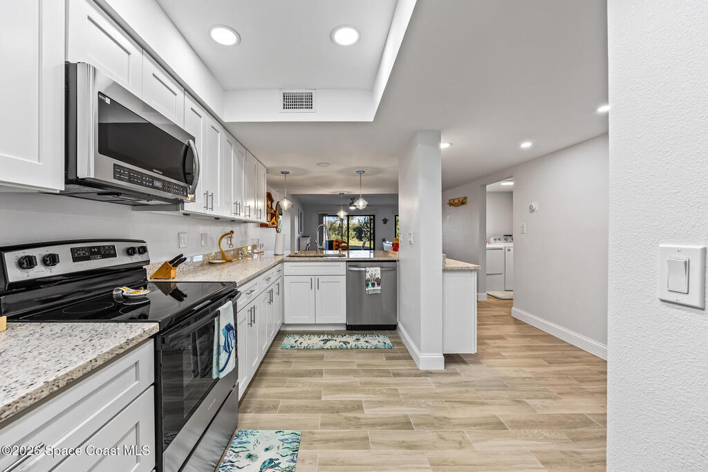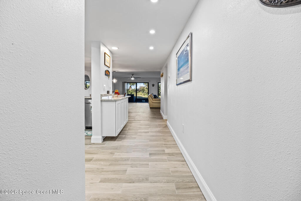 Welcome to this oceanfront, first-floor condo in the heart of Cocoa Beach. Step out from your screened back porch and, in less than a minute, have your toes in the sand. When the HOA cuts back the vegetation it gives you ocean views. They cut it back several times a year. This unit has been completely remodeled from top to bottom, including new plumbing, electrical, hurricane-impact windows, AC duct work, tile flooring, kitchen, and bathrooms. The entire condo has been fully rewired with CAT6 ethernet and coaxial cable, and all interior drywall has been replaced with green board. The condo building's roof was replaced in 2025. This spacious unit offers the perfect blend of comfort, quality, and unbeatable beachfront living. The unit includes a one-car garage. Enjoy resort-style amenities including a pool, fitness center, sauna, pickleball, and tennis courts. Furniture is negotiable. Seller PAID assessment.